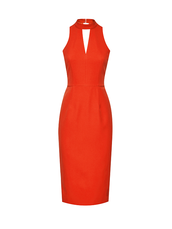 Облегающее платье длины миди. Вырез-американка, отрезная линия талии, шлица. Застегивается на потайную молнию на спине.