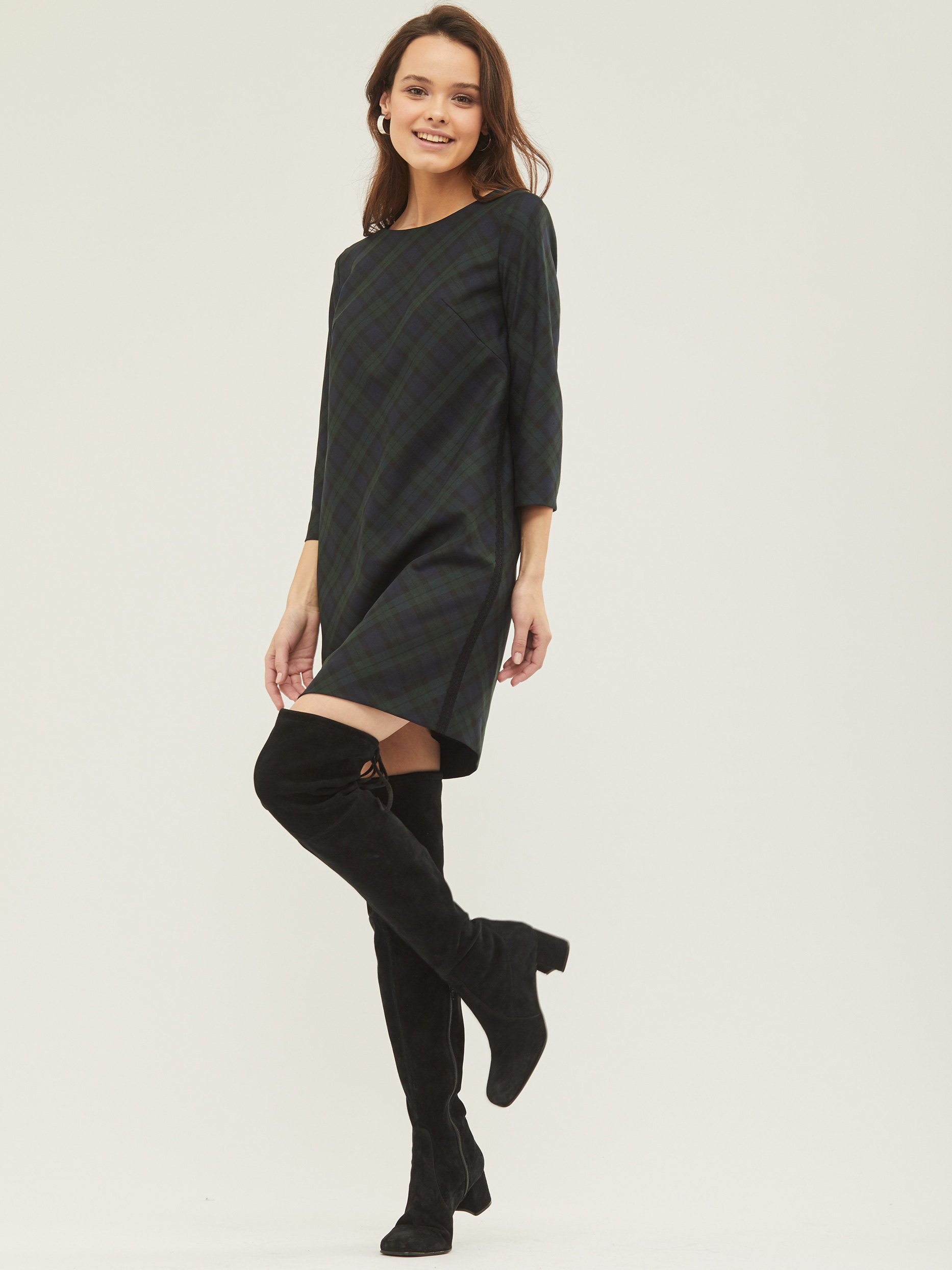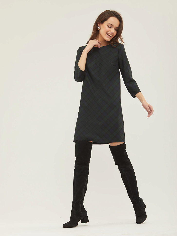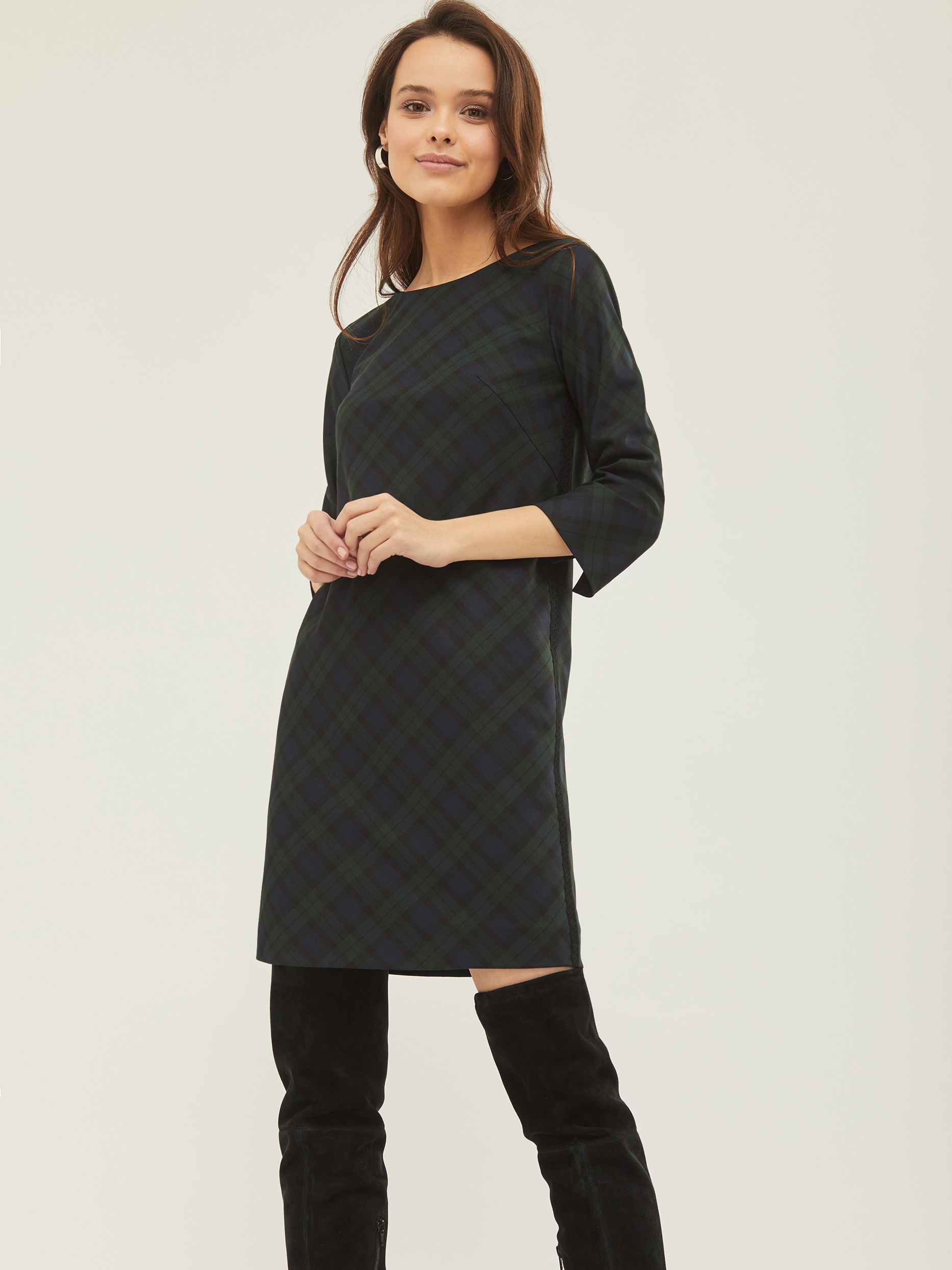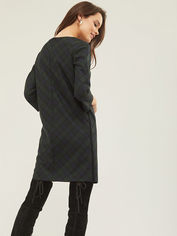 Платье прямого силуэта с геометрическим принтом. Изделие с рукавами 3/4, потайной молнией и круглым вырезом горловины. Платье с контрастными лампасами.