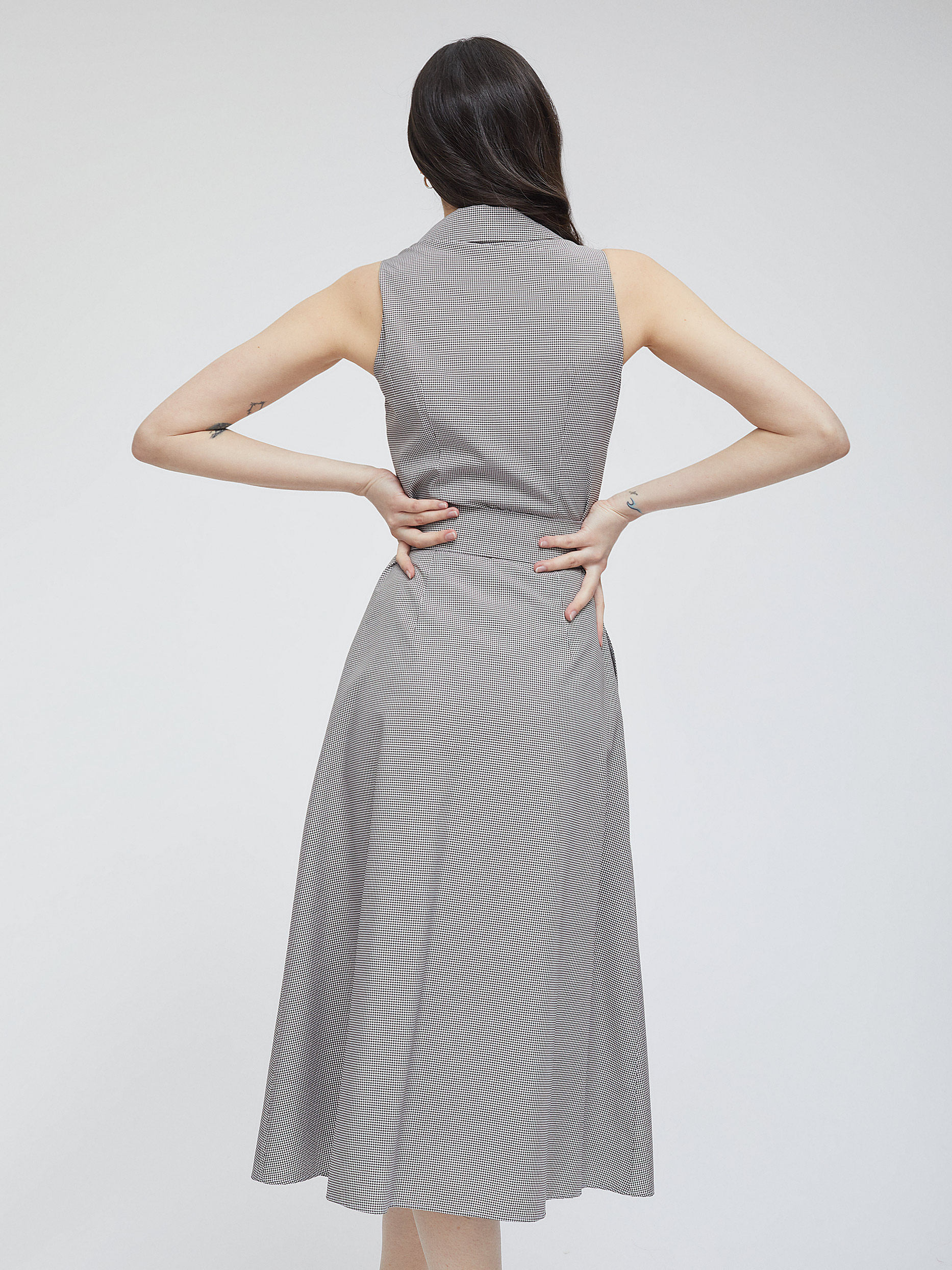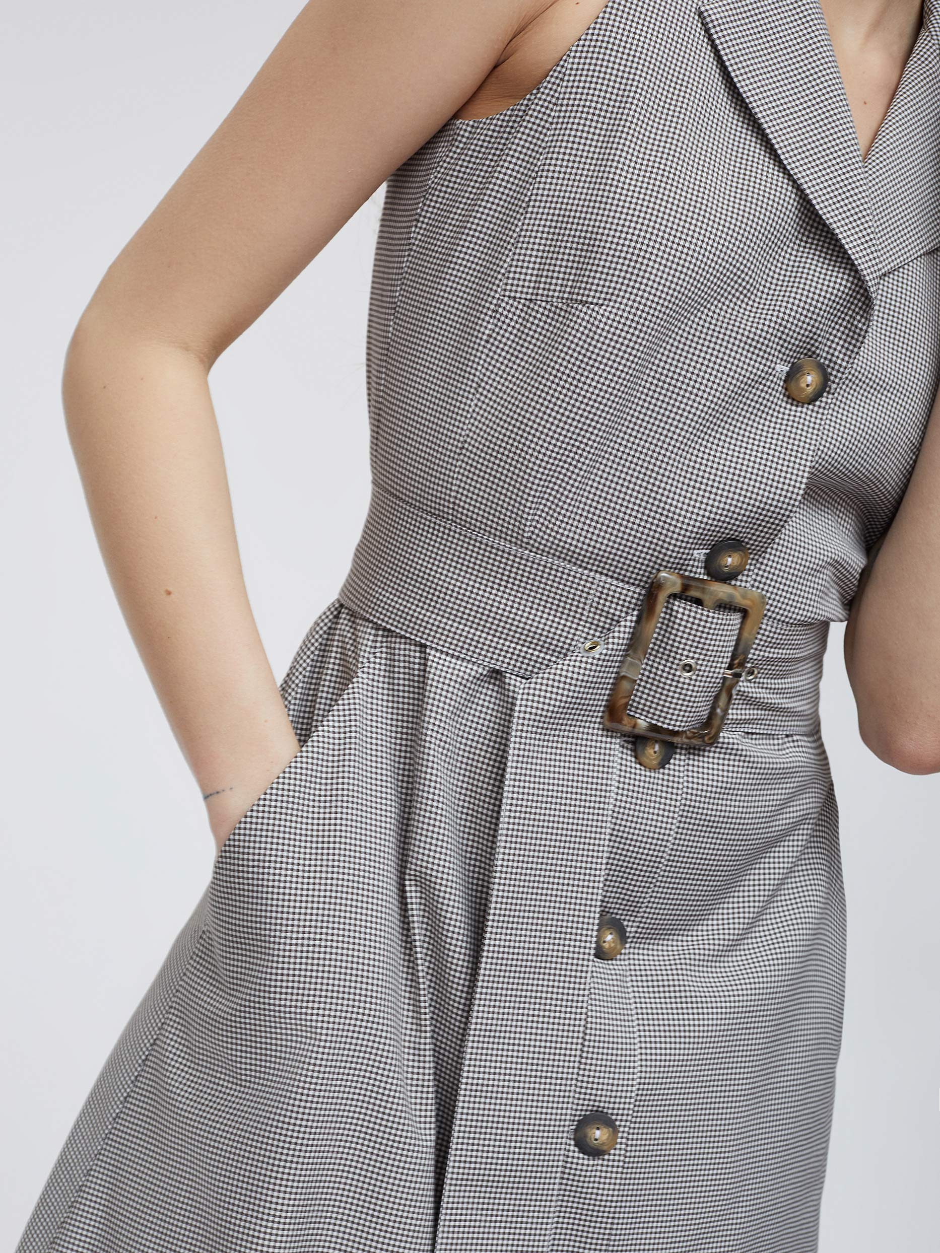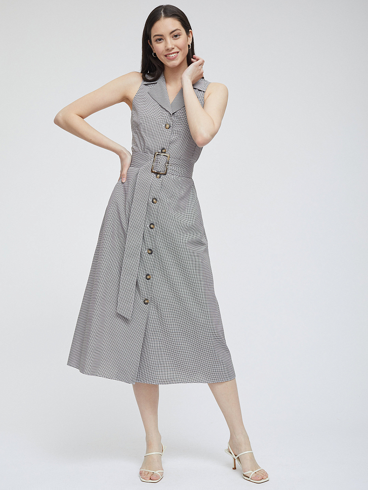Платье в клетку из смесовой вискозы. Приталенный крой, длина миди, отложной воротник, остроконечные лацканы с разрезами, боковые карманы. В комплекте пояс.