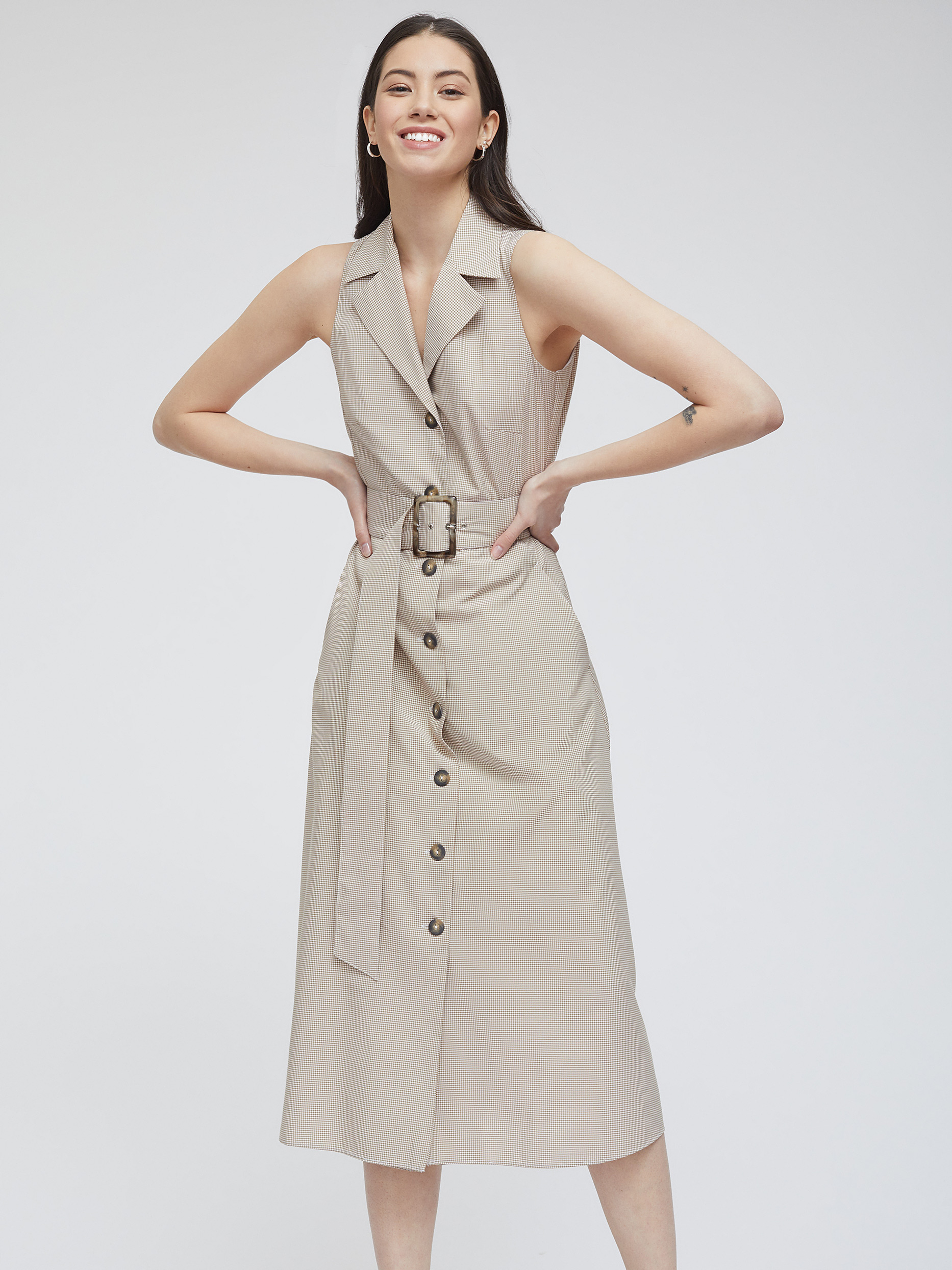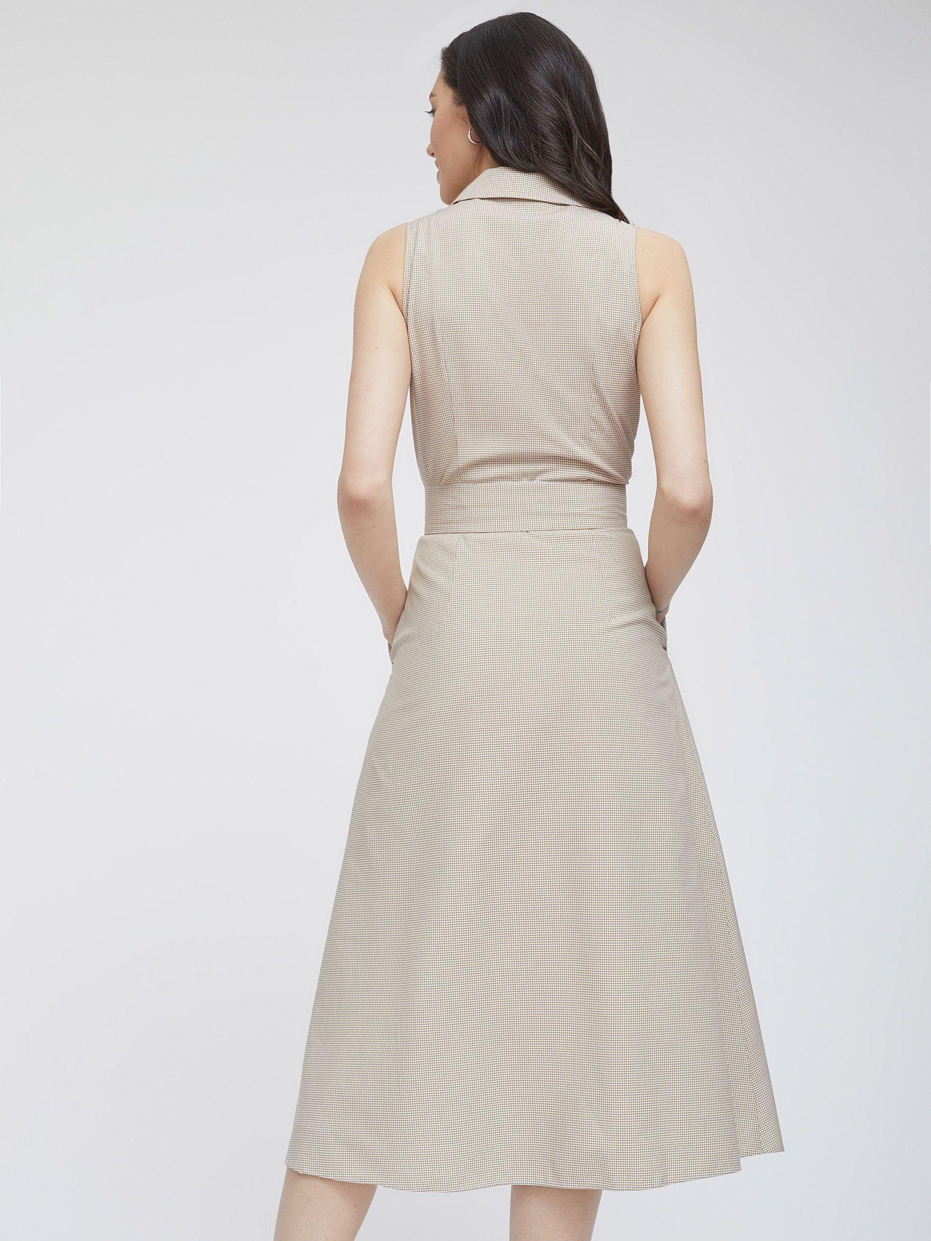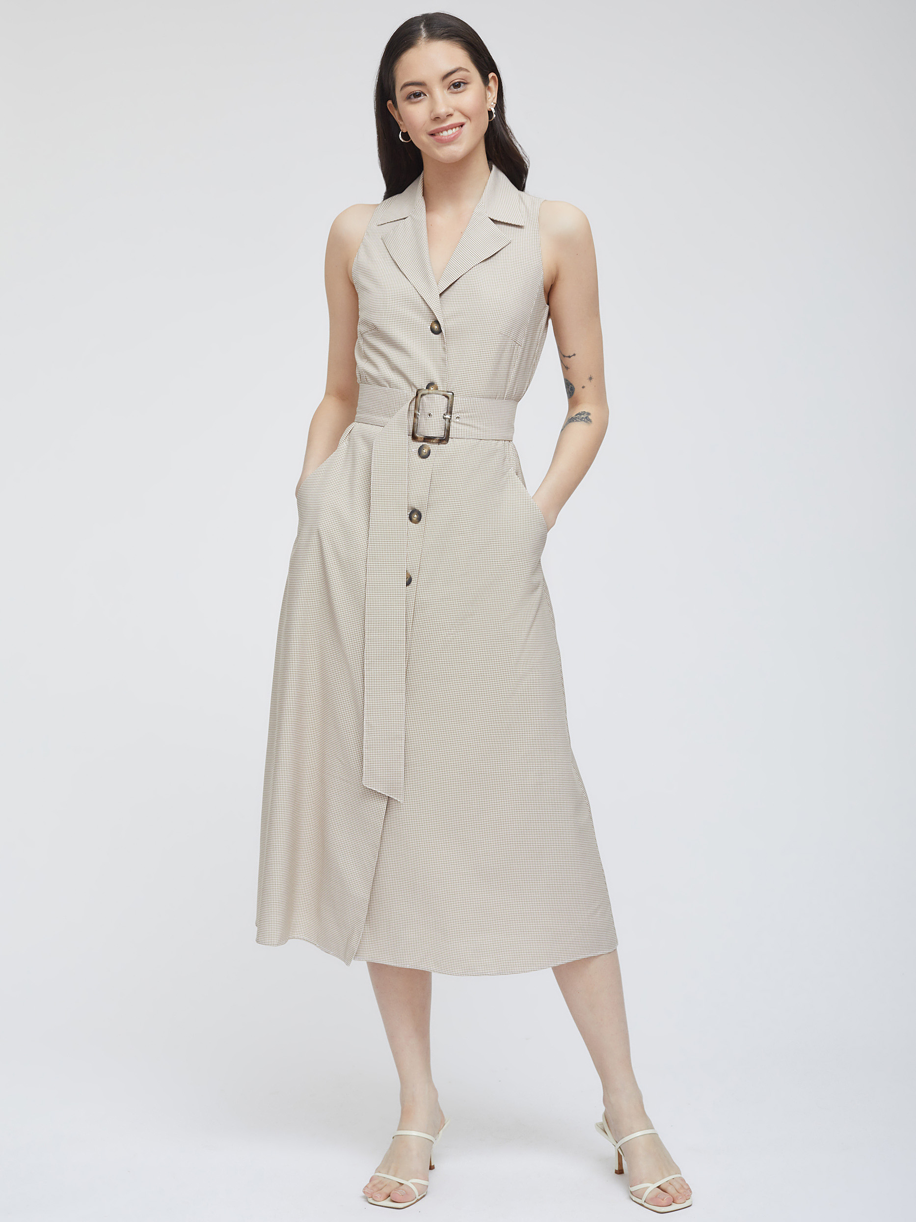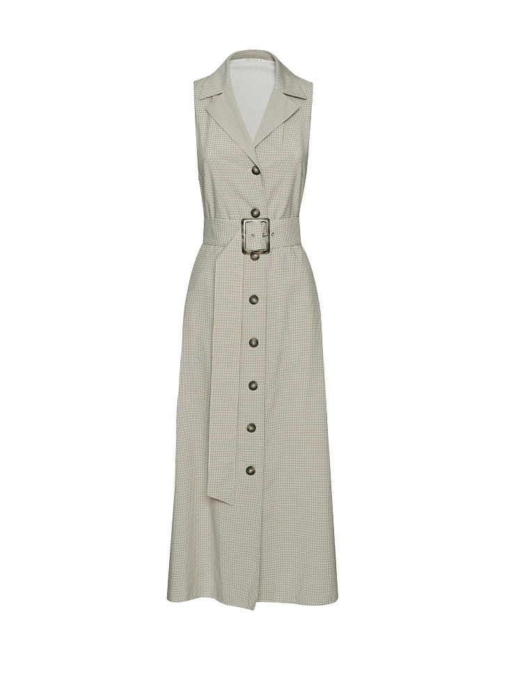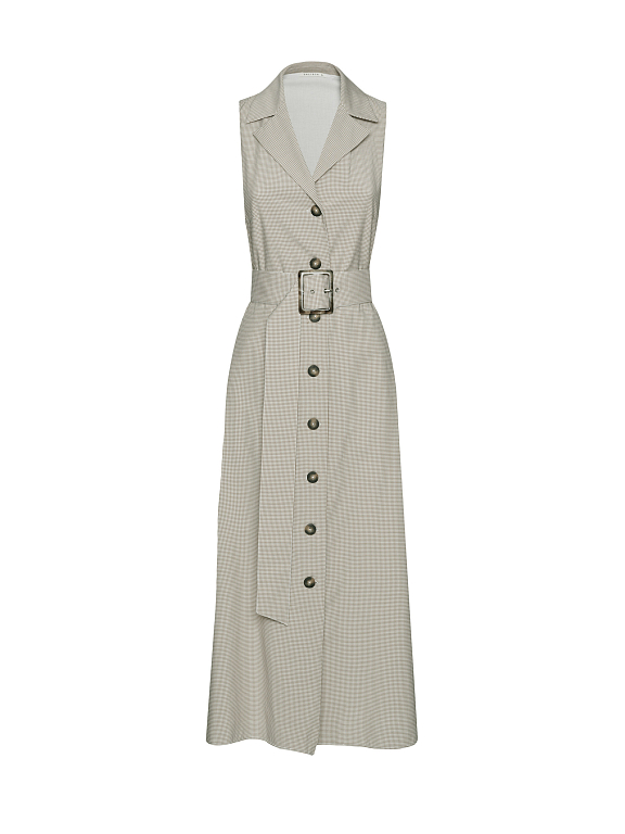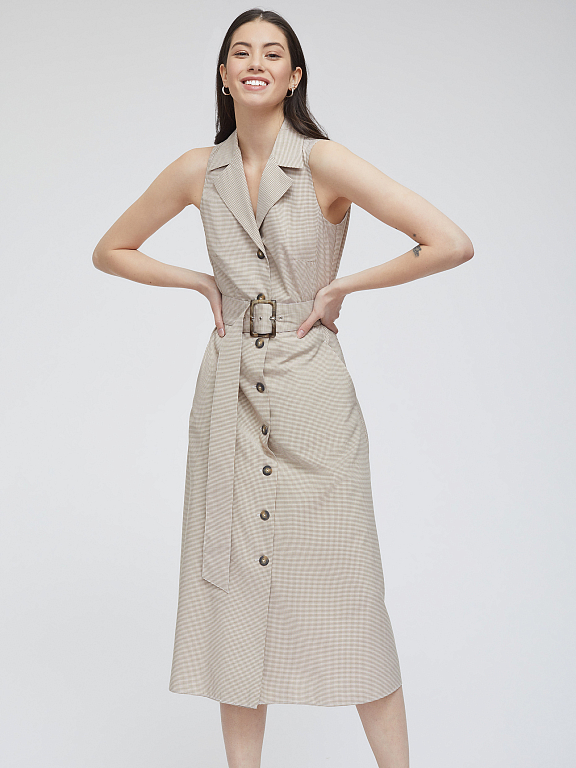 Платье в клетку из смесовой вискозы. Приталенный крой, длина миди, отложной воротник, остроконечные лацканы с разрезами, боковые карманы. В комплекте пояс.