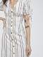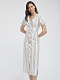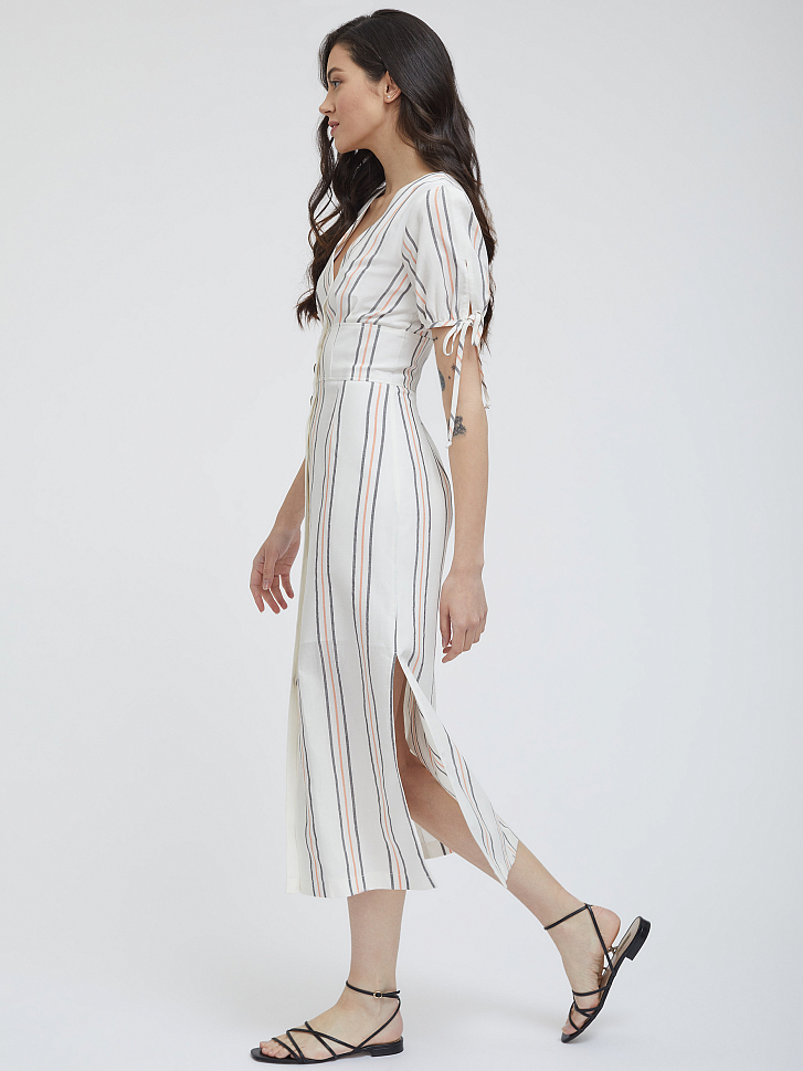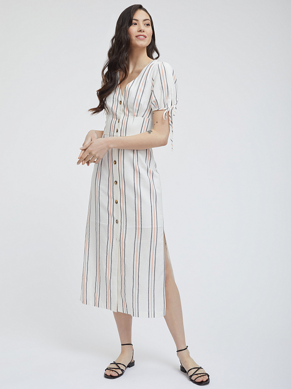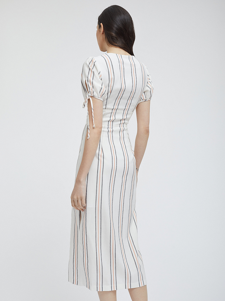Платье в полоску приталенного кроя. Длина миди, V-образный вырез, короткие объемные рукава, широкий втачной пояс, разрезы по бокам нижнего края, подклад.