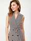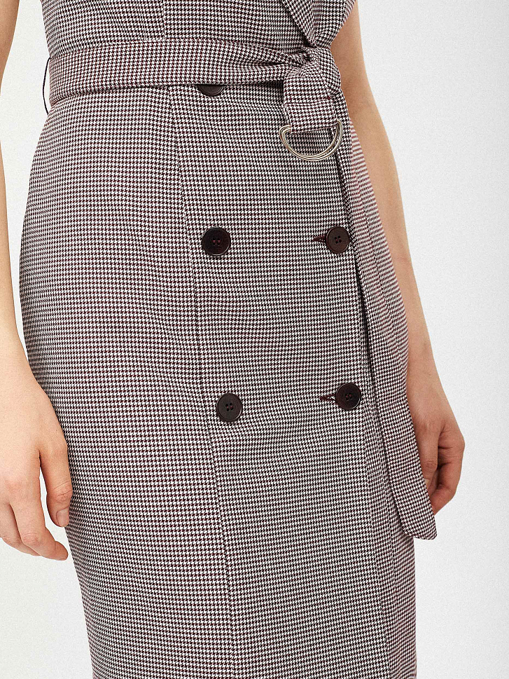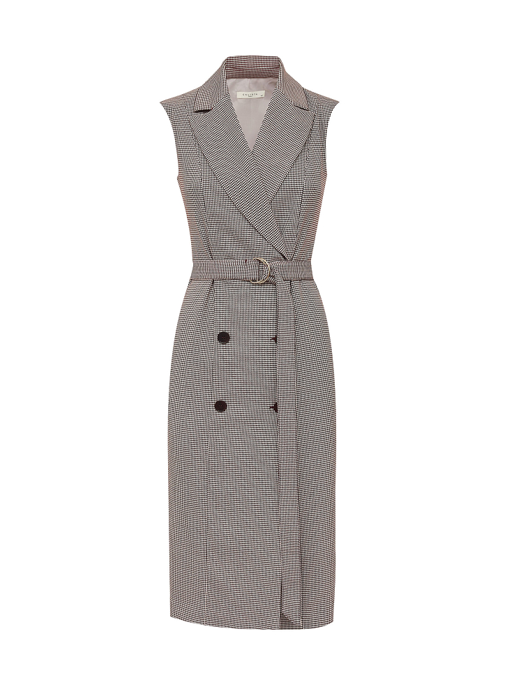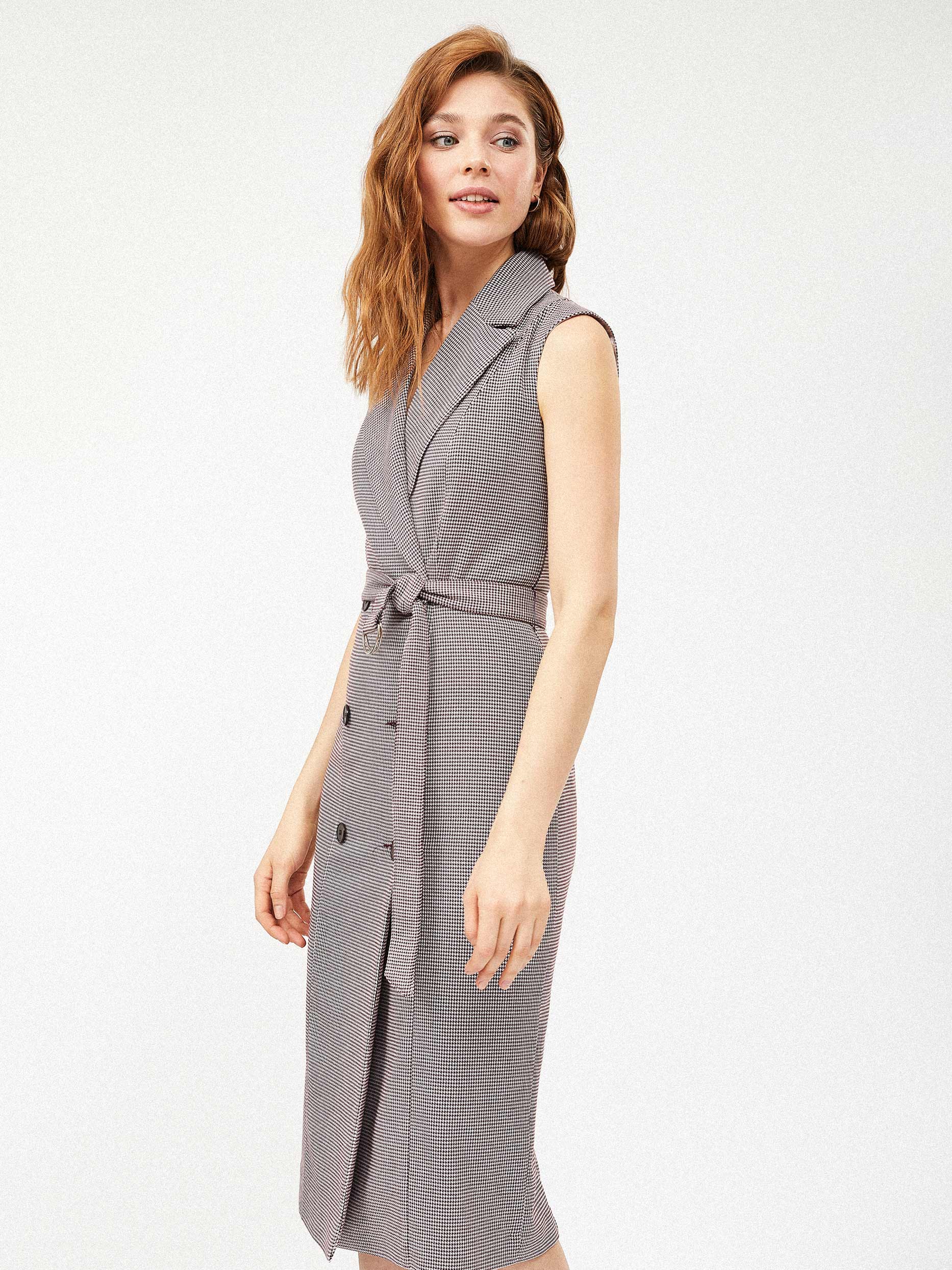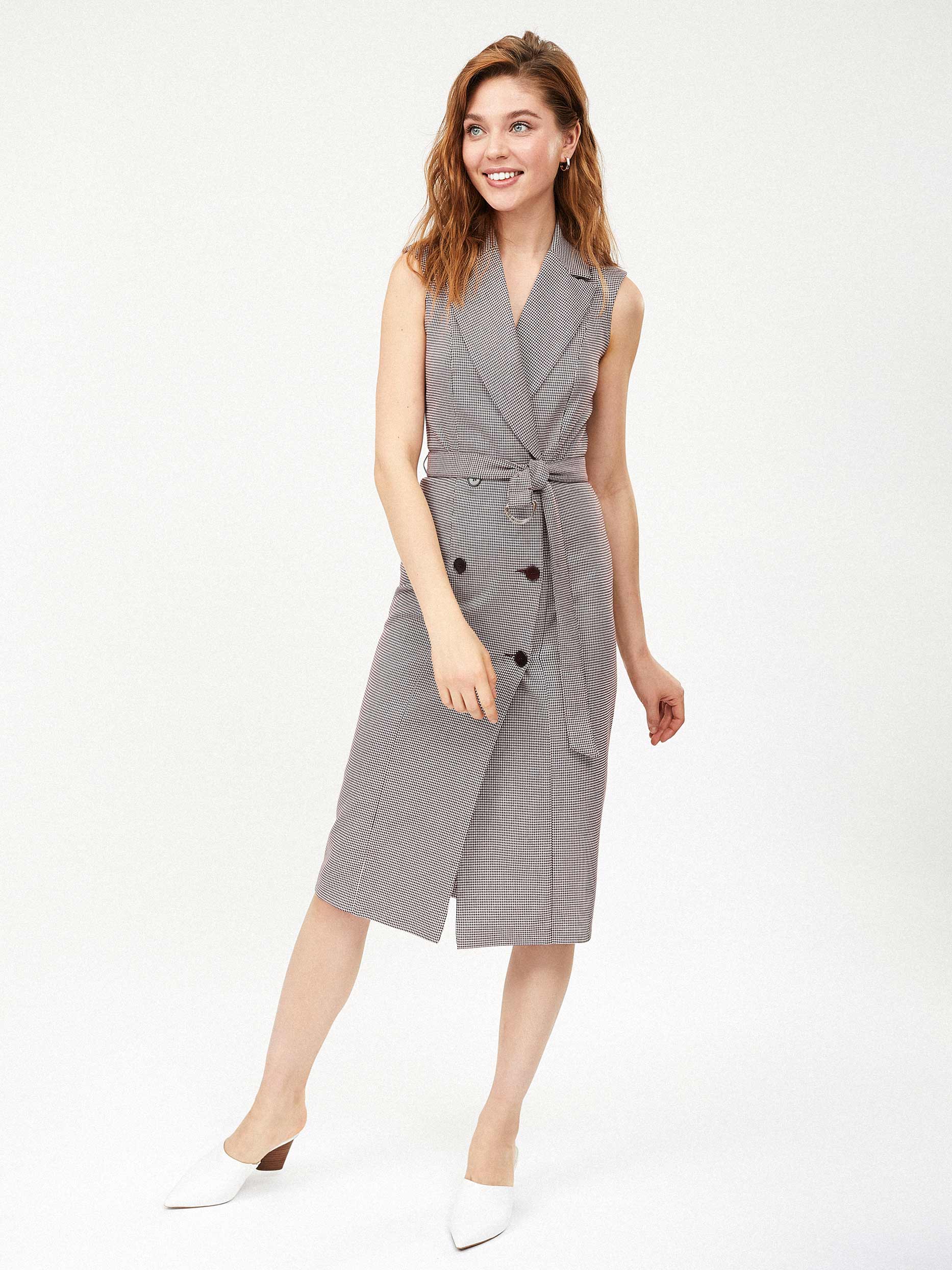 Платье приталенного кроя, выполненное из смесовой вискозы. Лацканы, пояс в тон основной ткани с металлической пряжкой, шлица. Застегивается на два ряда крупных контрастных пуговиц.