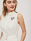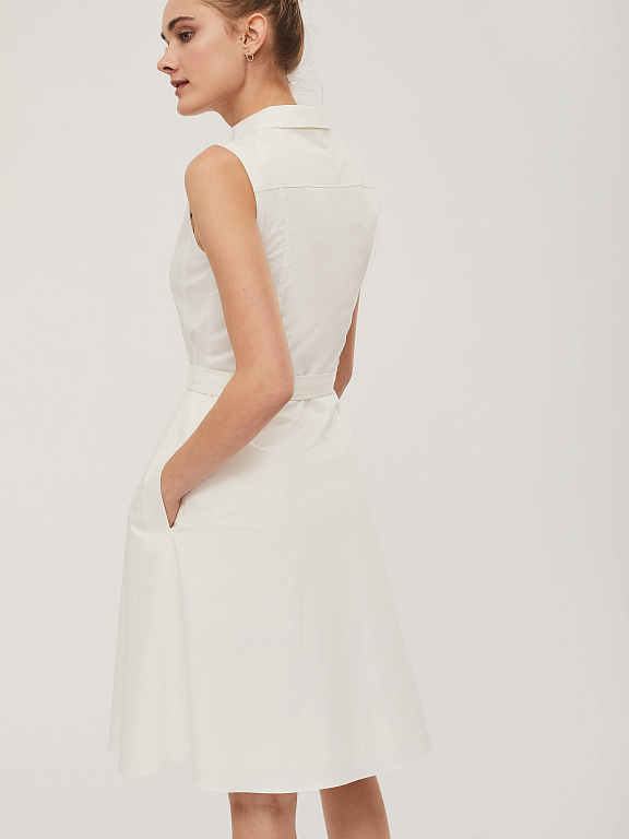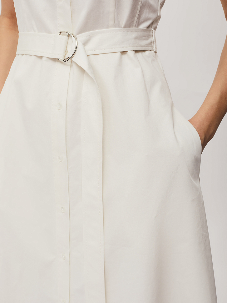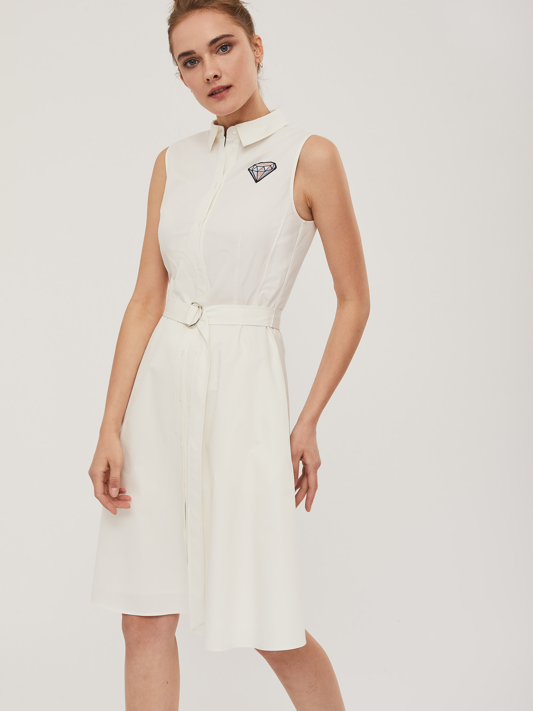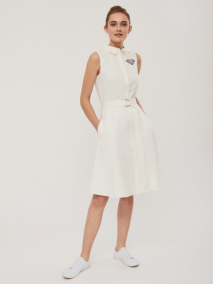 Хлопковое платье без рукавов с шевроном в виде ограненного камня.  Изделие приталенного силуэта с рубашечным воротником и застёжкой на пуговицы. Платье с карманами в боковых швах и съёмным поясом с металлическими полукольцами. Изделие на  подкладке.  Рост модели 175 см, размер 42 (российский)