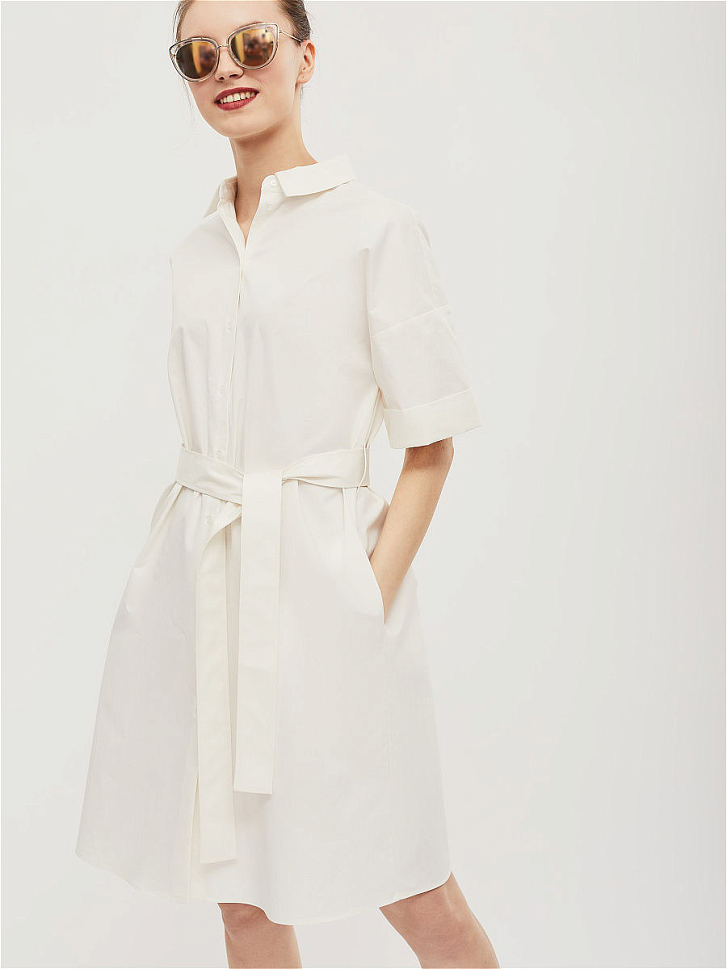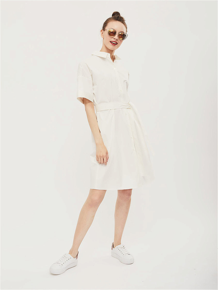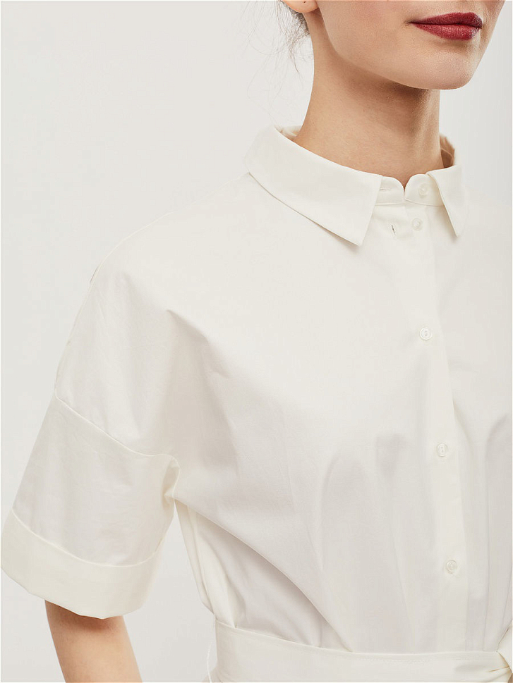Платье-рубашка из хлопка с короткими рукавами с отворотами и карманами в боковых швах. Изделие  прямого силуэта с отложным воротником и застёжкой на пуговицы. Платье со съёмным поясом из основной ткани. Изделие без подкладки.  Рост модели 177 см, размер 42 (российский)