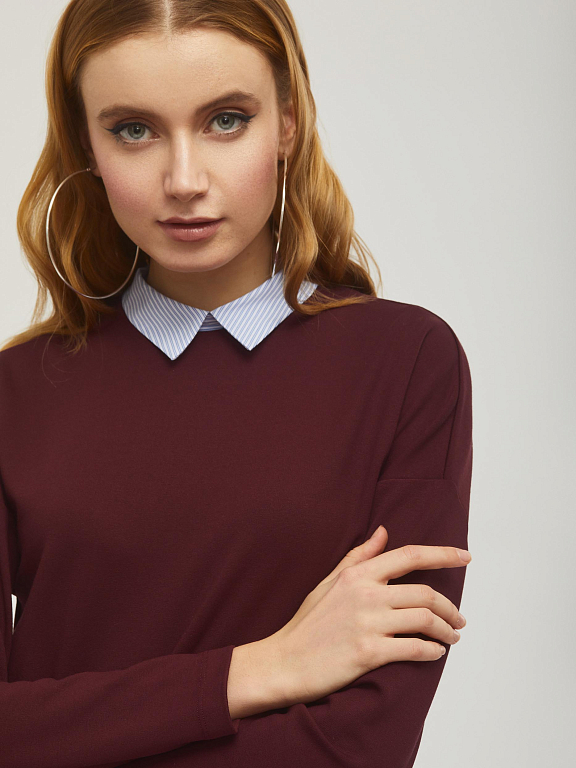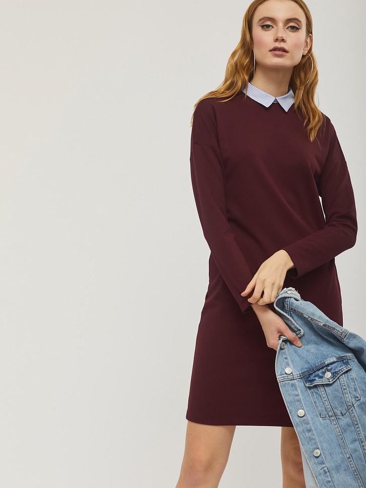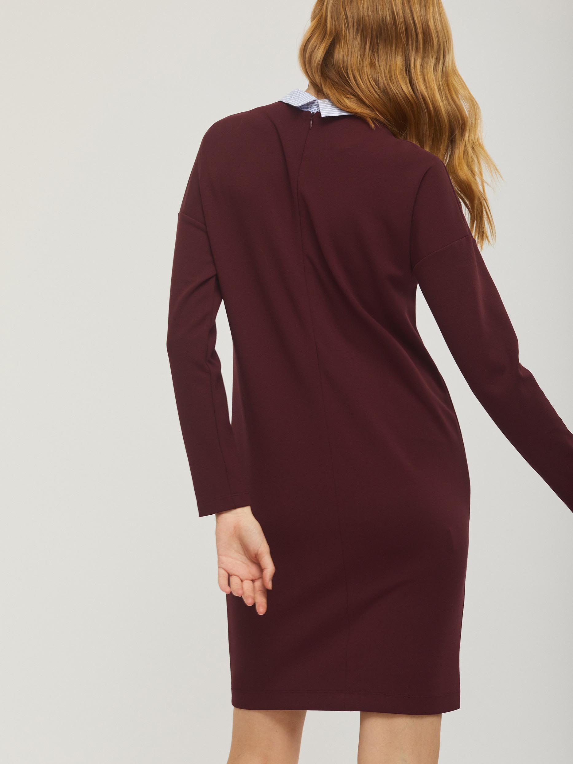 Однотонное платье прямого силуэта с классическим воротником в полоску и застежкой на пуговицу. Потайная молния сзади. Изделие без подкладки.  Рост модели 177 см, размер 42 (российский)