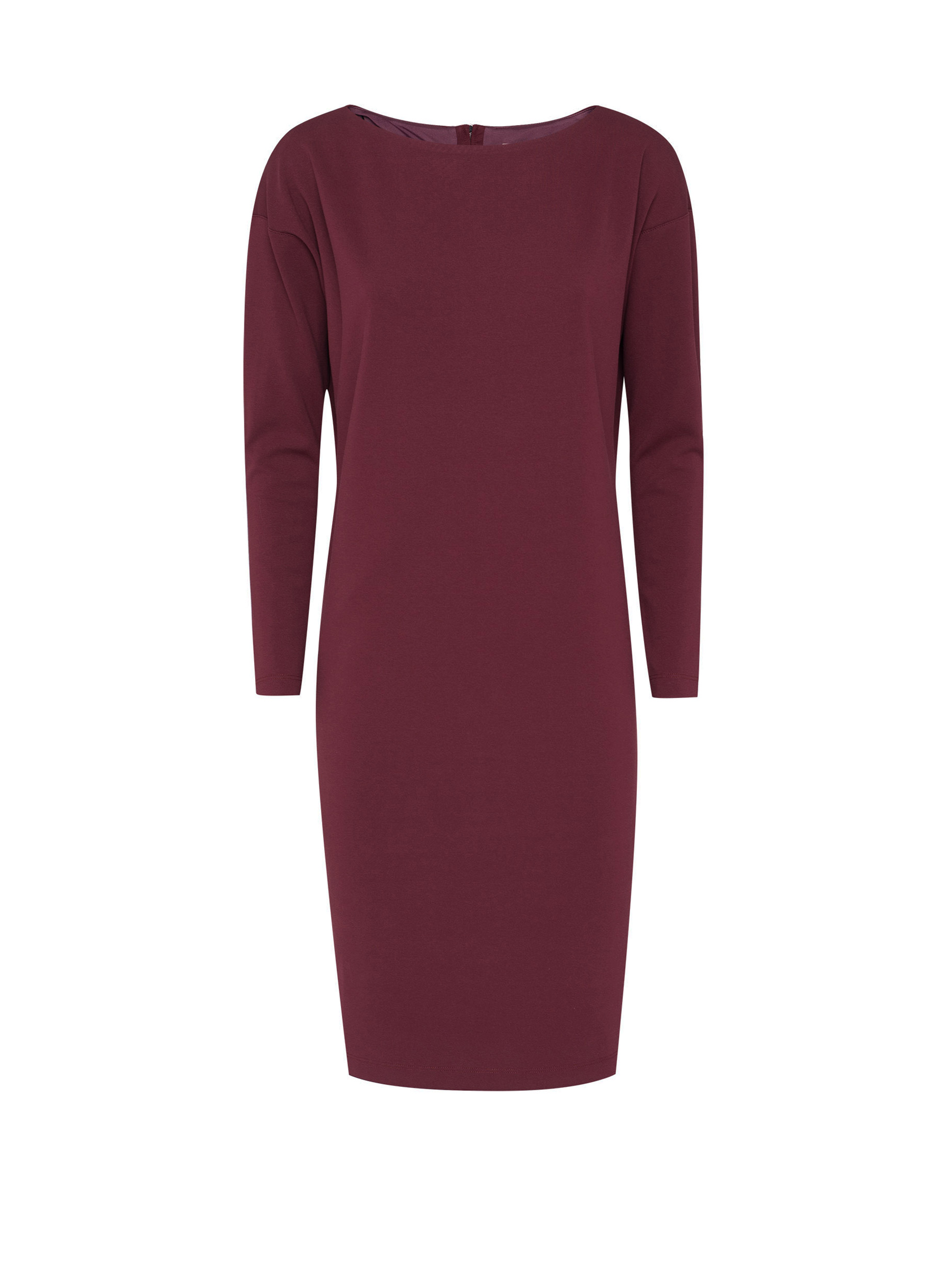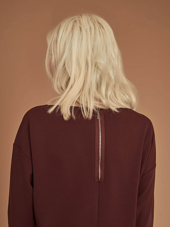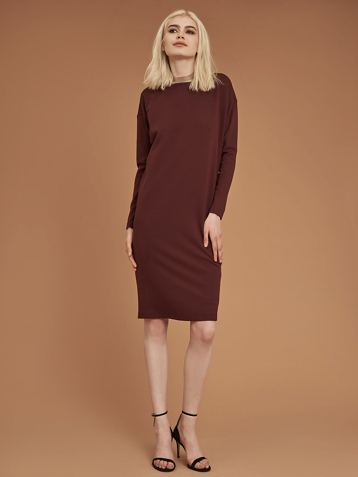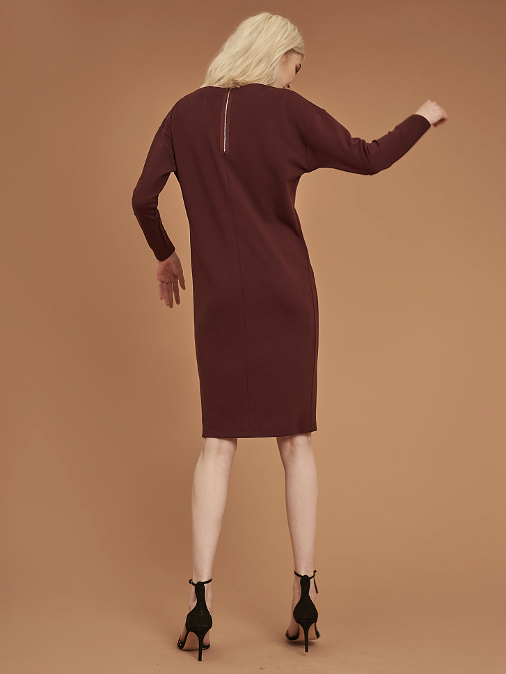 Платье полуприлегающего кроя. Вырез-лодочка, спущенная линия плеч. Застегивается на молнию на спине.