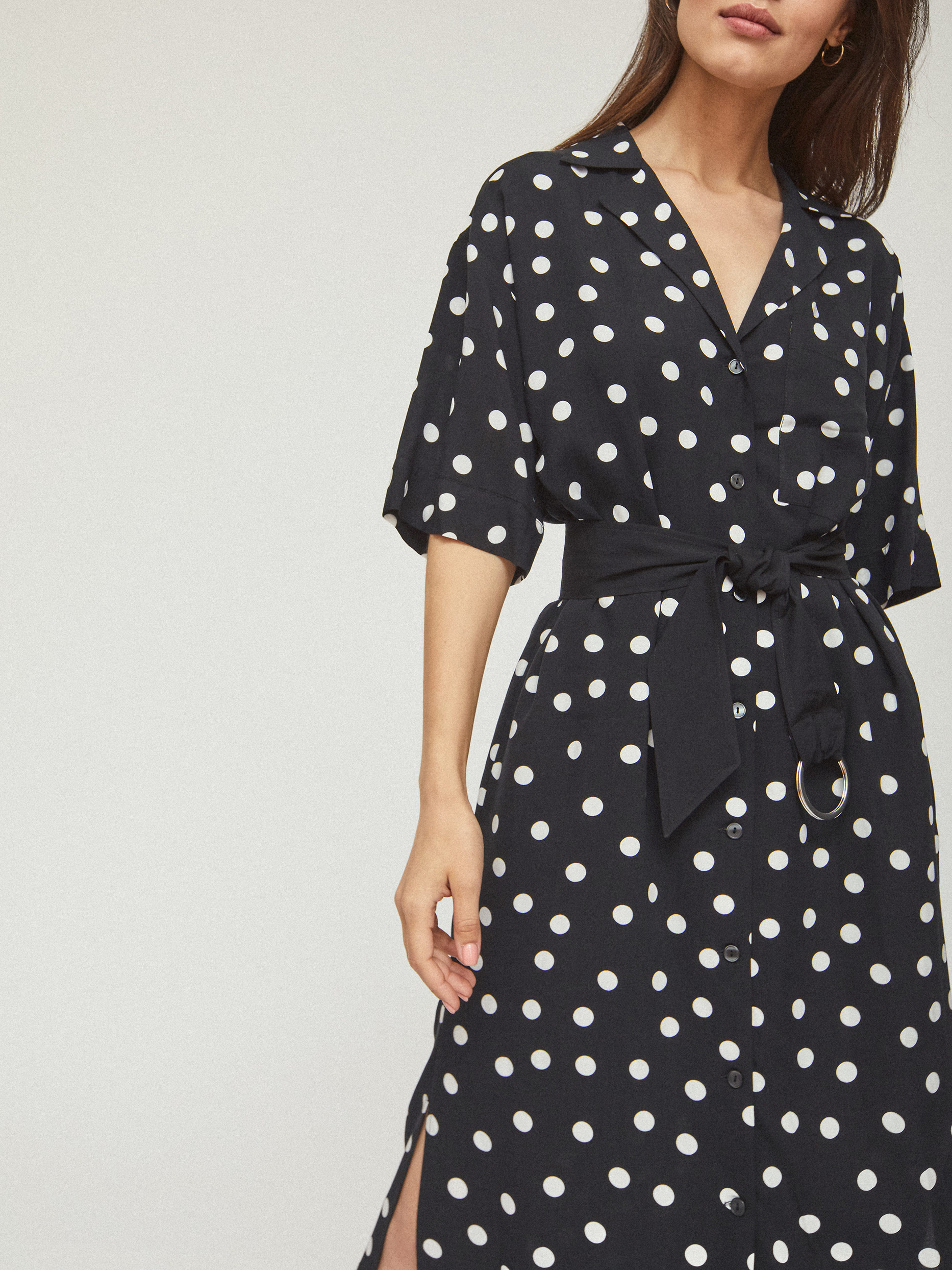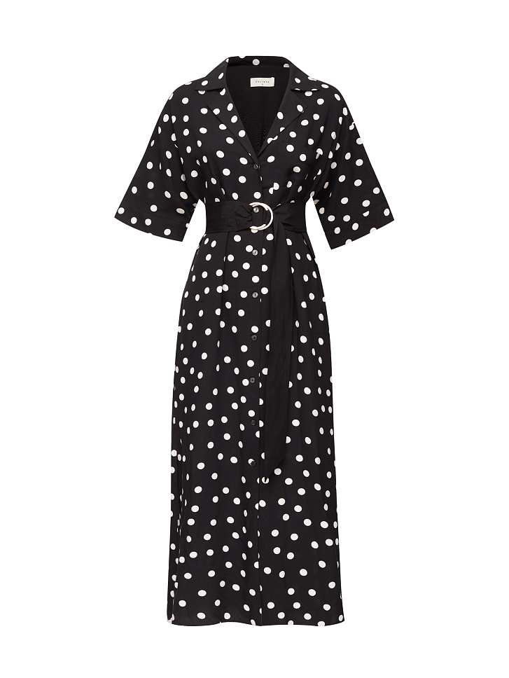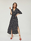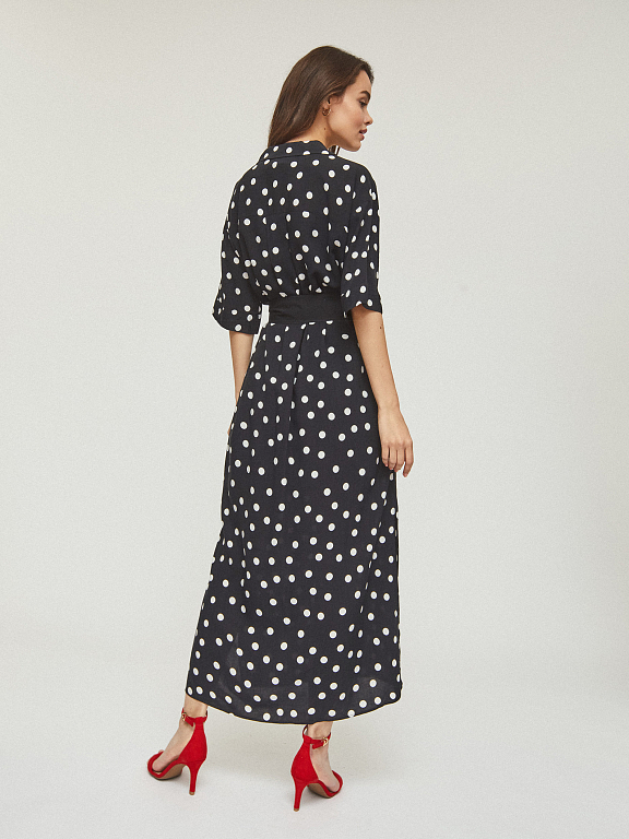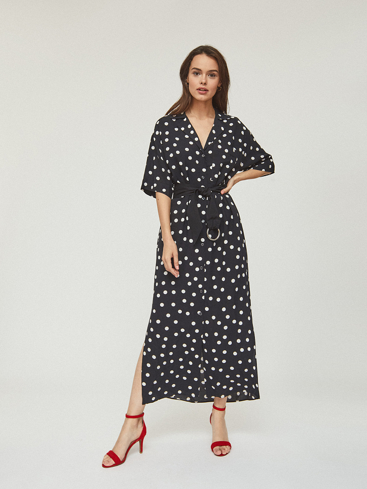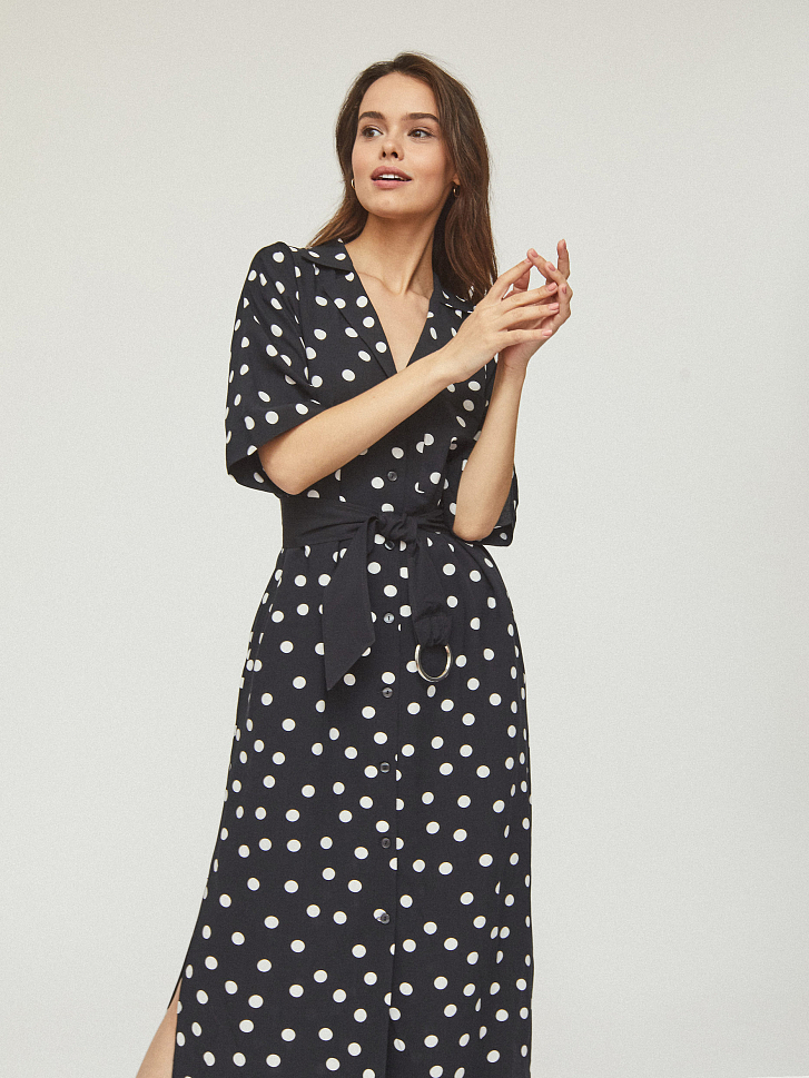 Приталенное платье из струящейся ткани с поясом. Вырез-шалька, накладной нагрудный карман, свободные рукава длины ¾, разрезы по бокам.