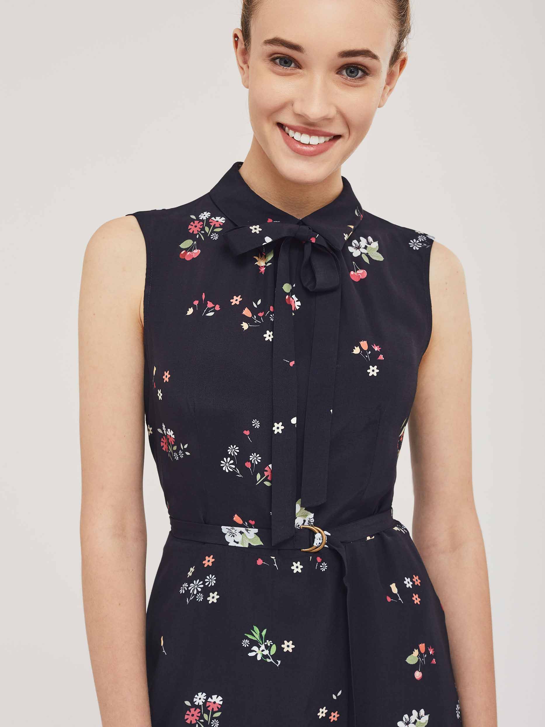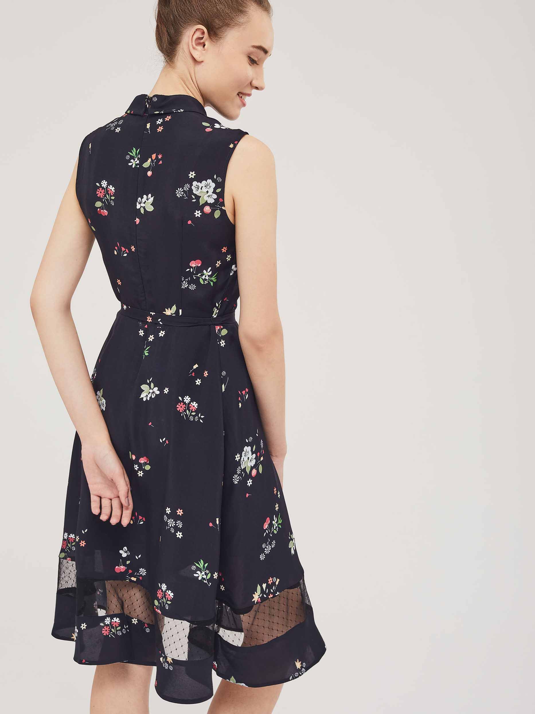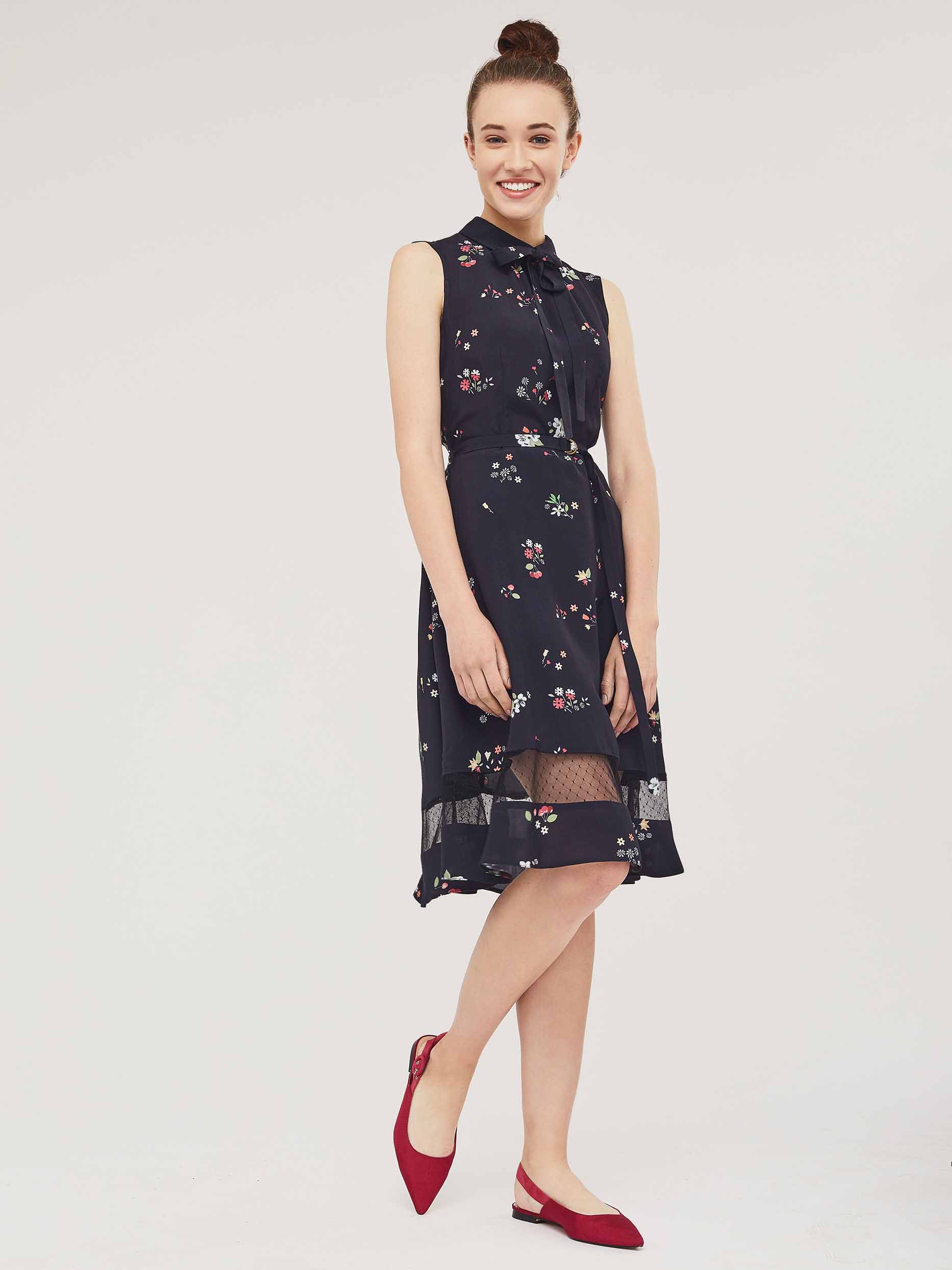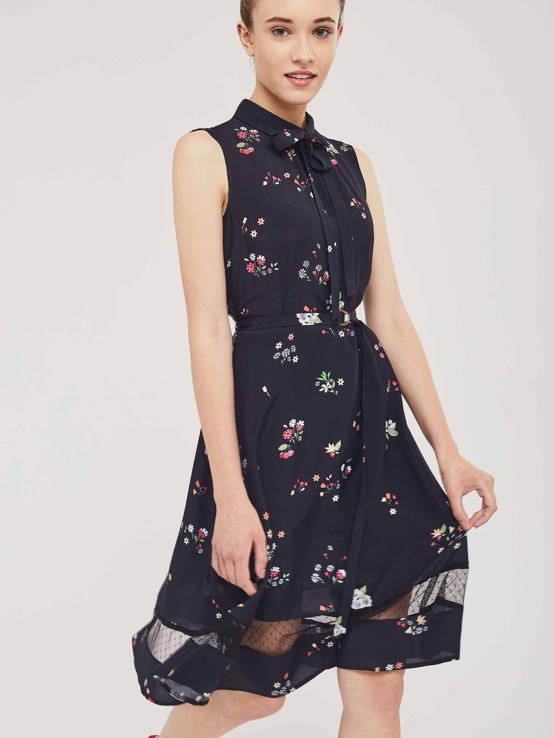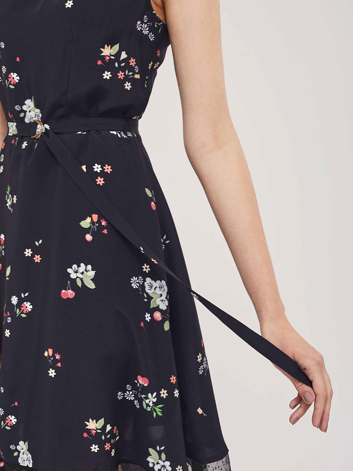 Приталенное платье без рукавов с отложным воротником и завязками на бант. Платье со вставкой из сетки по нижнему краю. Изделие со съёмным поясом и пряжкой. Застёжка на потайную молнию сзади. Изделие без подкладки.  Рост модели 176 см, размер 42 (российский)