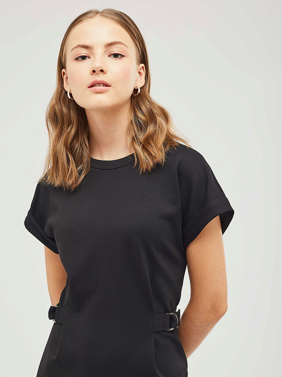 Трикотажное платье со спущенной линией плеча с отворотами. Изделие приталенного силуэта с регулирующимися хлястиками на полукольцах. Застёжка на потайную молнию сзади. Изделие без подкладки.  Рост модели 177 см, размер 42 (российский)
