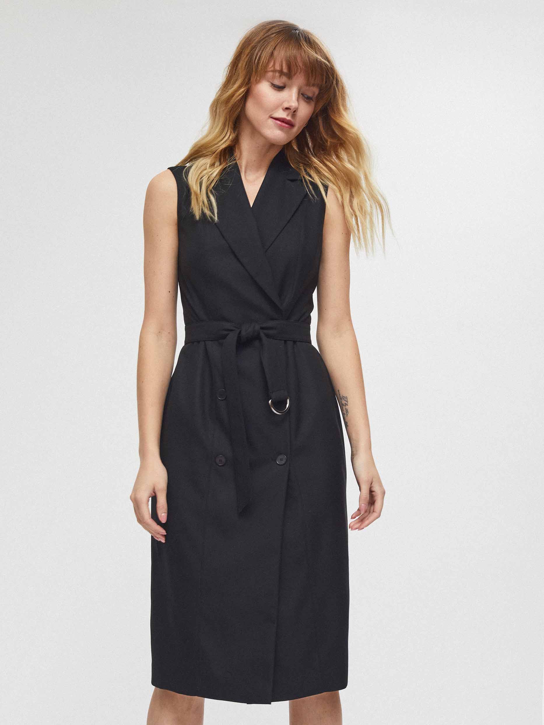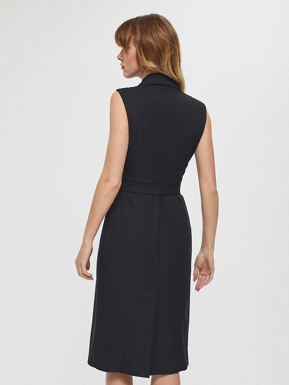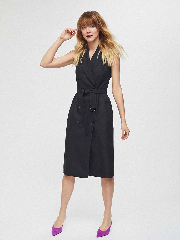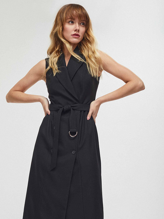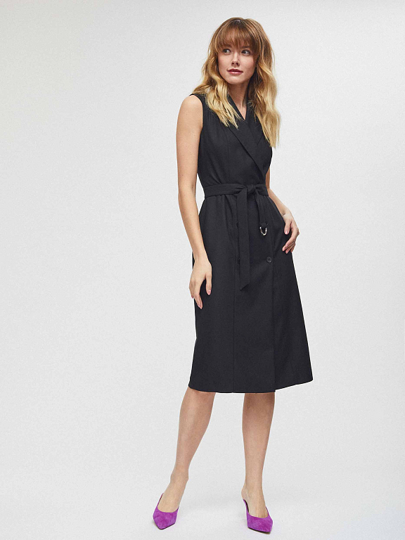 Приталенное платье без рукавов с лацканами и поясом в тон. Двубортная застежка на крупные пуговицы, шлица сзади. Изделие на подкладке.