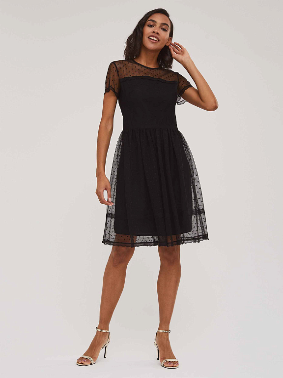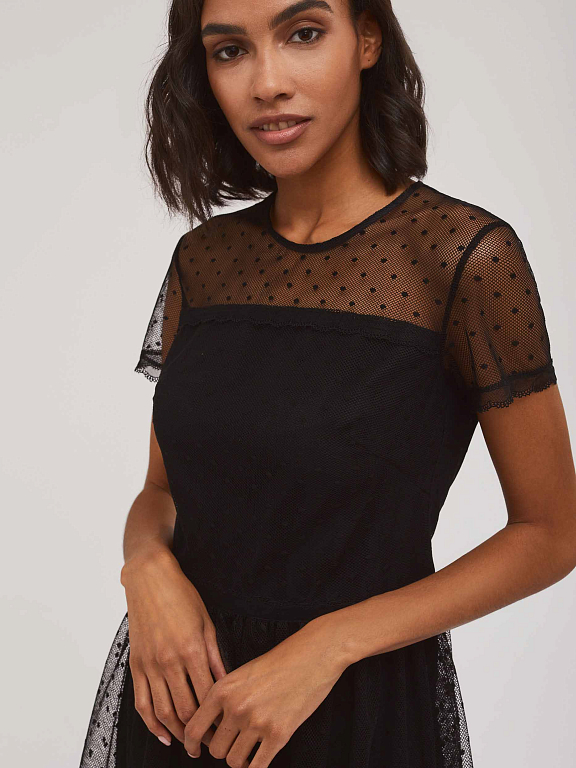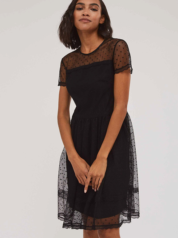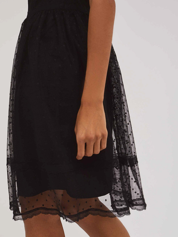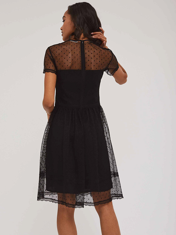 Платье приталенного кроя с пышной юбкой длины мини. Округлый вырез, короткие рукава с контрастными фестонами по краю. Застегивается на потайную молнию. Изделие на подкладке.