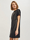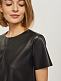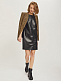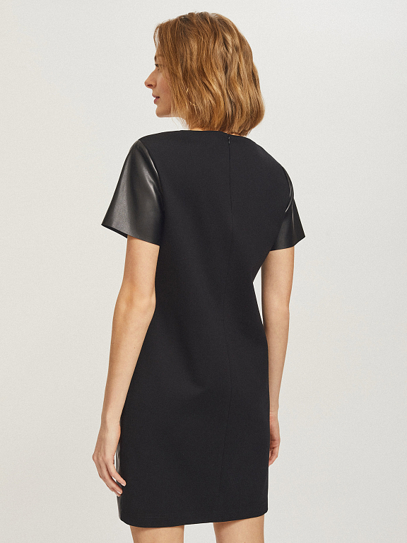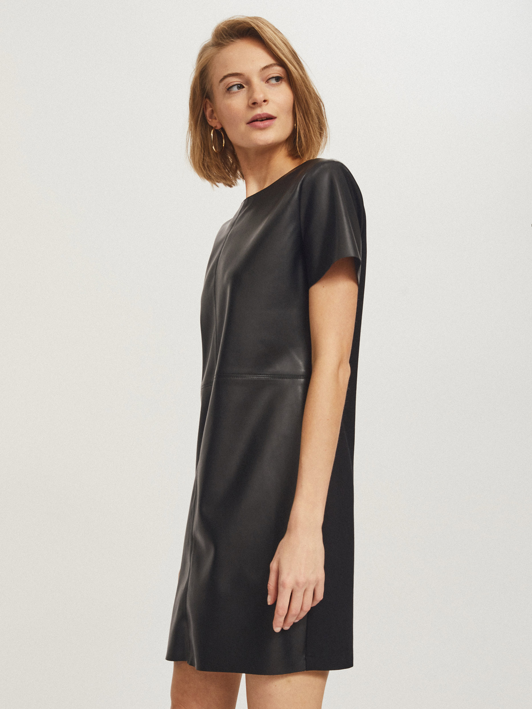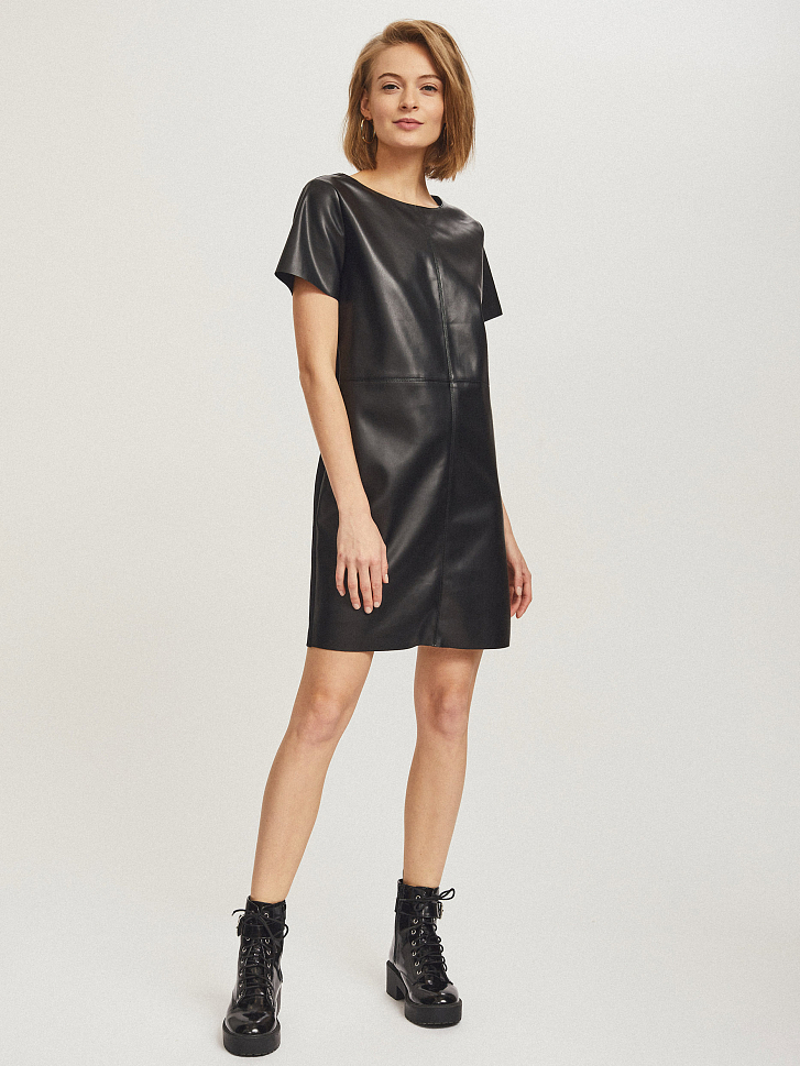 Короткое платье прямого кроя из искусственной кожи. Округлый вырез, короткие рукава, декоративные швы на передней части. Застегивается на потайную молнию.
