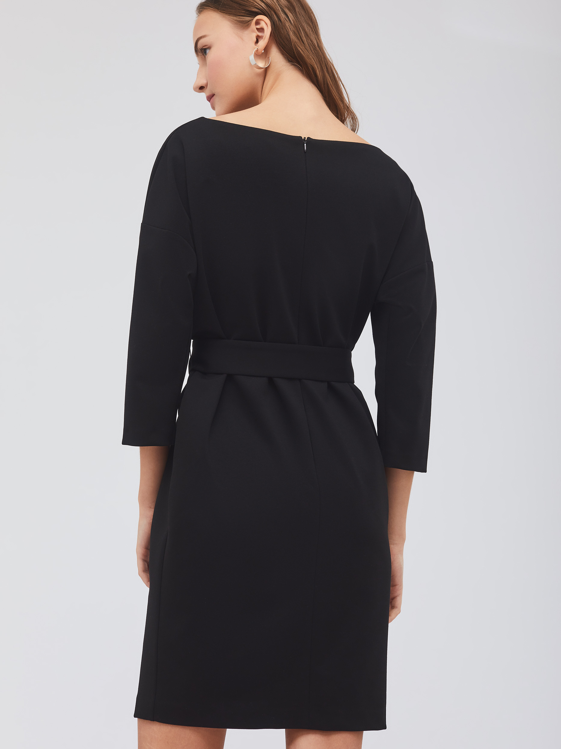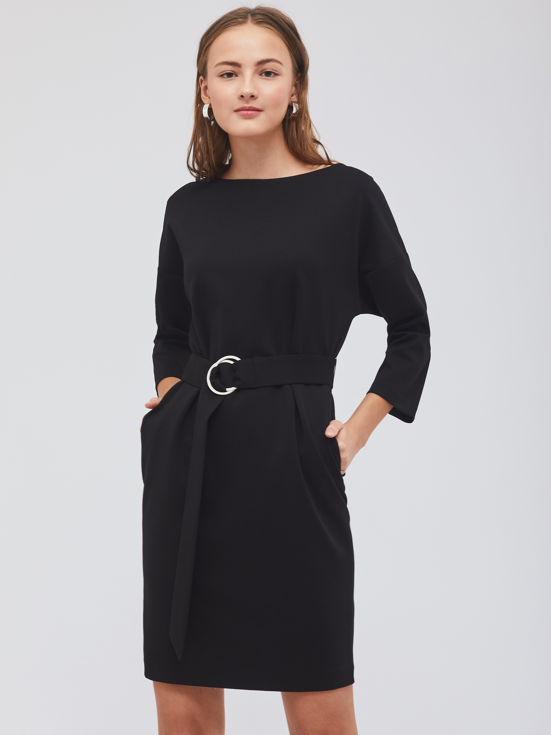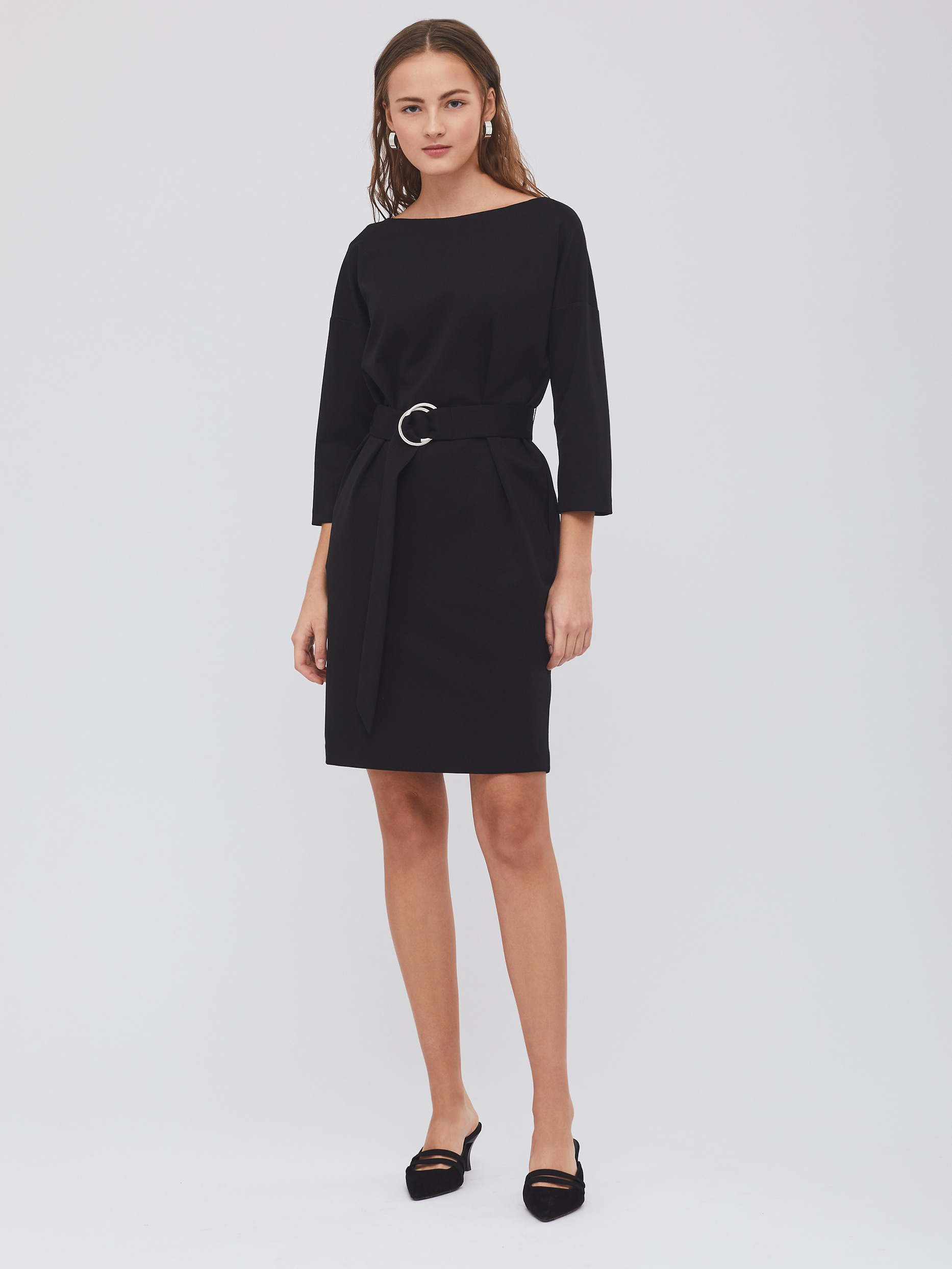 Платье прямого силуэта с рукавами длины 3/4.  Платье с потайной молнией сзади. Изделие со съёмным ремнем в цвет из основной ткани с металлической пряжкой.  Изделие на подкладке. Рост модели 178 см, размер 42 (российский)