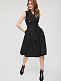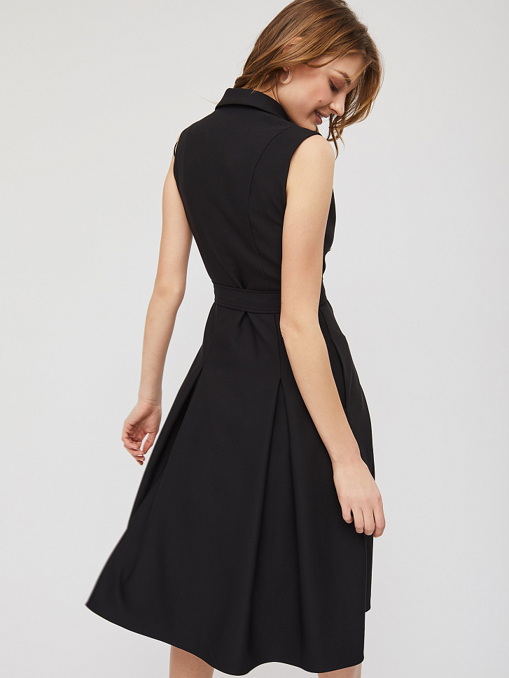 Двубортное платье из поливискозы с отложным воротником и лацканами с застёжкой на металлические пуговицы.  Изделие отрезное по линии талии со съёмным поясом в цвет из основной ткани.  Сарафан с карманами в боковых швах.  Изделие на подкладке.  Рост модели 175 см, размер 42 (российский)