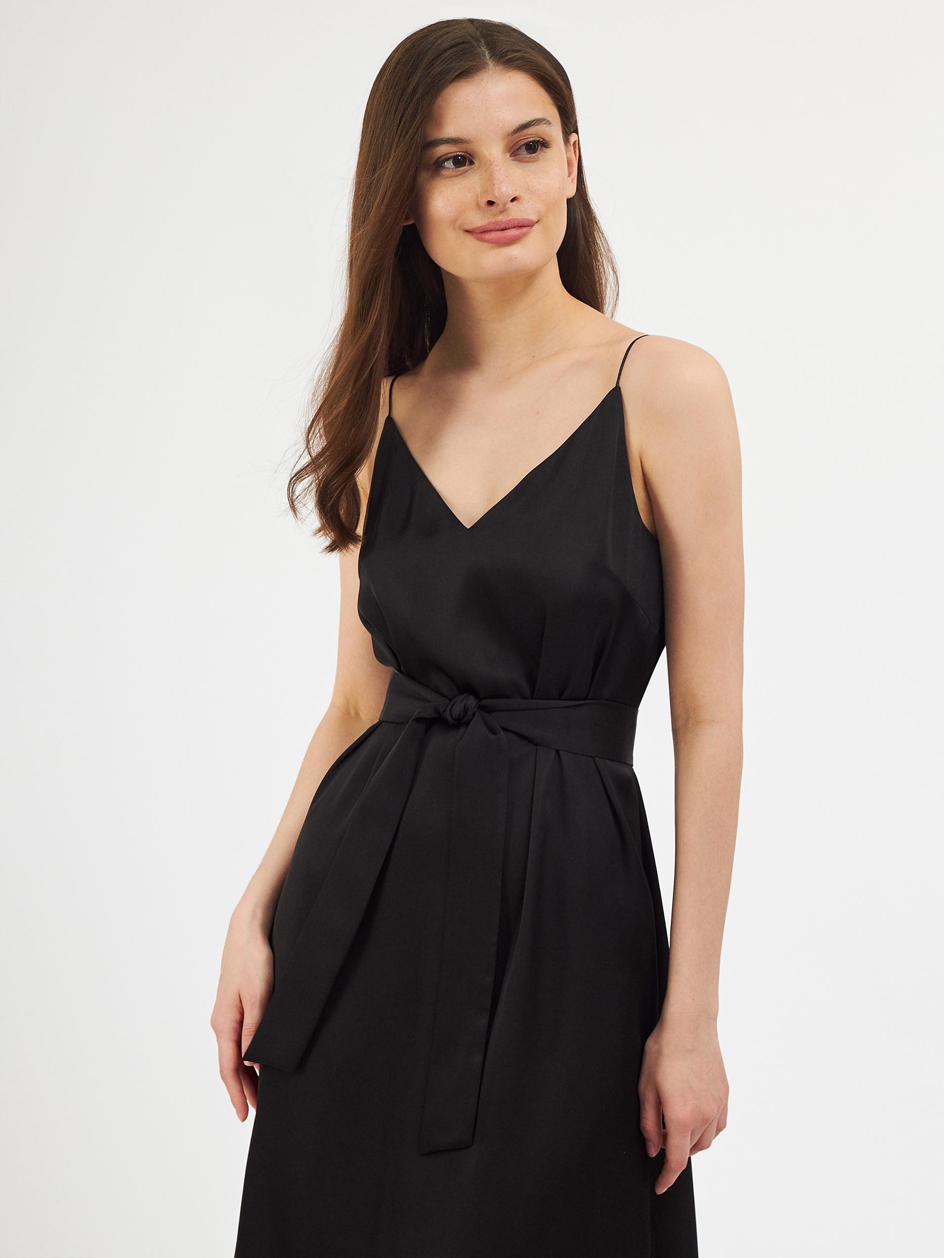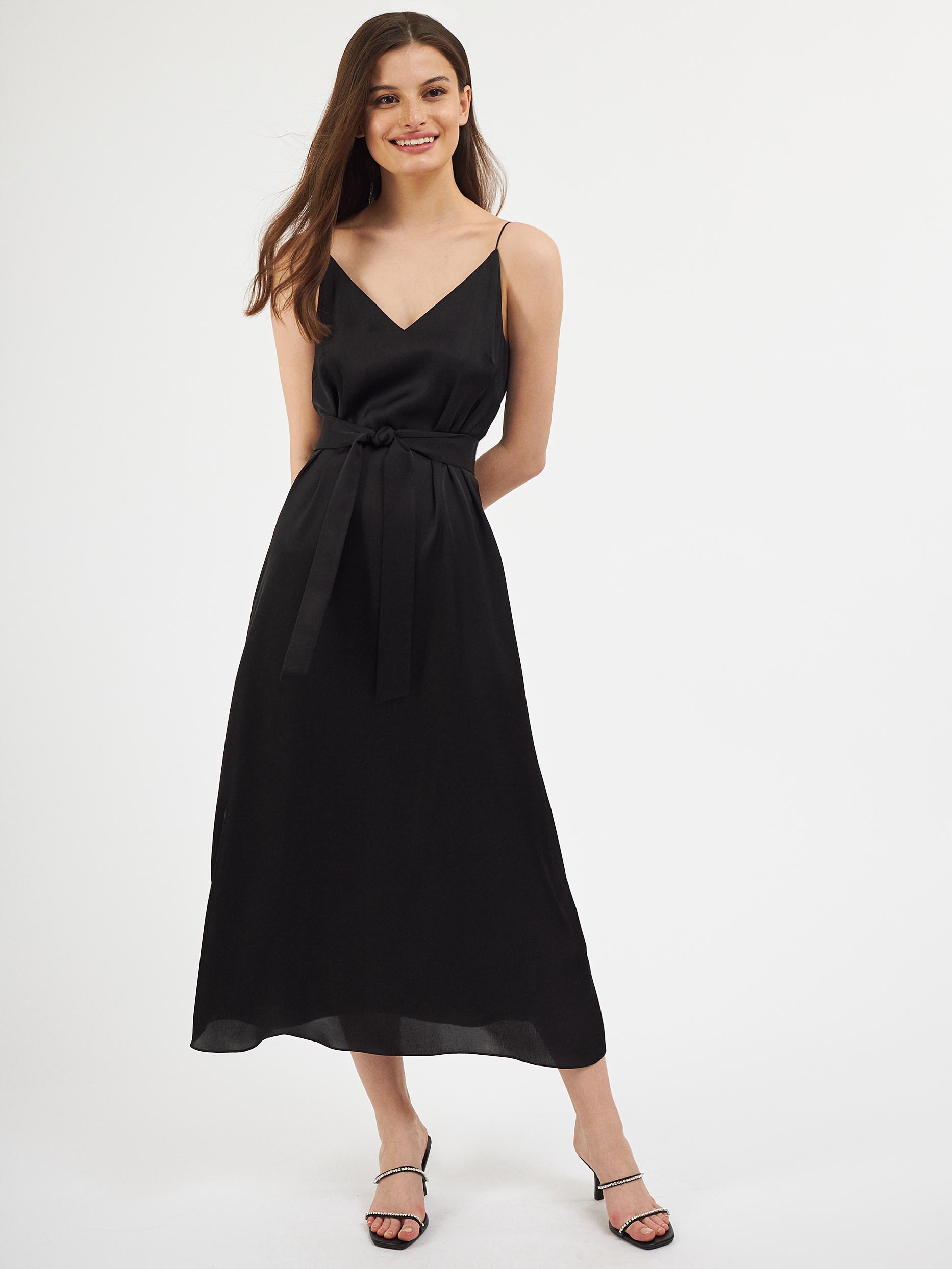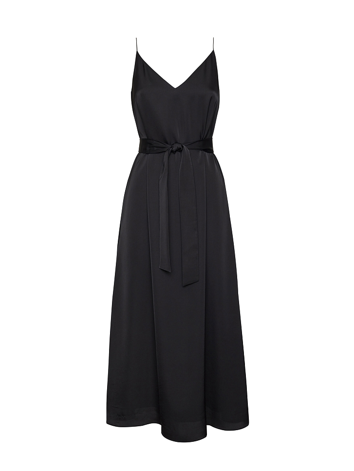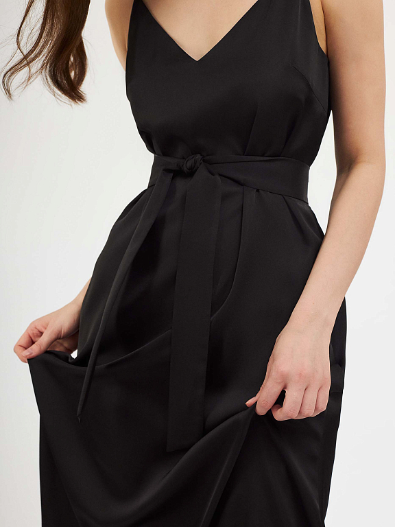 Однотонное платье-комбинация длины миди. Широкий крой, тонкие бретели, подкладка. В комплекте пояс из этой же ткани.