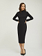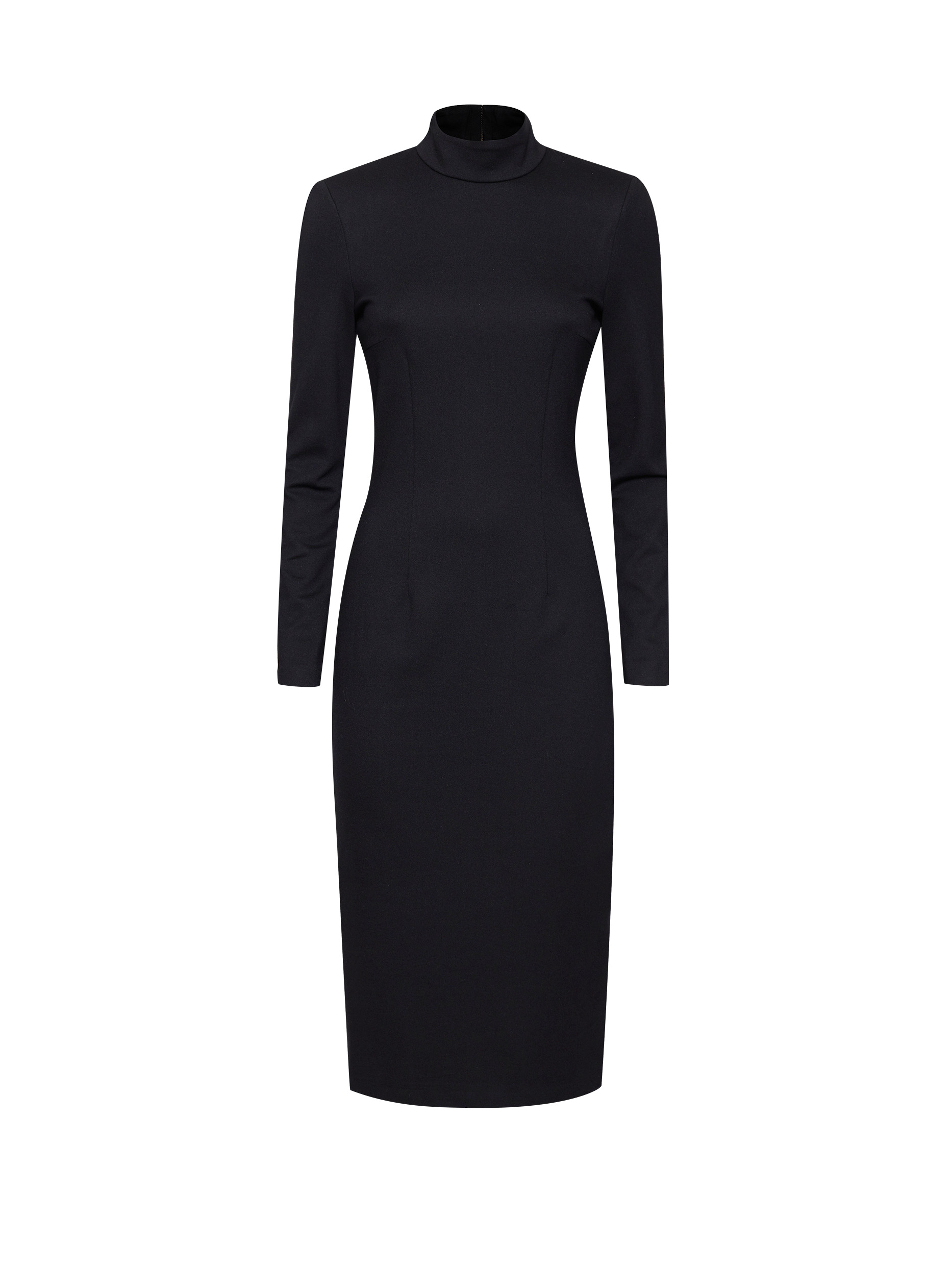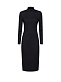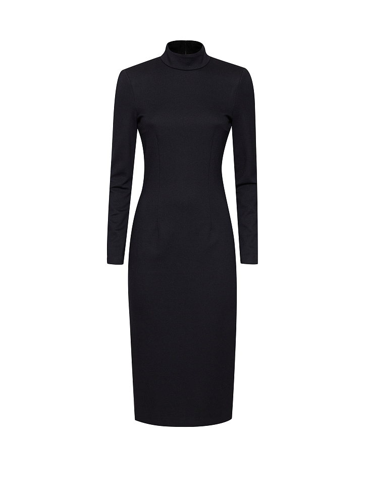 Однотонное платье облегающего кроя. Длина миди, воротник-стойка, длинные рукава, шлица, подкладка. Застегивается на молнию по всей длине.