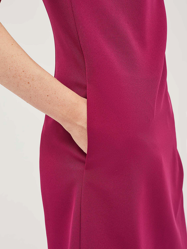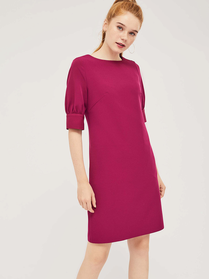 Приталенное платье с рукавами "фонарик" и широкими манжетами. Изделие длиной выше колена. Застёжка на потайную молнию сзади. Платье с карманами в боковых швах. Изделие на подкладке.  Рост модели 172 см, размер 42 (российский)