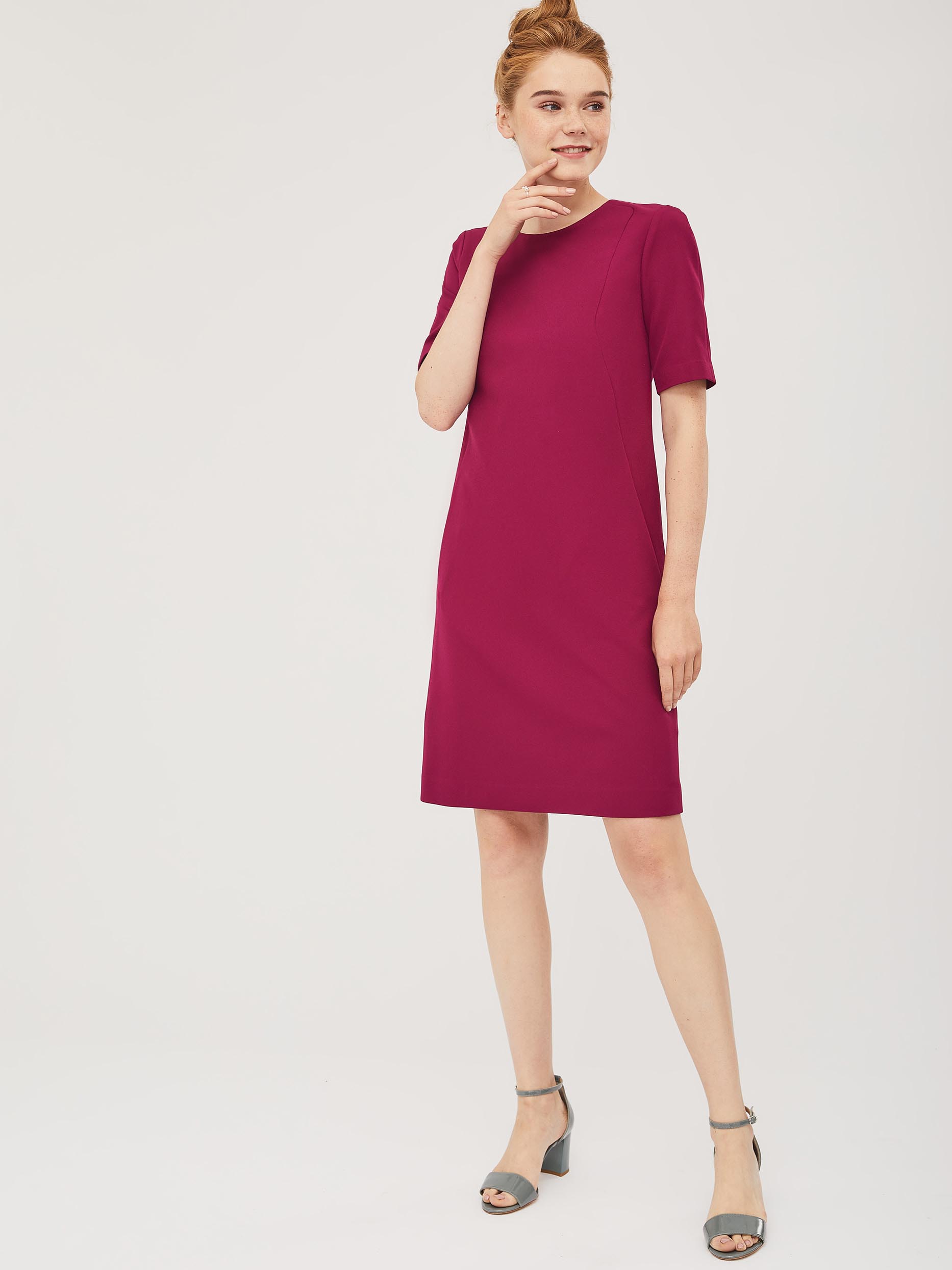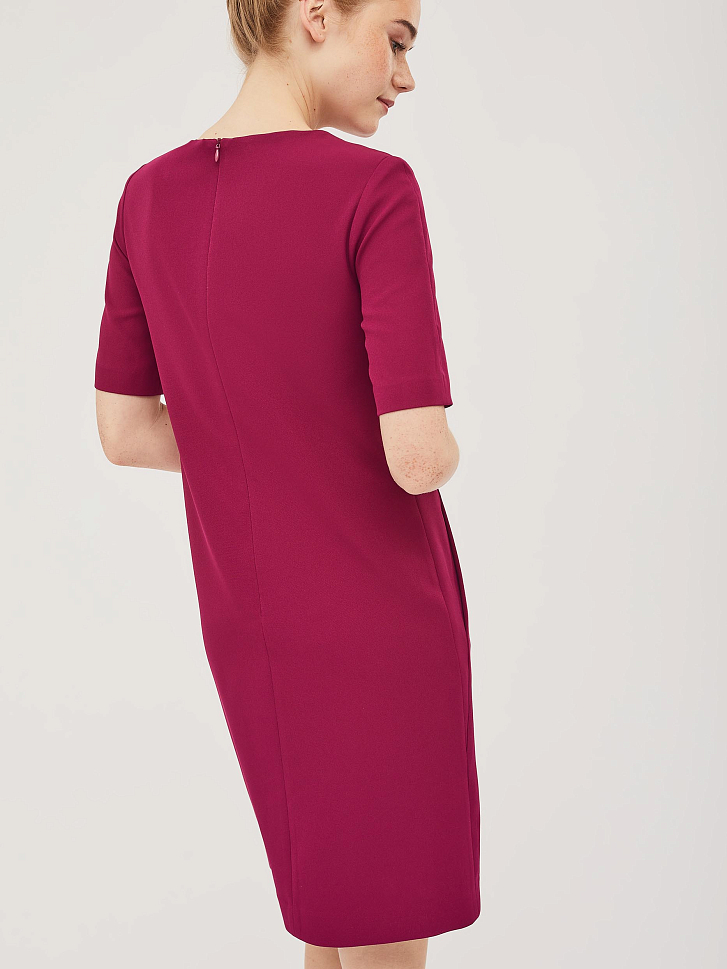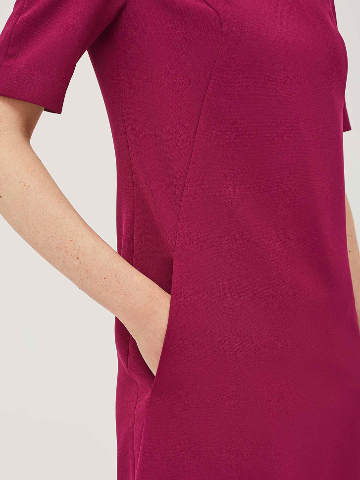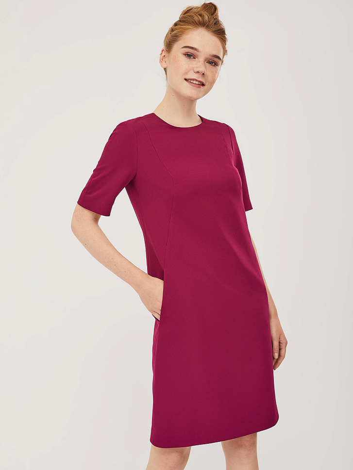 Платье с фигурными подрезами А-силуэта и короткими рукавами. Изделие с застёжкой на потайную молнию сзади и карманами в подрезе. Изделие на подкладке.  Рост модели 172 см, размер 42 (российский)