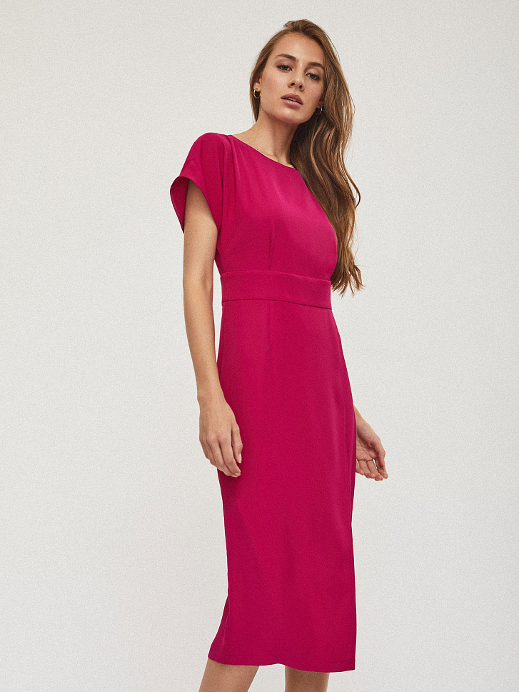 Платье приталенного кроя, изготовленное из струящейся ткани. Запах, идущий от талии по левой ноге. Округлый вырез, свободные рукава, застежка на молнию.