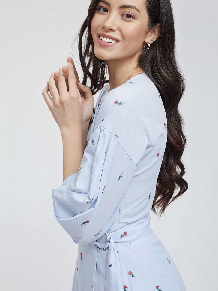 Платье из 100% хлопка с принтом. Приталенный крой, длина миди, объемные рукава длины ¾. В комплекте пояс.