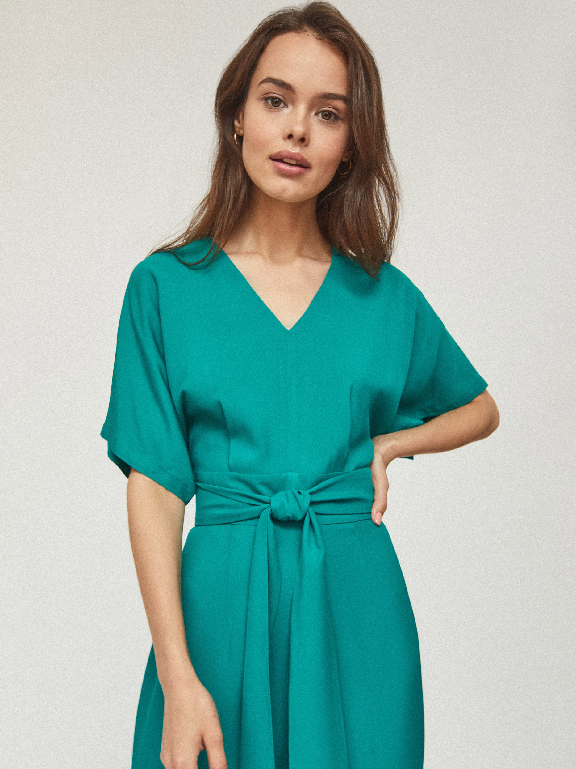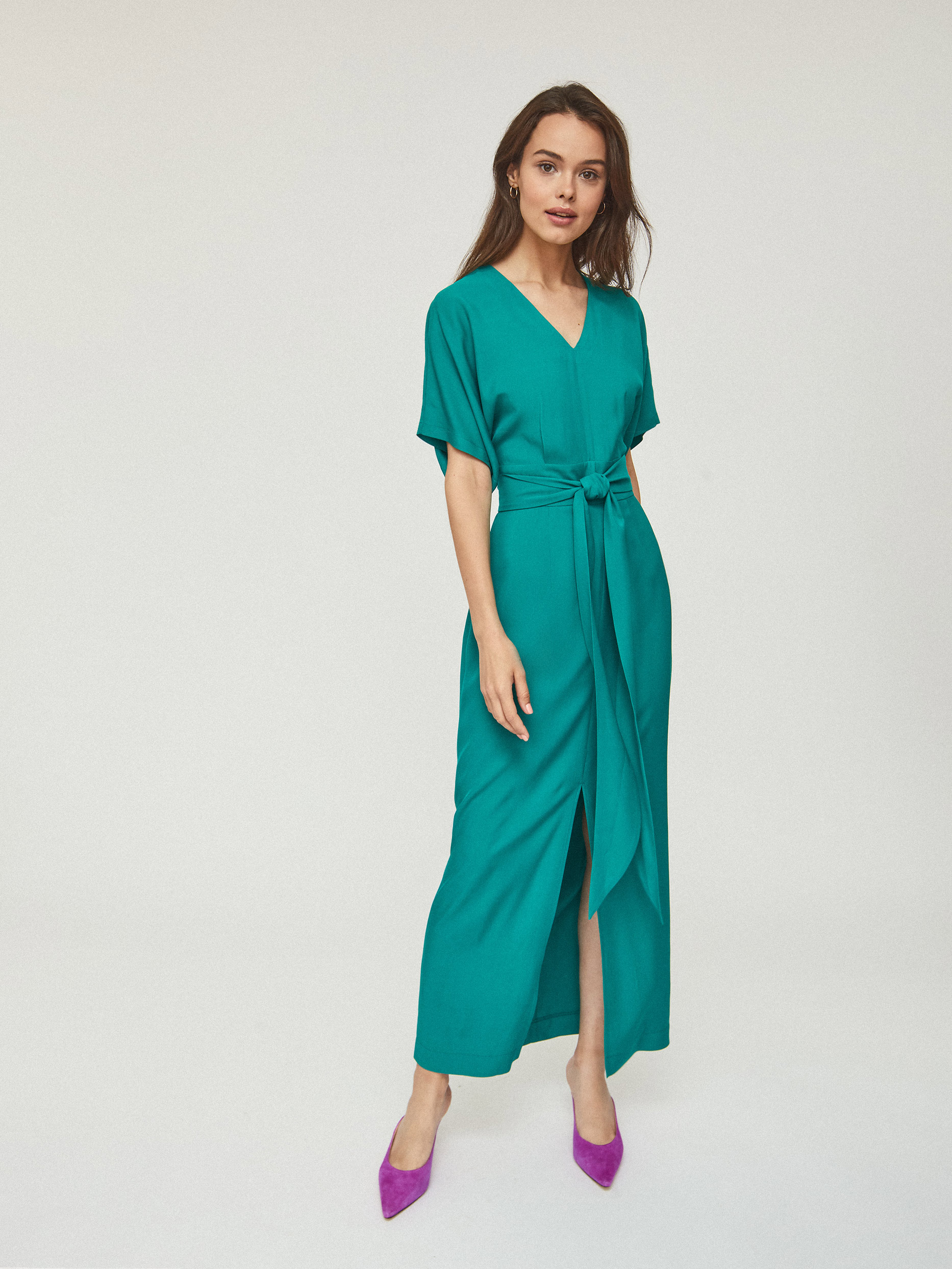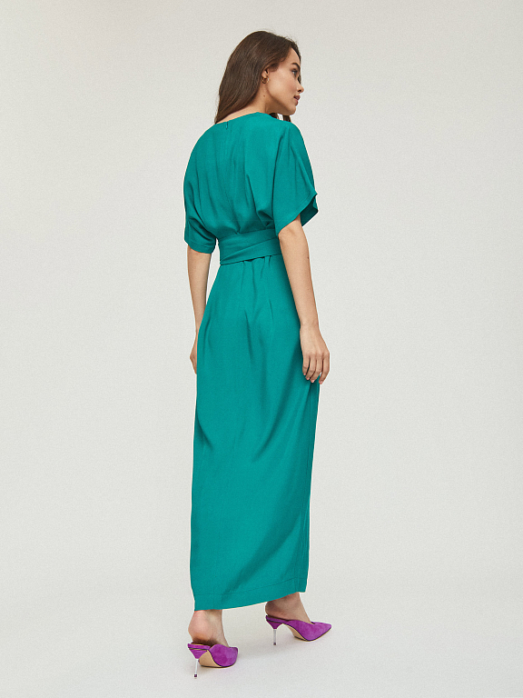 Приталенное платье длины макси, выполненное из 100% вискозы, с поясом из этой же ткани. Свободные короткие рукава, V-образный вырез, втачной пояс, разрез по центру. Застегивается на потайную молнию на спине.