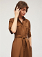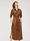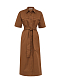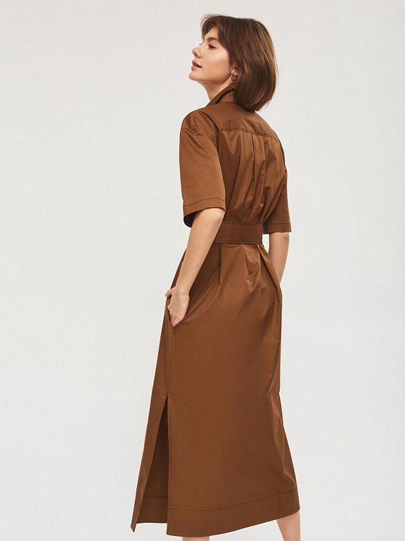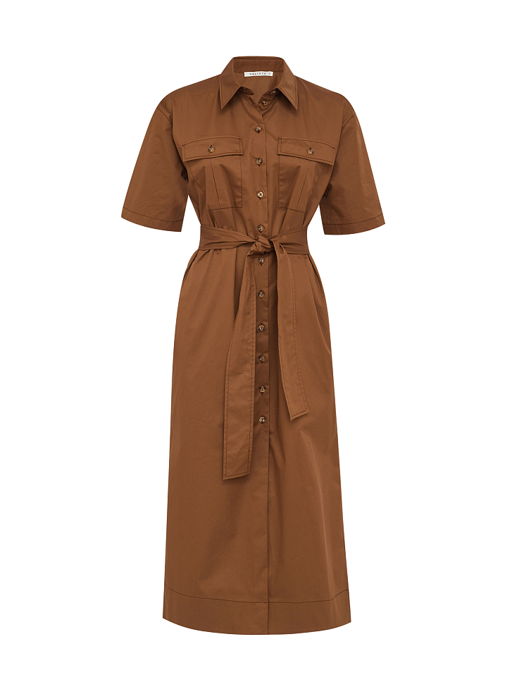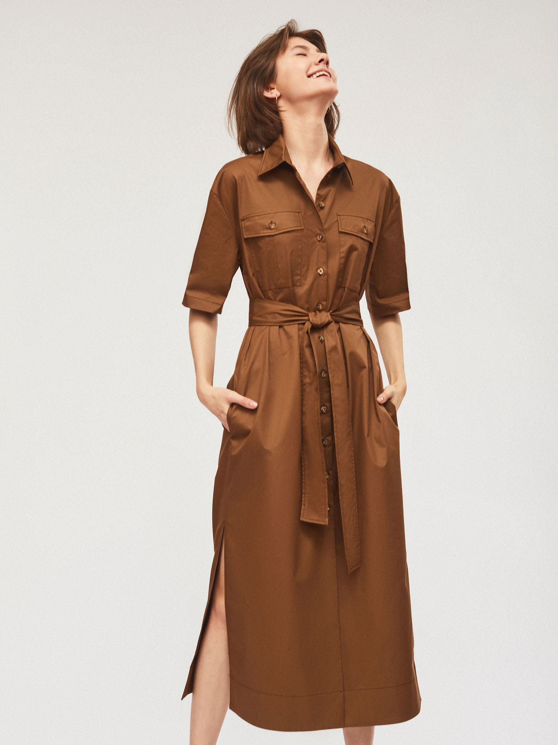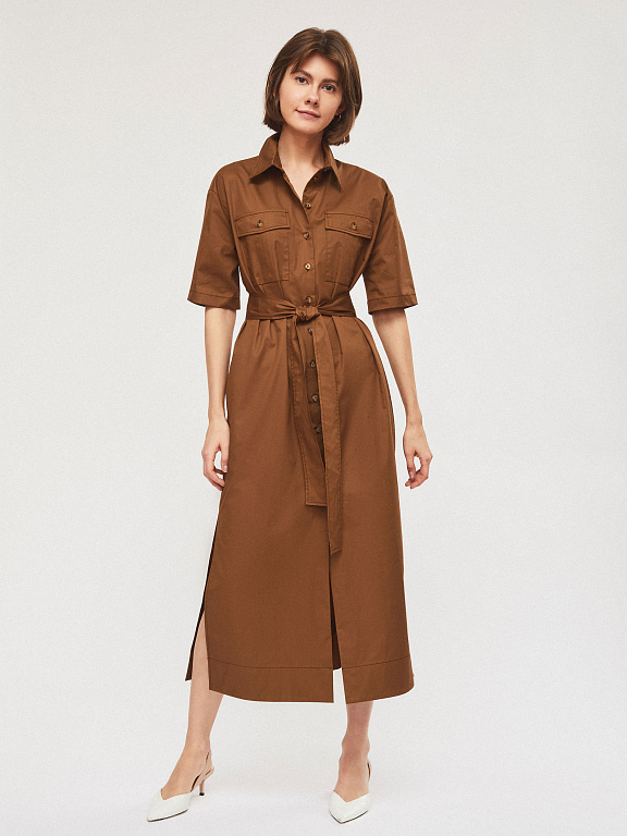 Платье рубашечного кроя в стиле сафари, изготовленное из смесового хлопка. Классический отложной воротник, накладные нагрудные и боковые прорезные карманы. Закругленный низ с разрезами по бокам.