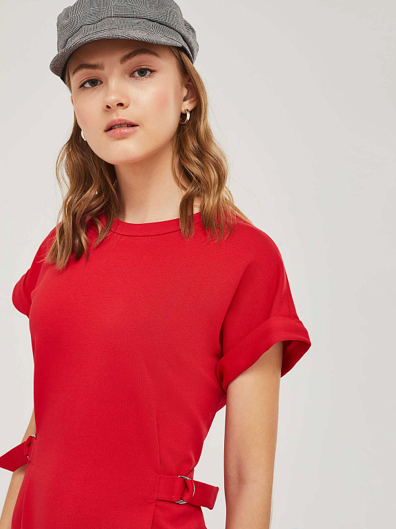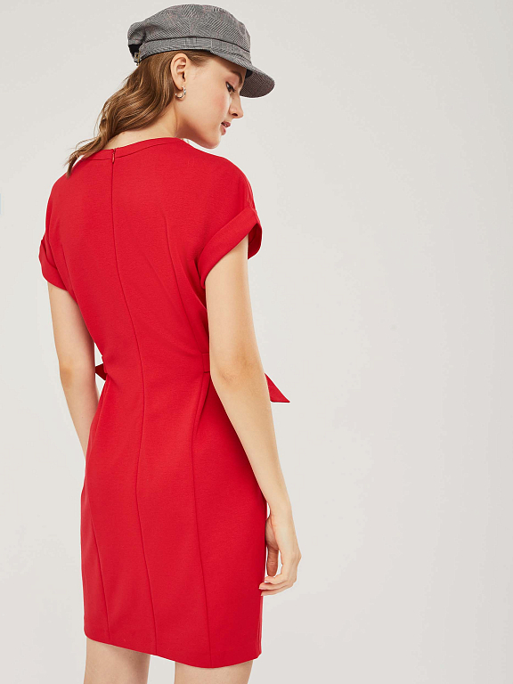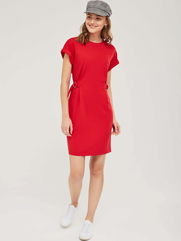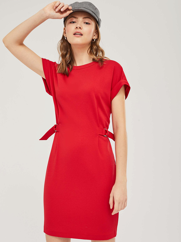 Трикотажное платье со спущенной линией плеча с отворотами. Изделие приталенного силуэта с регулирующимися хлястиками на полукольцах. Застёжка на потайную молнию сзади. Изделие без подкладки.  Рост модели 177 см, размер 42 (российский)