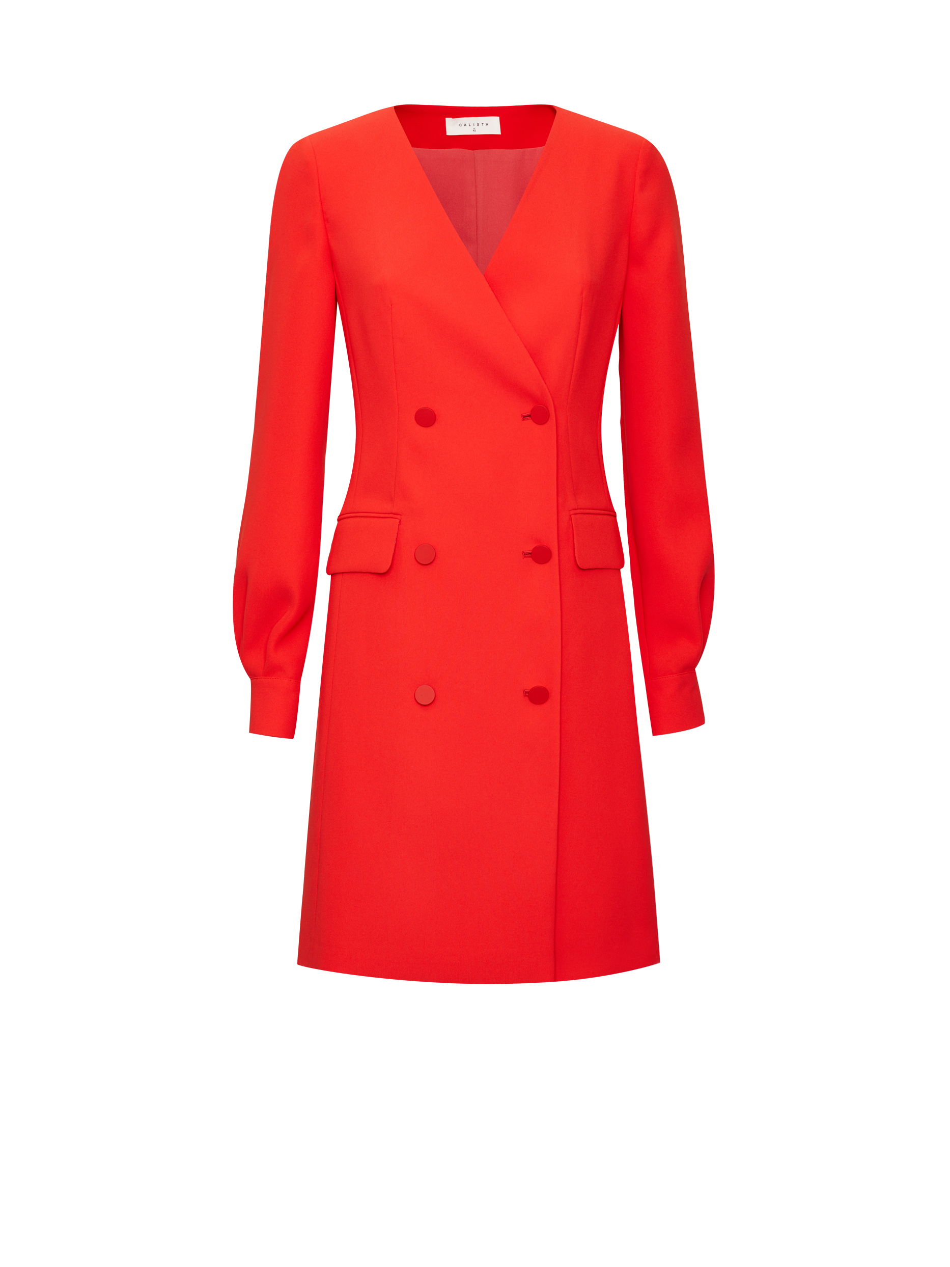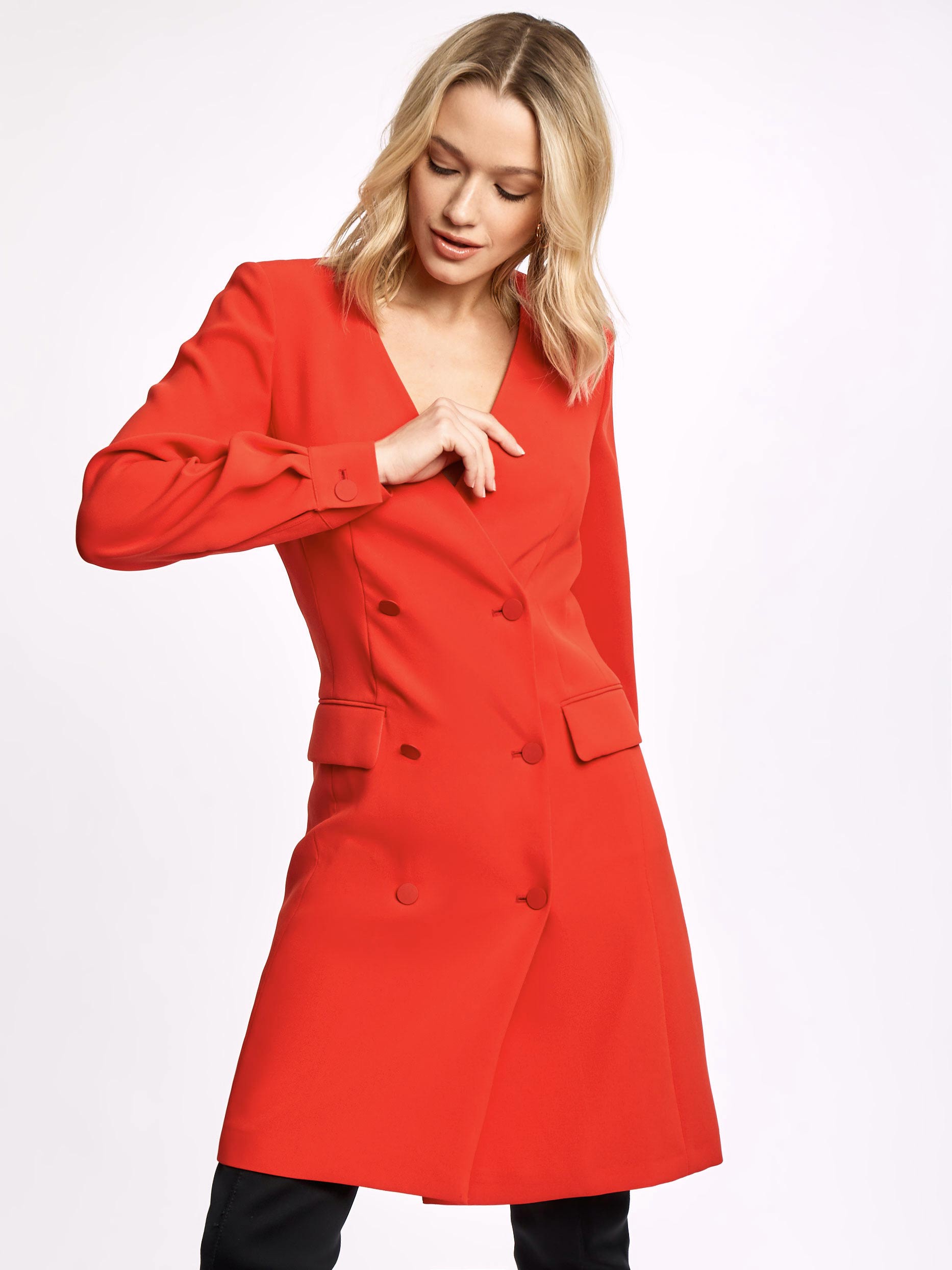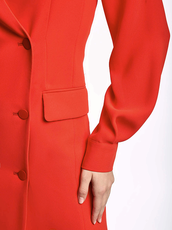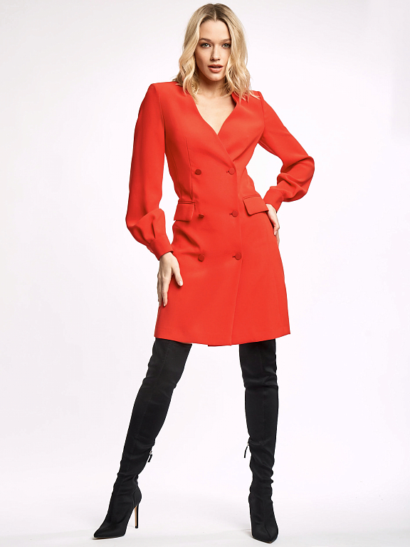 Однотонное двубортное платье длины мини. Длинные объемные рукава с манжетами на пуговицах, карманы с клапанами, V-образный вырез, подкладка. Застегивается на два ряда крупных пуговиц в цвет ткани.