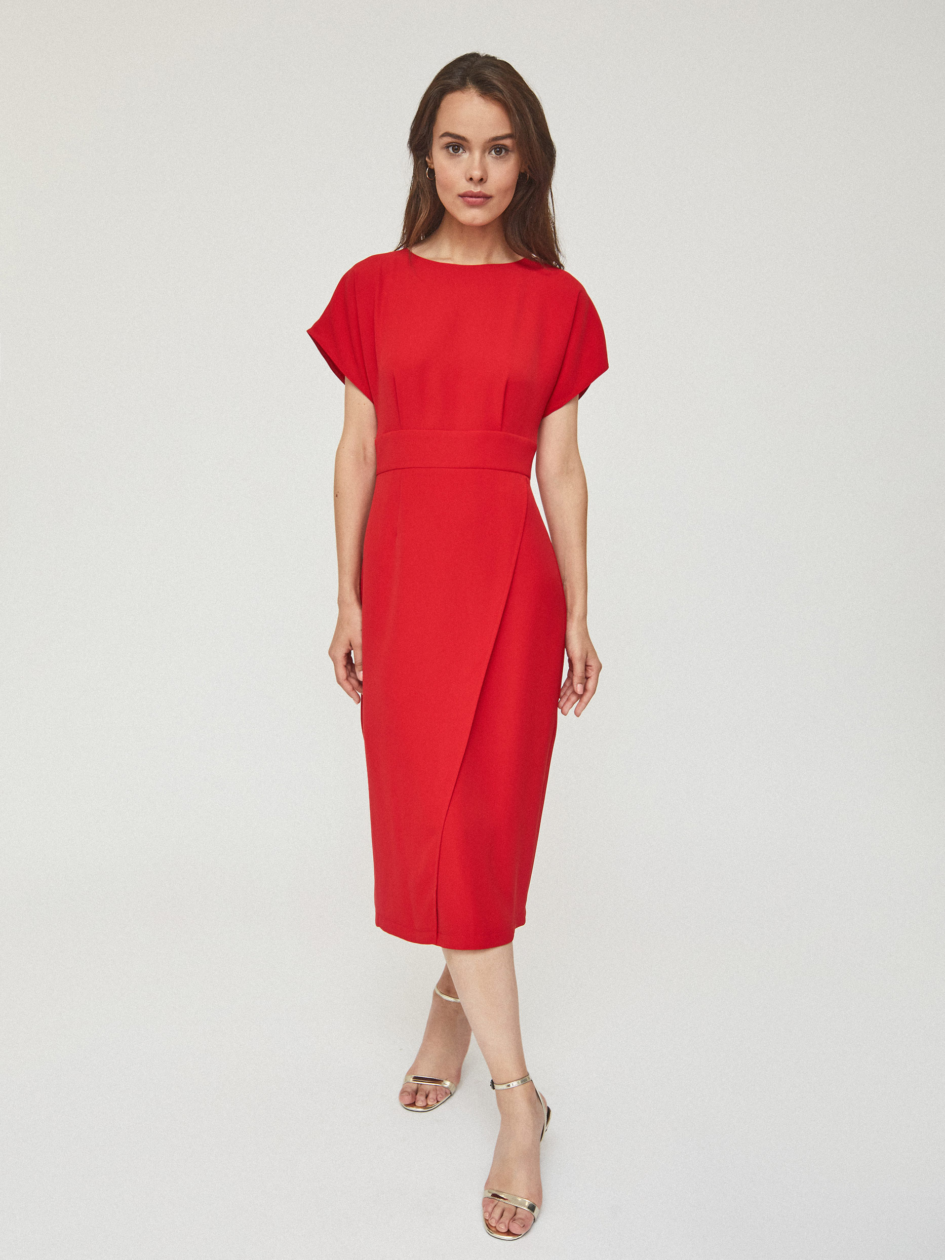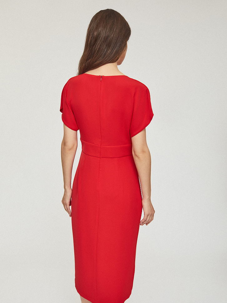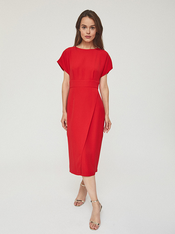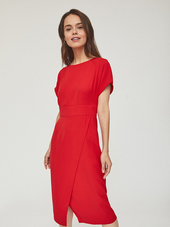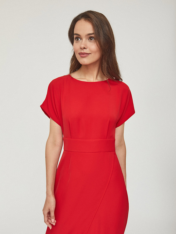 Платье приталенного кроя, изготовленное из струящейся ткани. Запах, идущий от талии по левой ноге. Округлый вырез, свободные рукава, застежка на молнию.