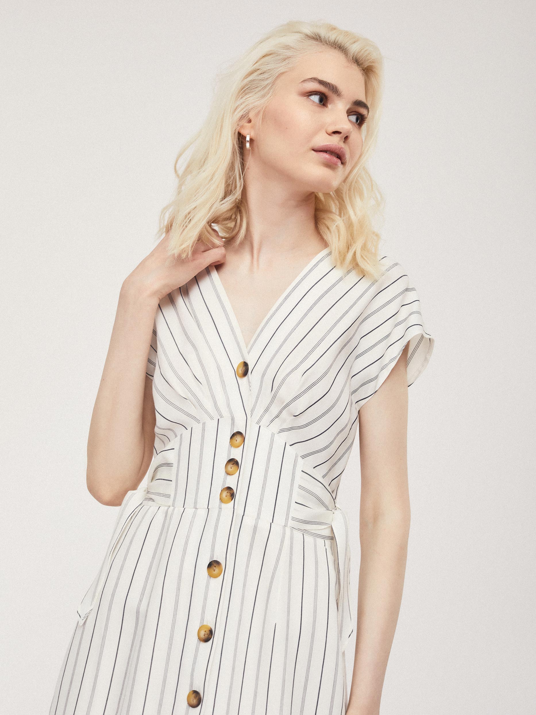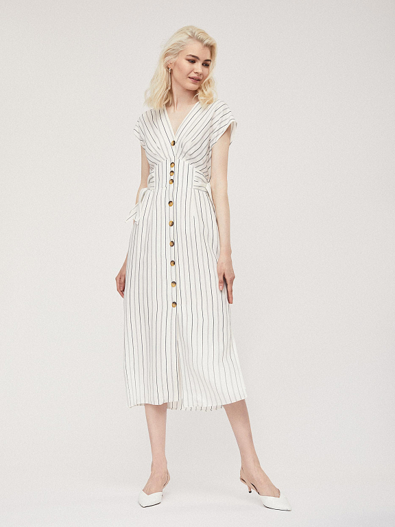 Платье приталенного силуэта с V-образным вырезом, декоративными элементами на талии и застежкой на ряд контрастных пуговиц.