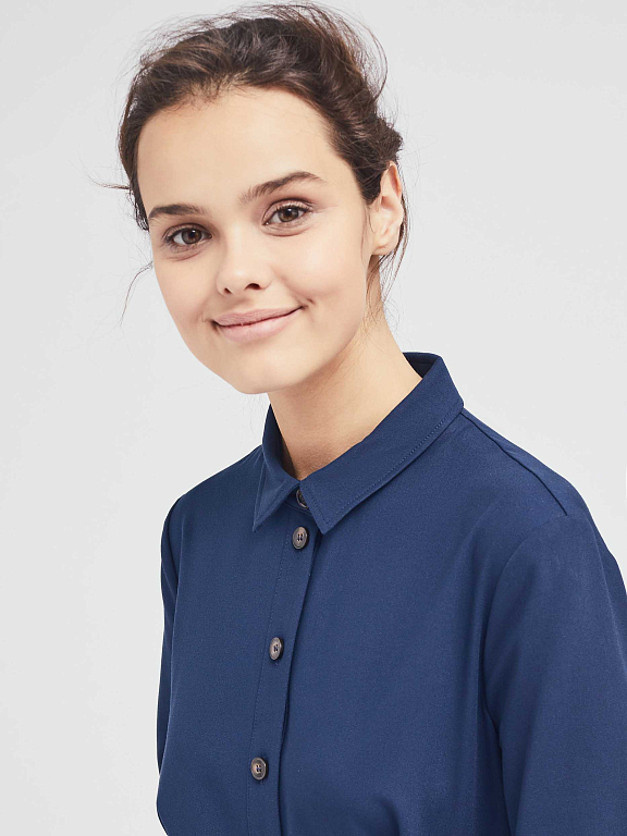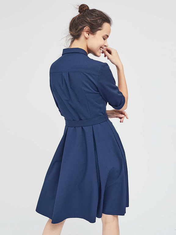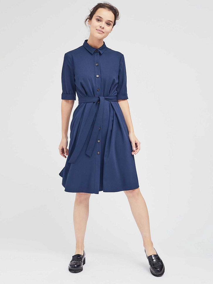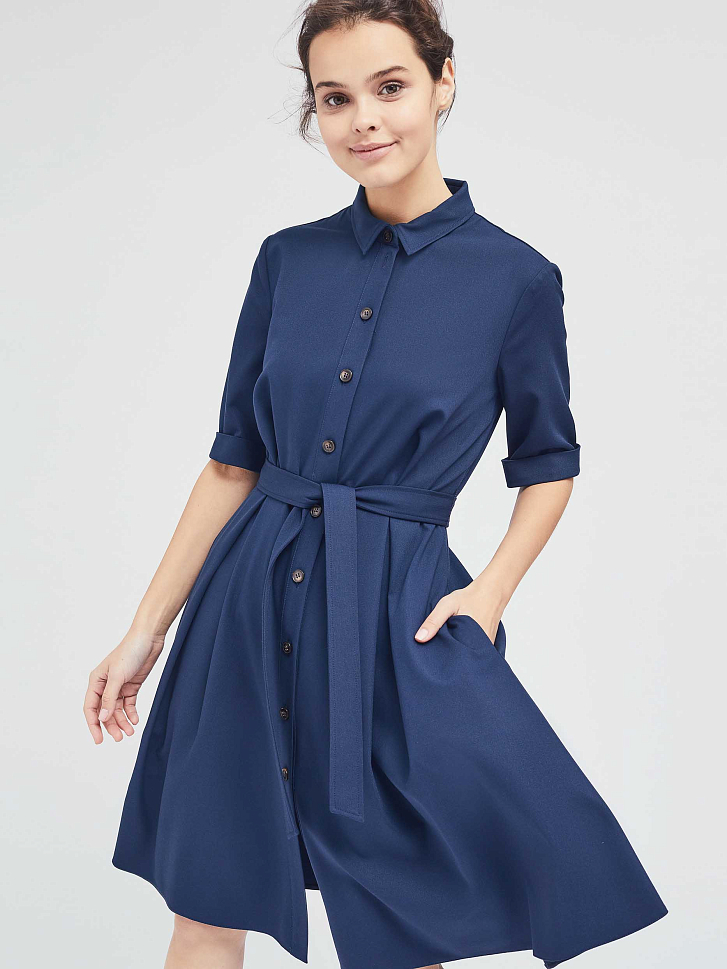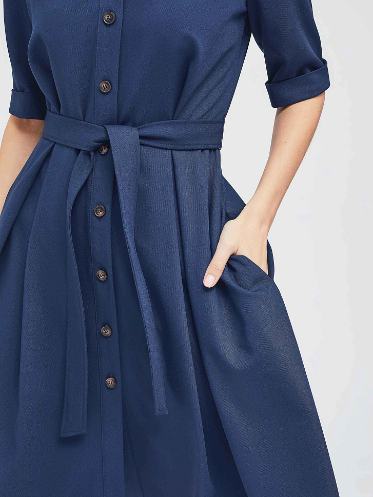Платье-рубашка приталенного силуэта с отложным воротником. Изделие на пуговицах спереди и поясом на талии. Рукава длиной до локтя с зашитыми отворотами. Платье с карманами в боковых швах. На спинке кокетка. Изделие без подкладки.  Рост модели 172 см, размер 42 (российский)