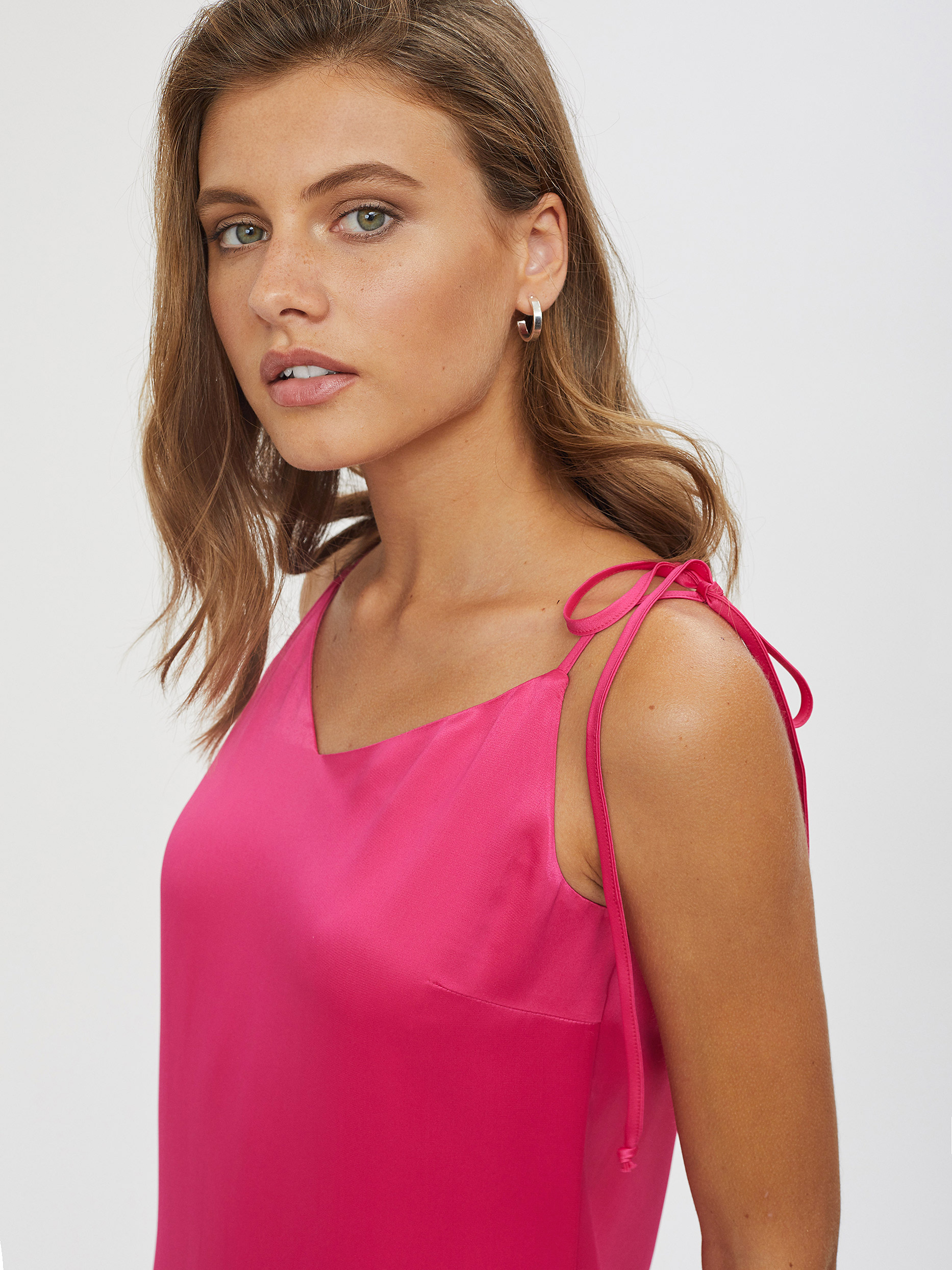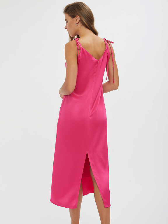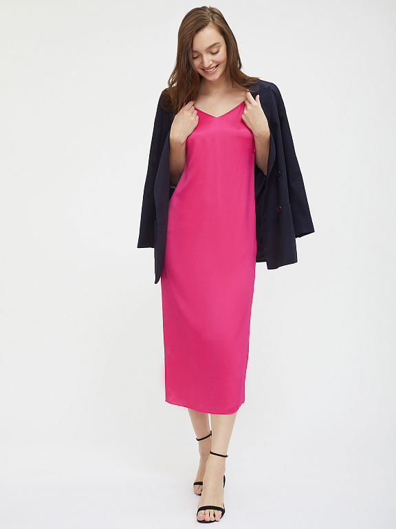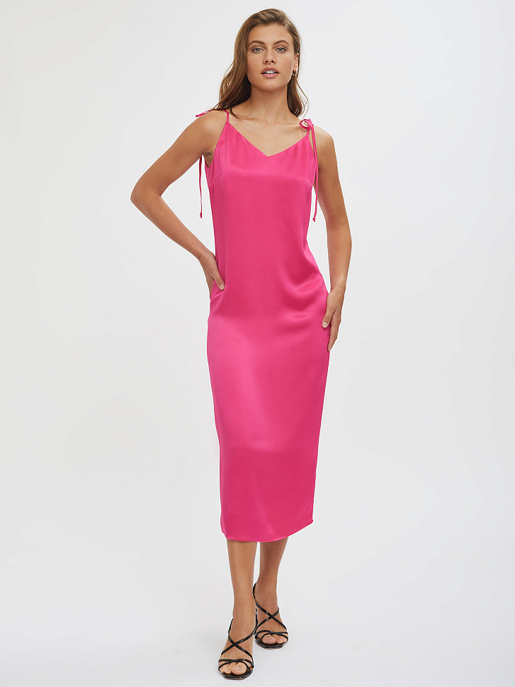 Однотонное платье из струящейся ткани на бретелях. Прямой силуэт, треугольный вырез, шлица, подклад.