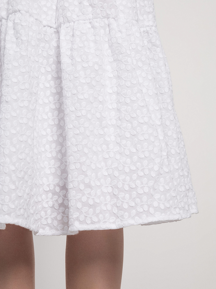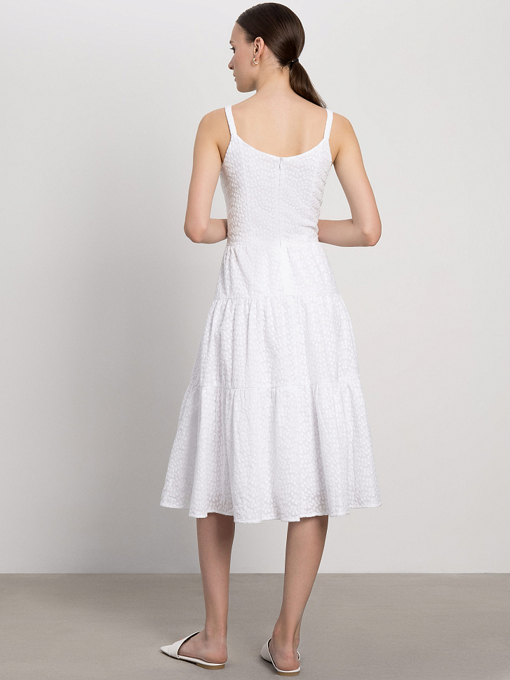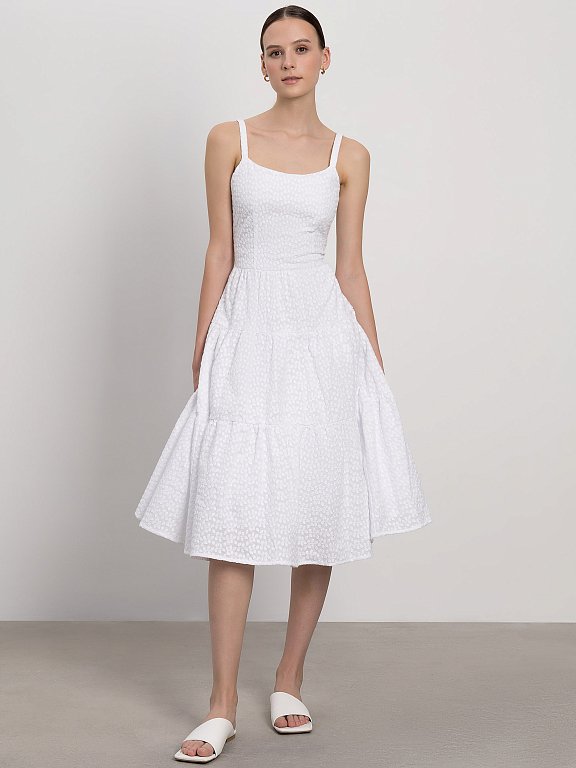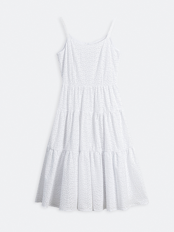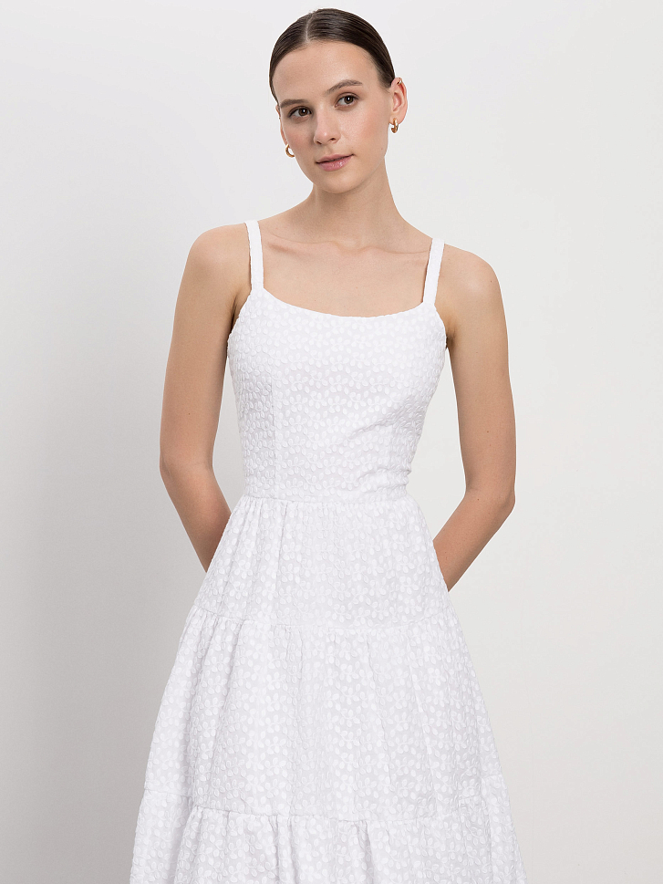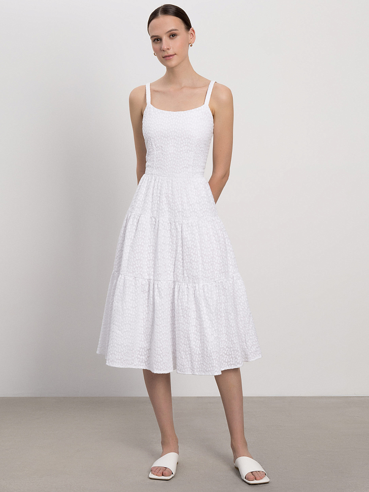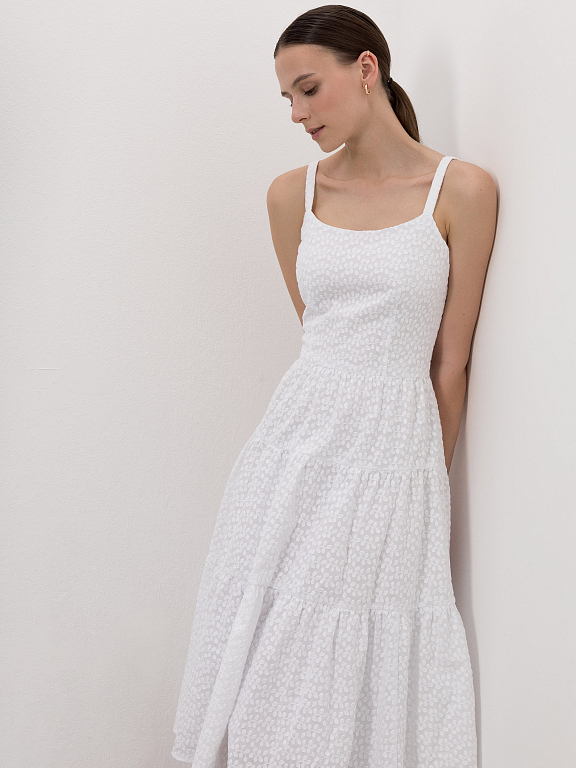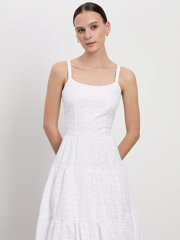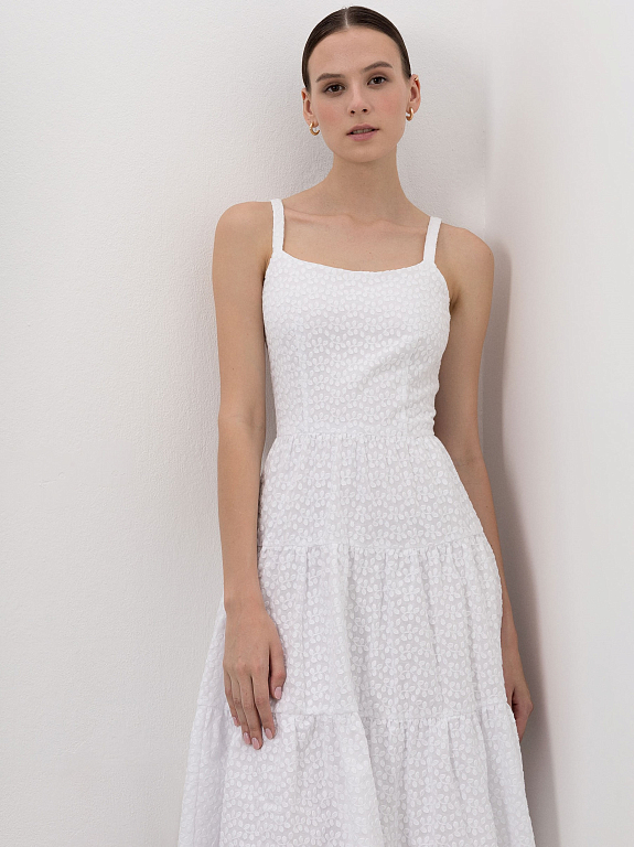 Сарафан с ажурным узором идеально подойдет для летних дней в городе или на отдыхе. Женственность и романтичность модели придают приталенный силуэт и летящая юбка с оборками. За комфорт отвечает материал: платье сшили из легкого дышащего хлопка.