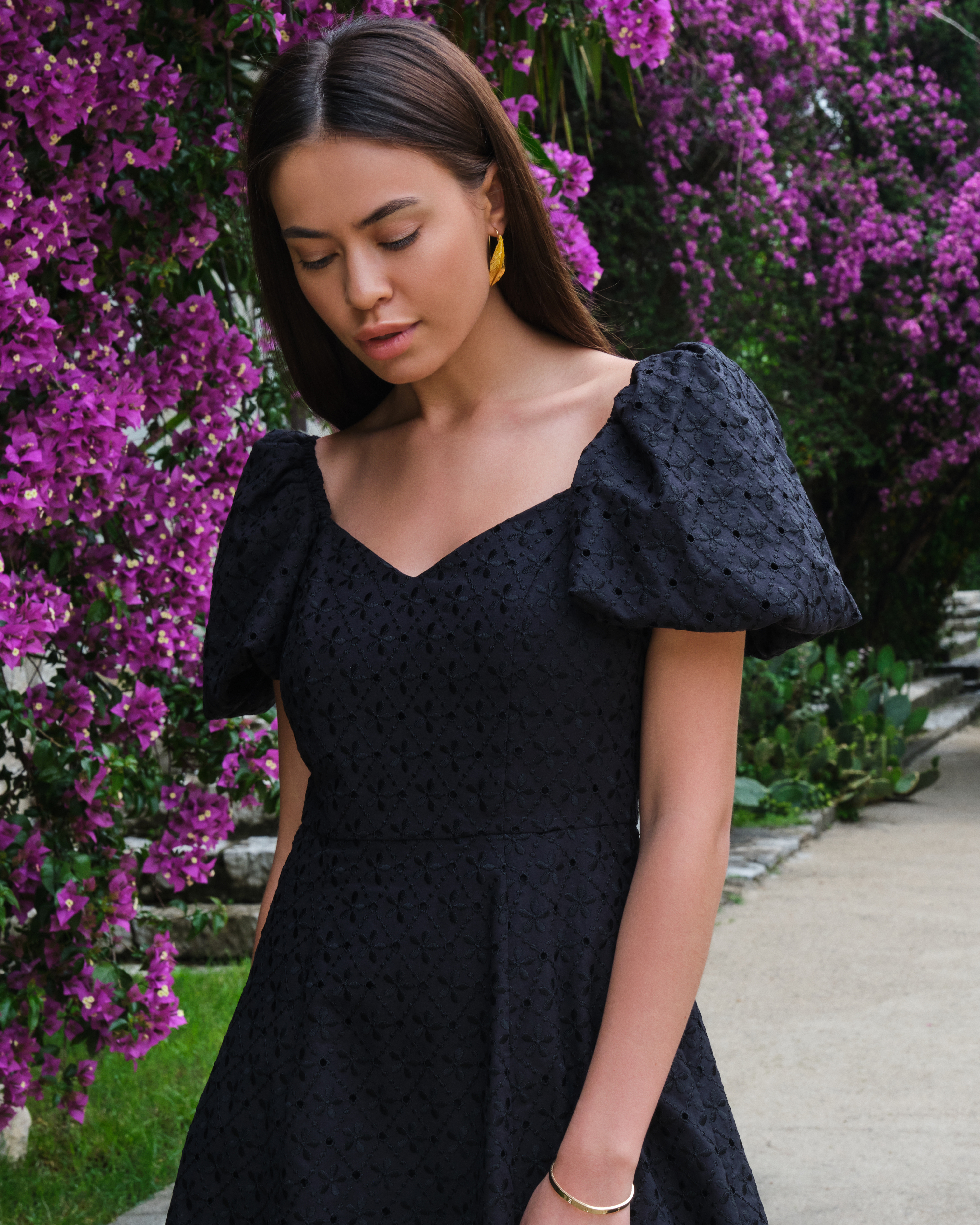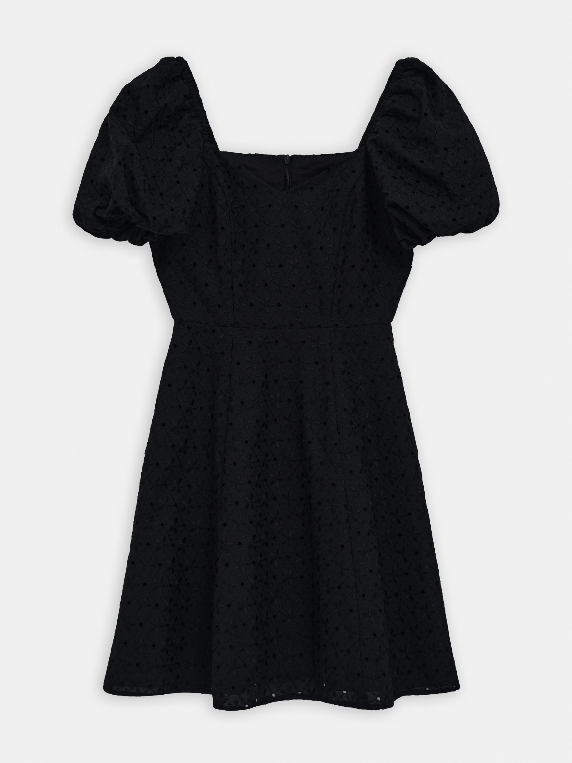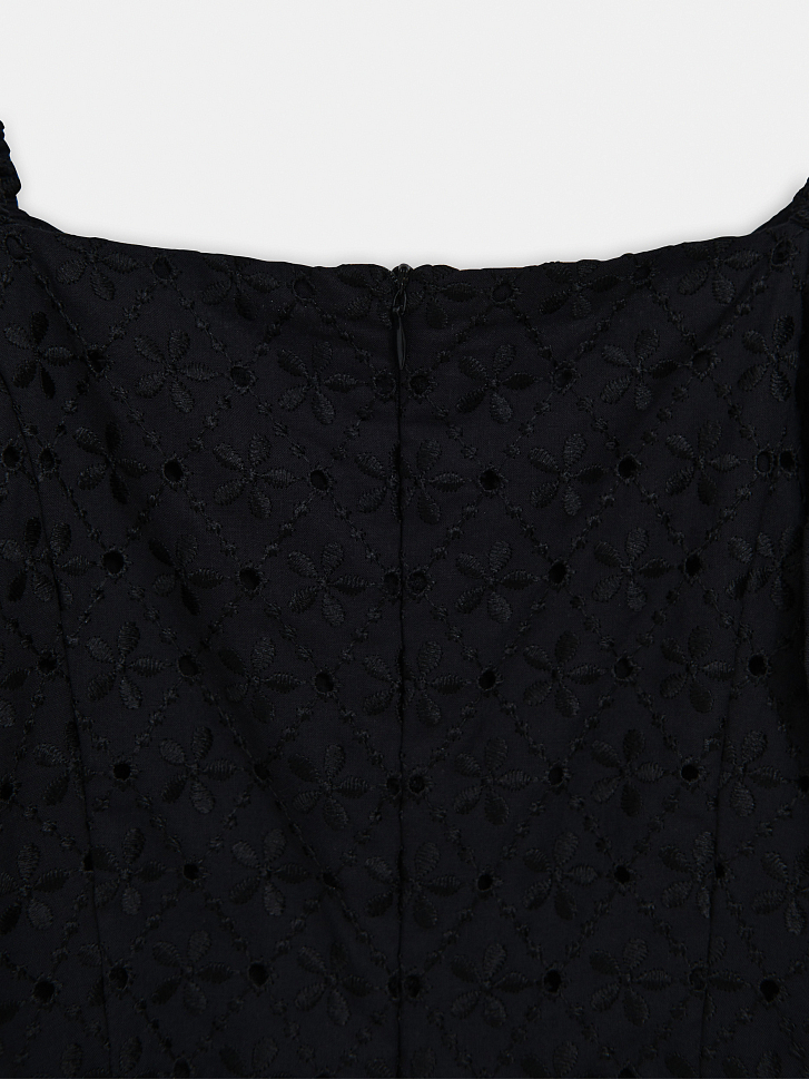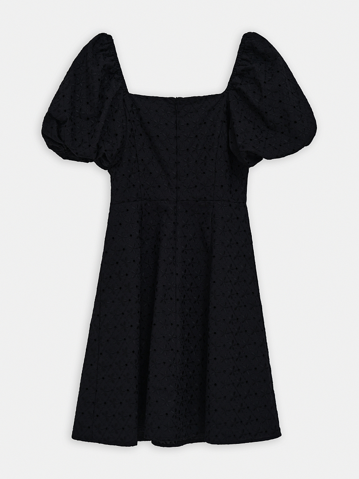 Короткое летнее платье – как воплощение легкости и беззаботности. Тонкий хлопковый текстиль расшит цветочной английской вышивкой, а чтобы ткань не просвечивала, мы продублировали её подкладом из хлопка. Приталенное платье с короткими рукавами буфами дополнено потайной молнией сзади для комфортной посадки.