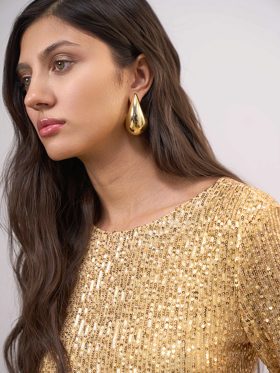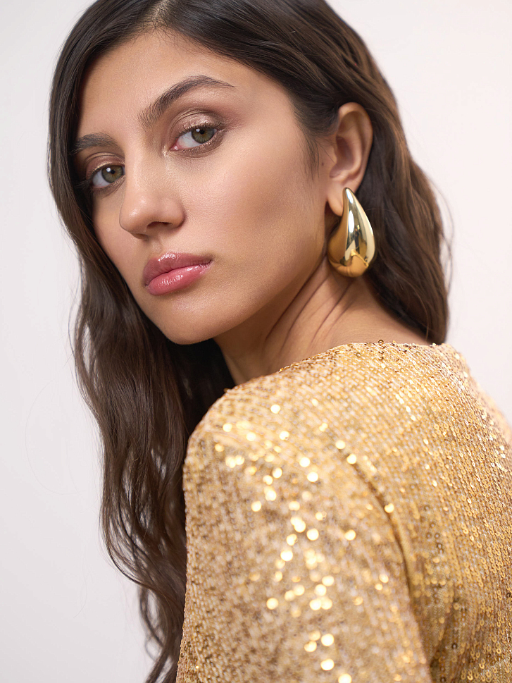 Длинное облегающее платье гарантирует поток комплиментов. Сшитое из тонкой эластичной сетки, оно украшено россыпью сверкающих пайеток, а чтобы сохранить кожу от их колкости – продублировано капроновой подкладкой. Деликатная ткань требует бережного обращения.