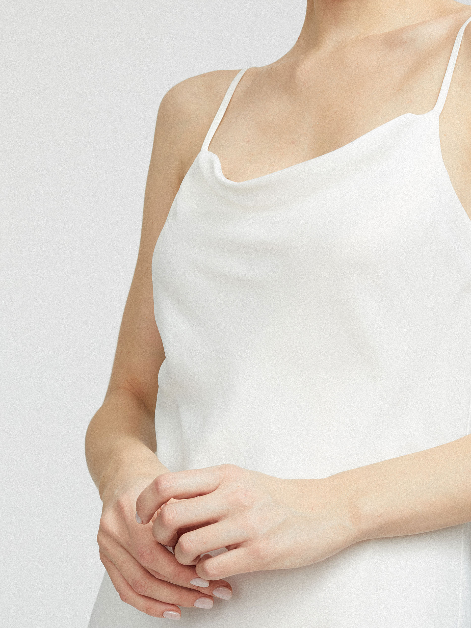 Однотонная комбинация длины миди из струящейся ткани. Приталенный силуэт, тонкие бретели, вырез с драпировкой, подклад.