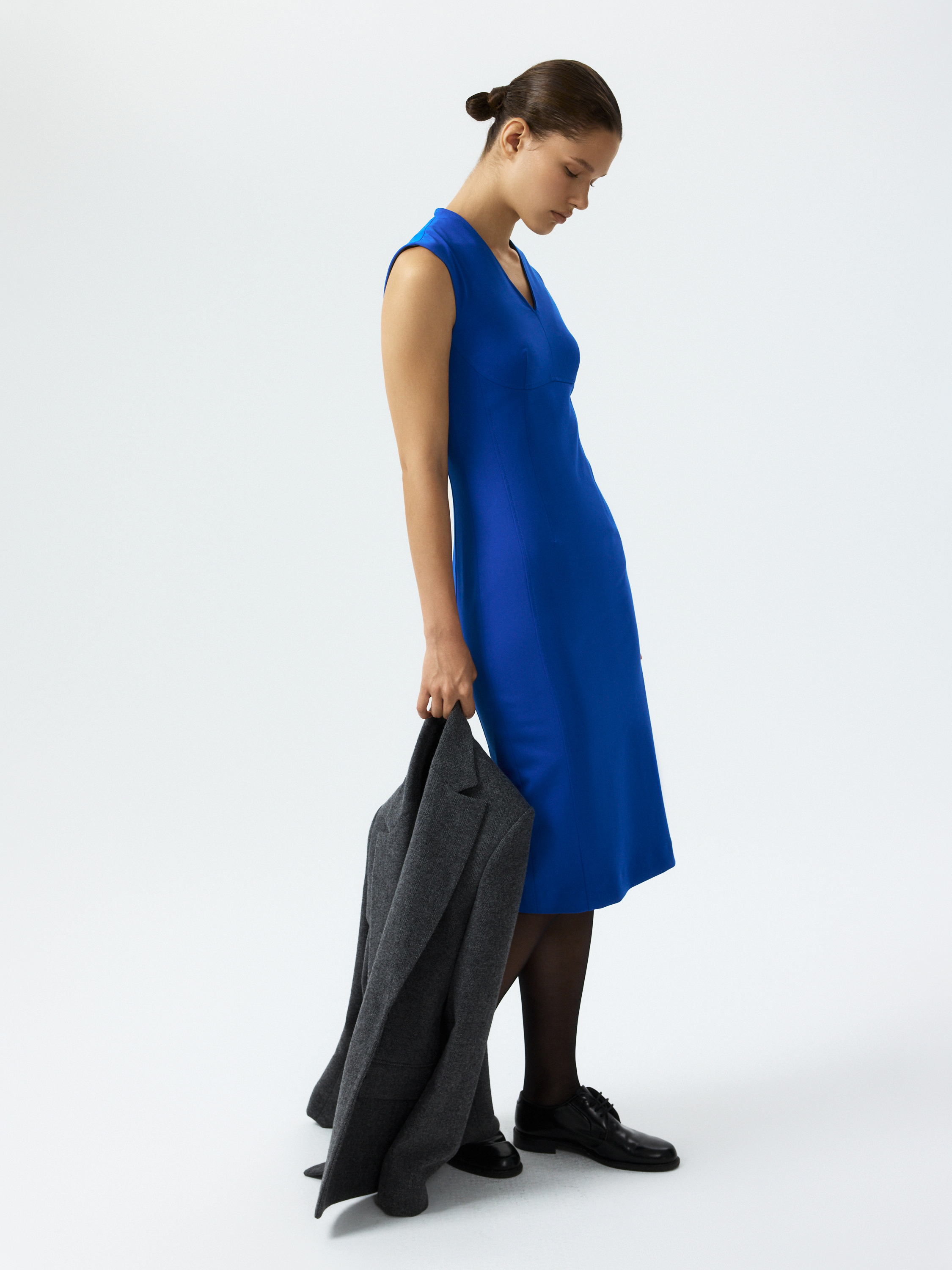 Лаконичный крой платья-футляр лишен каких-либо декоративных элементов и разбавлен лишь акцентными вытачками на лифе. Облегающую модель сшили из плотного текстиля, который не тянется и выигрышно подчеркивает форму силуэта. Такое платье понравится любителям минимализма и будет уместно как в дневном, так и в вечернем образе.
