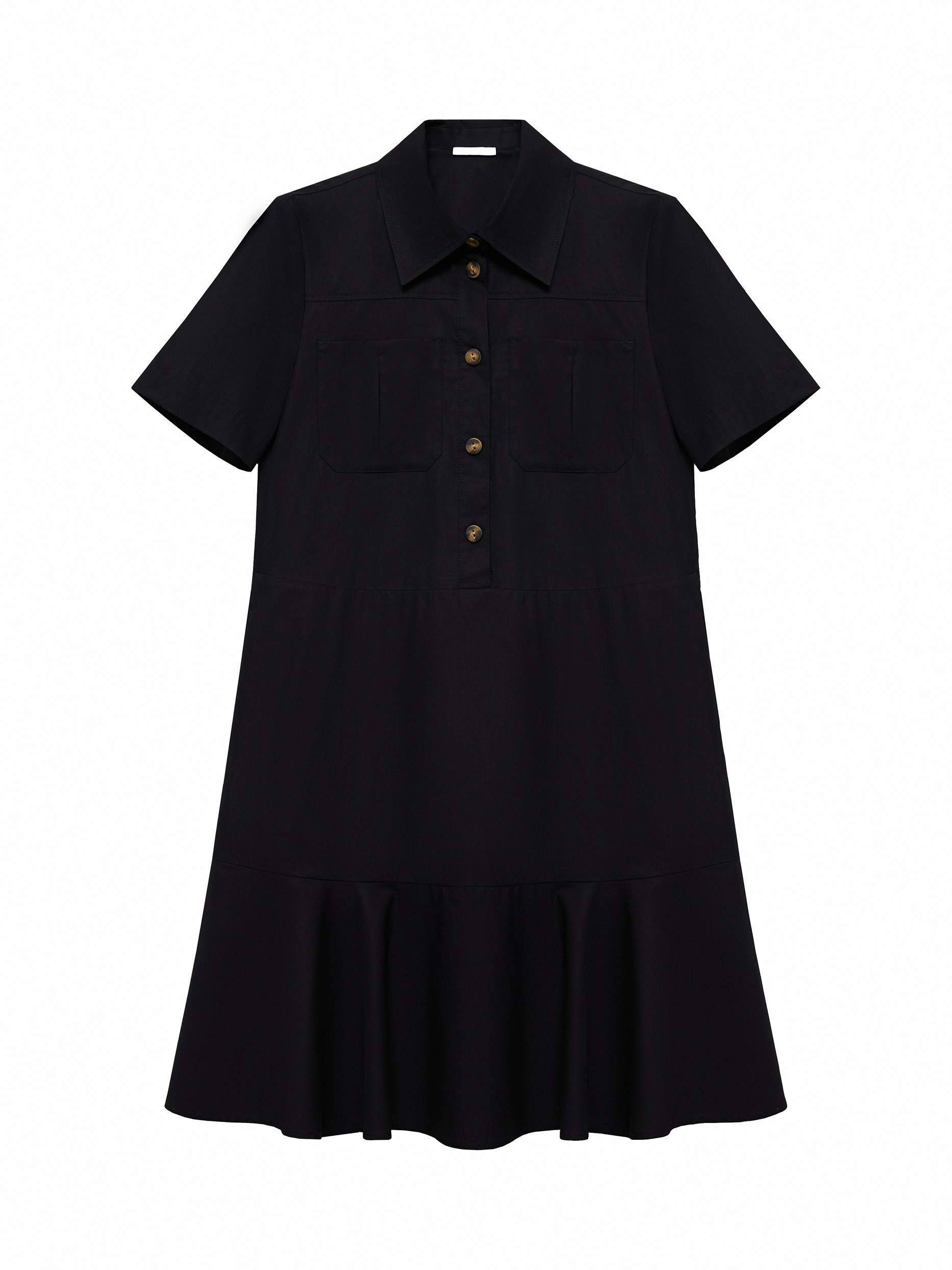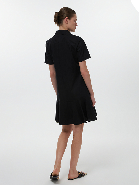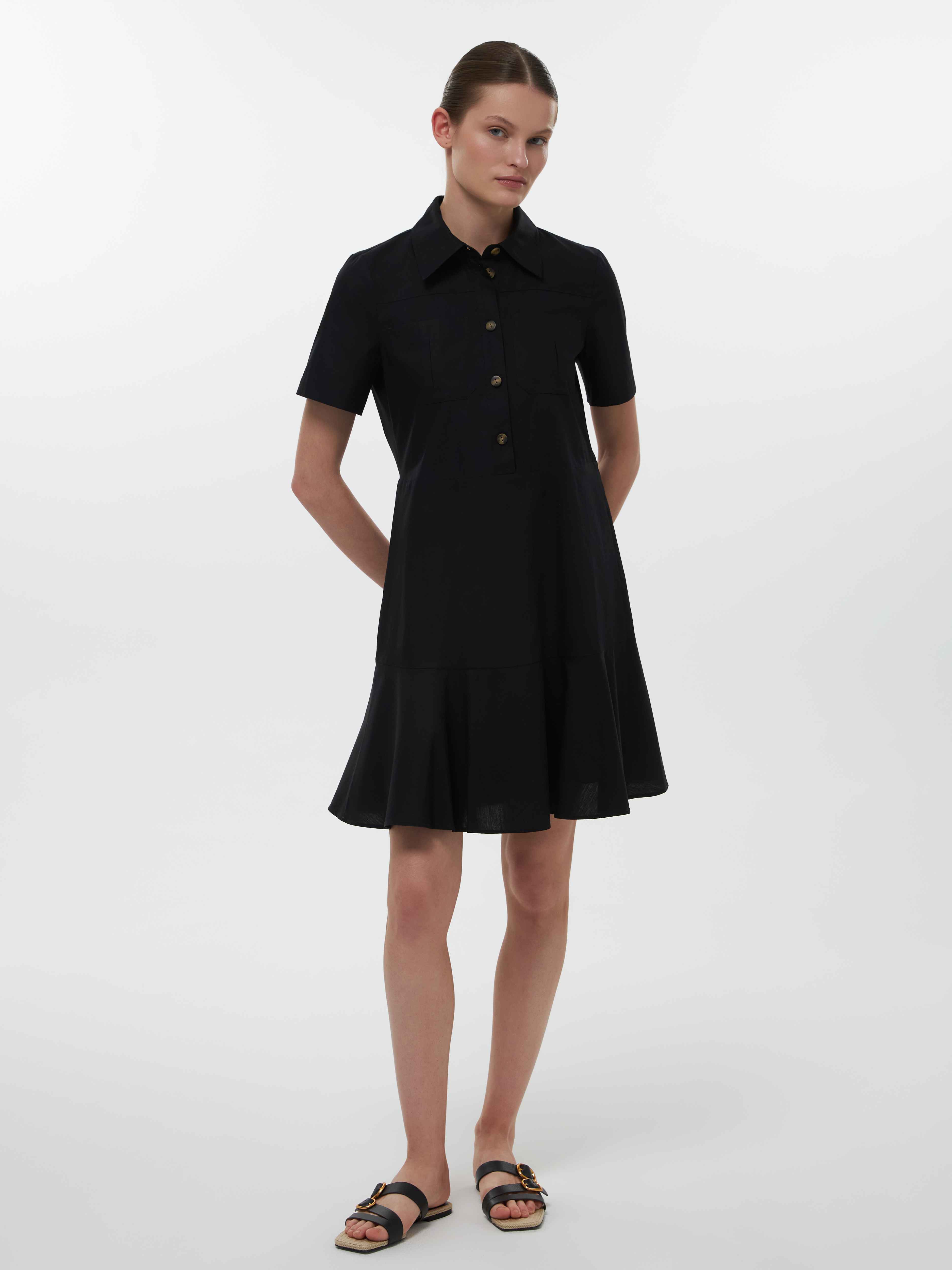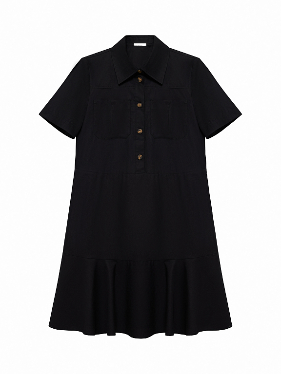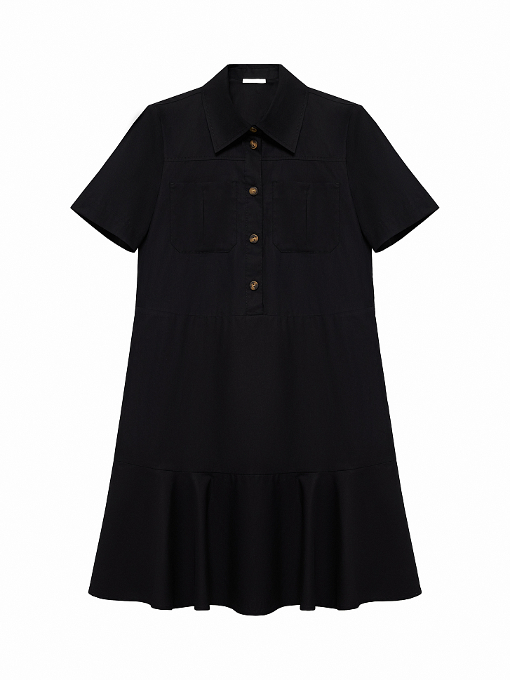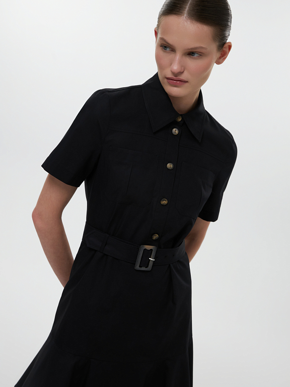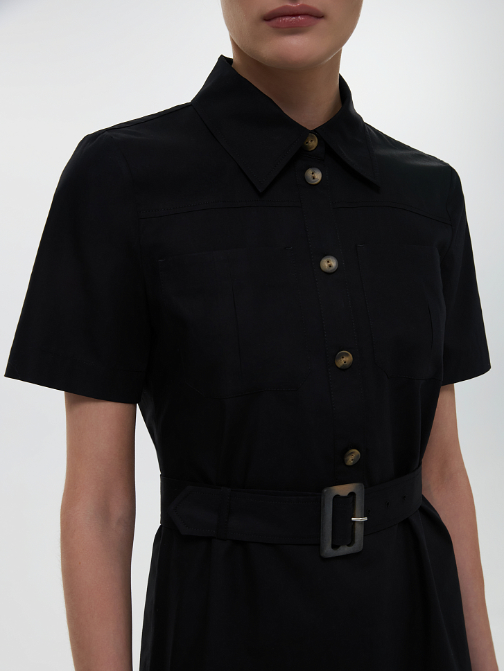 Платье с короткими рукавами и накладными карманами соответствует эстетике сафари. Тонкий дышащий поплин из натурального хлопка хорошо пропускает воздух, а для комфортной посадки продублирован подкладкой на юбке. Платье прямого кроя можно подчеркнуть на талии при помощи пояса.