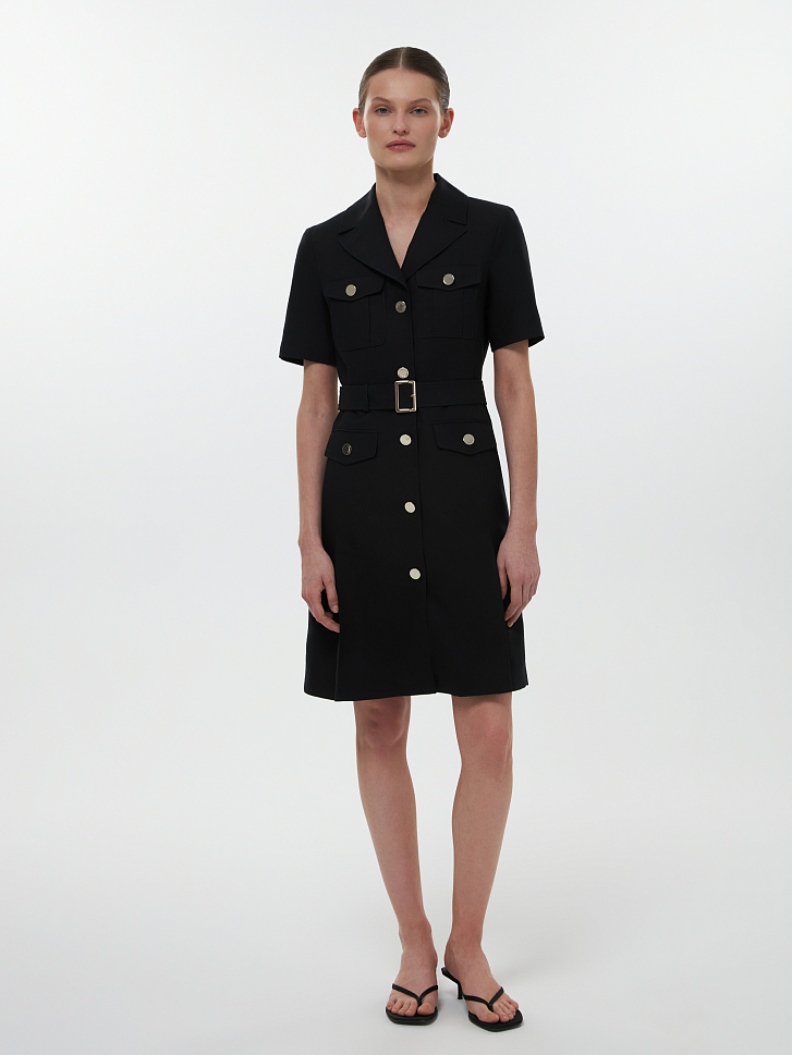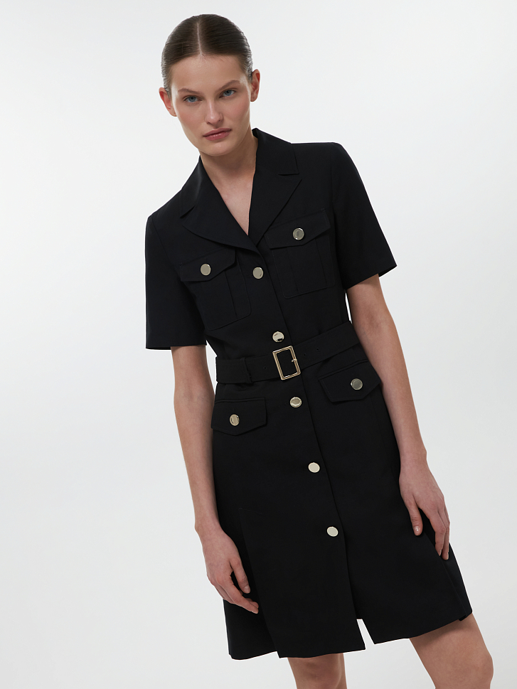 Платье-сафари с короткими руками станет базой летнего гардероба. Для модели выбрали ткань из смеси тенселя и льна, в которой будет комфортно – она прочная и хорошо сохраняет форму. Лаконичный приталенный крой легко дополнить акцентной обувью и аксессуарами.