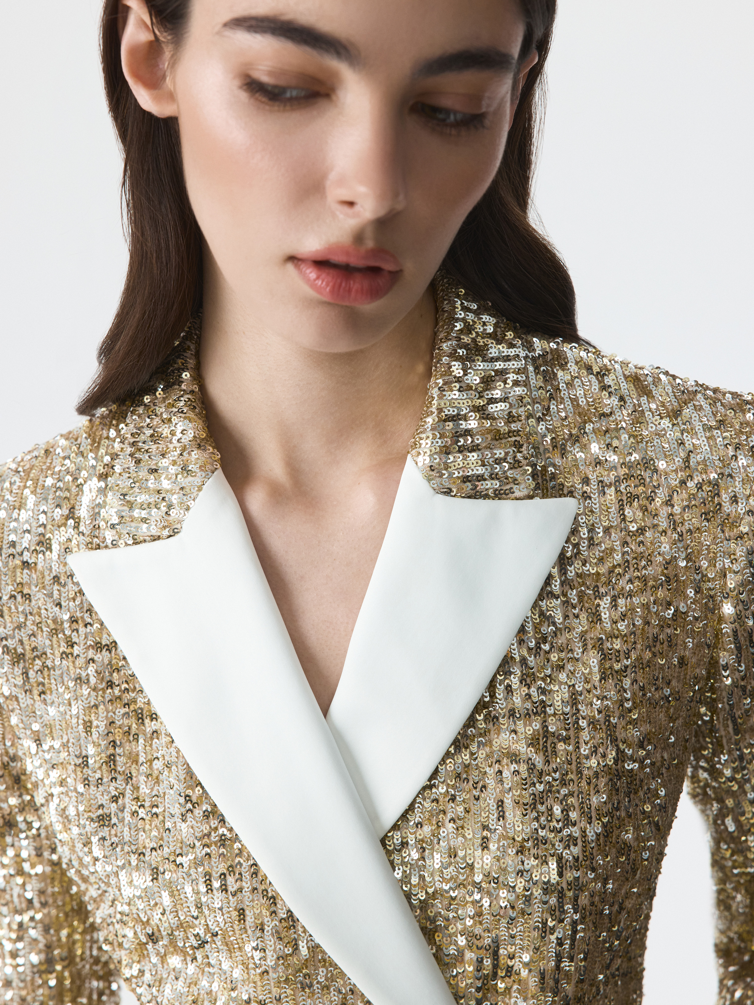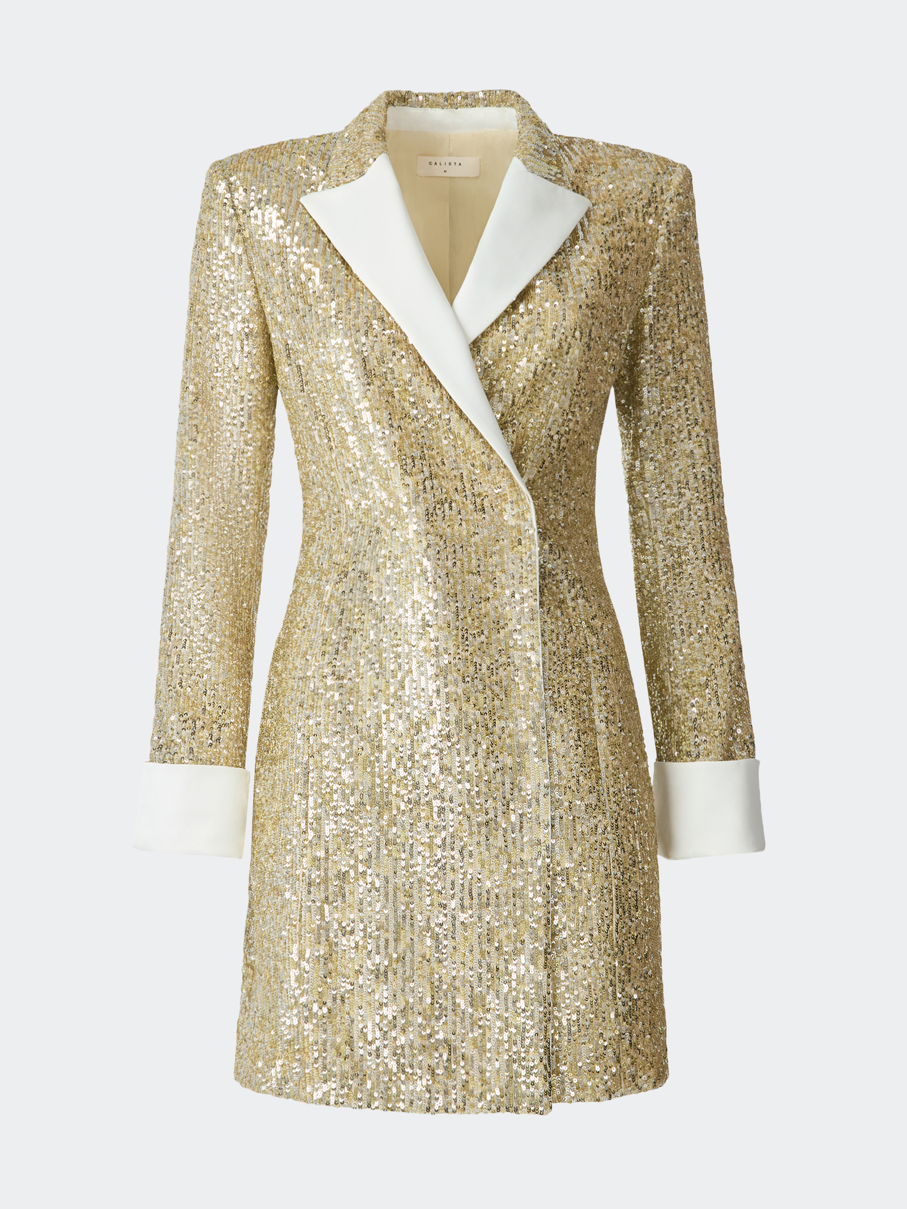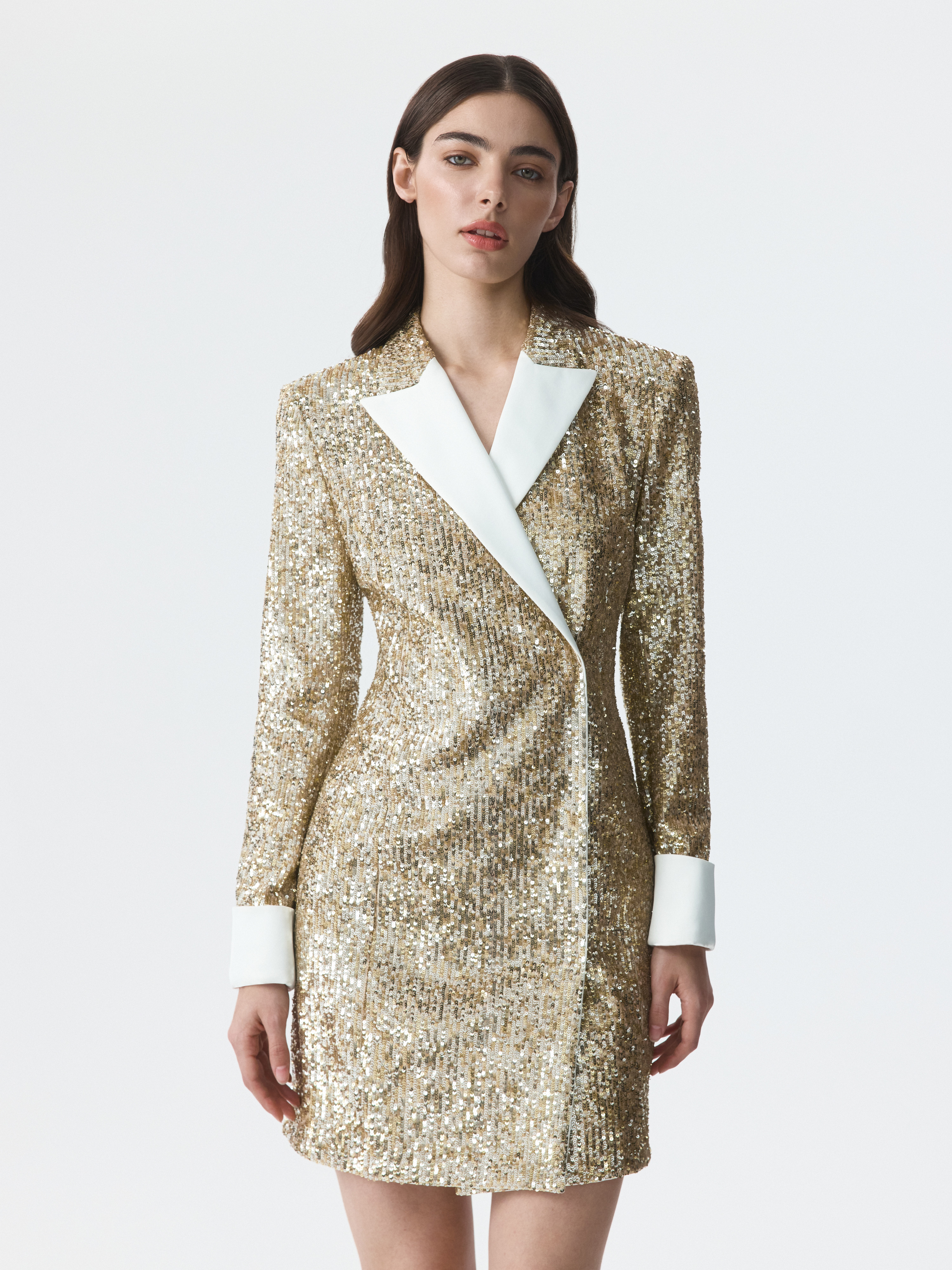 Платье в стиле смокинга с акцентными плечами станет эффектным выбором для особенных поводов. Праздничный тон модели задают сверкающие пайетки и атласные лацканы. Плотный текстиль не тянется и не мнется, а гладкая подкладка гарантирует комфортное прилегание.