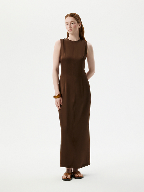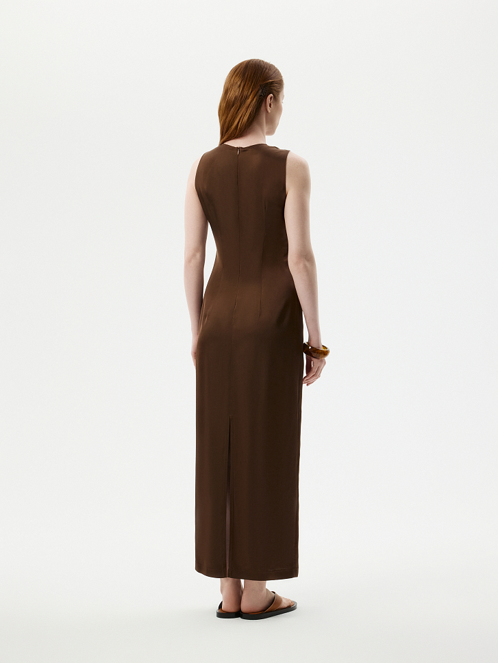 Лаконичное атласное платье станет фоном для модных экспериментов с обувью и аксессуарами. Легкий шелковистый текстиль комфортно струится вдоль тела и не просвечивает даже без подкладки. Чтобы длинное платье не сковывало шаг, сзади предусмотрели разрез.
