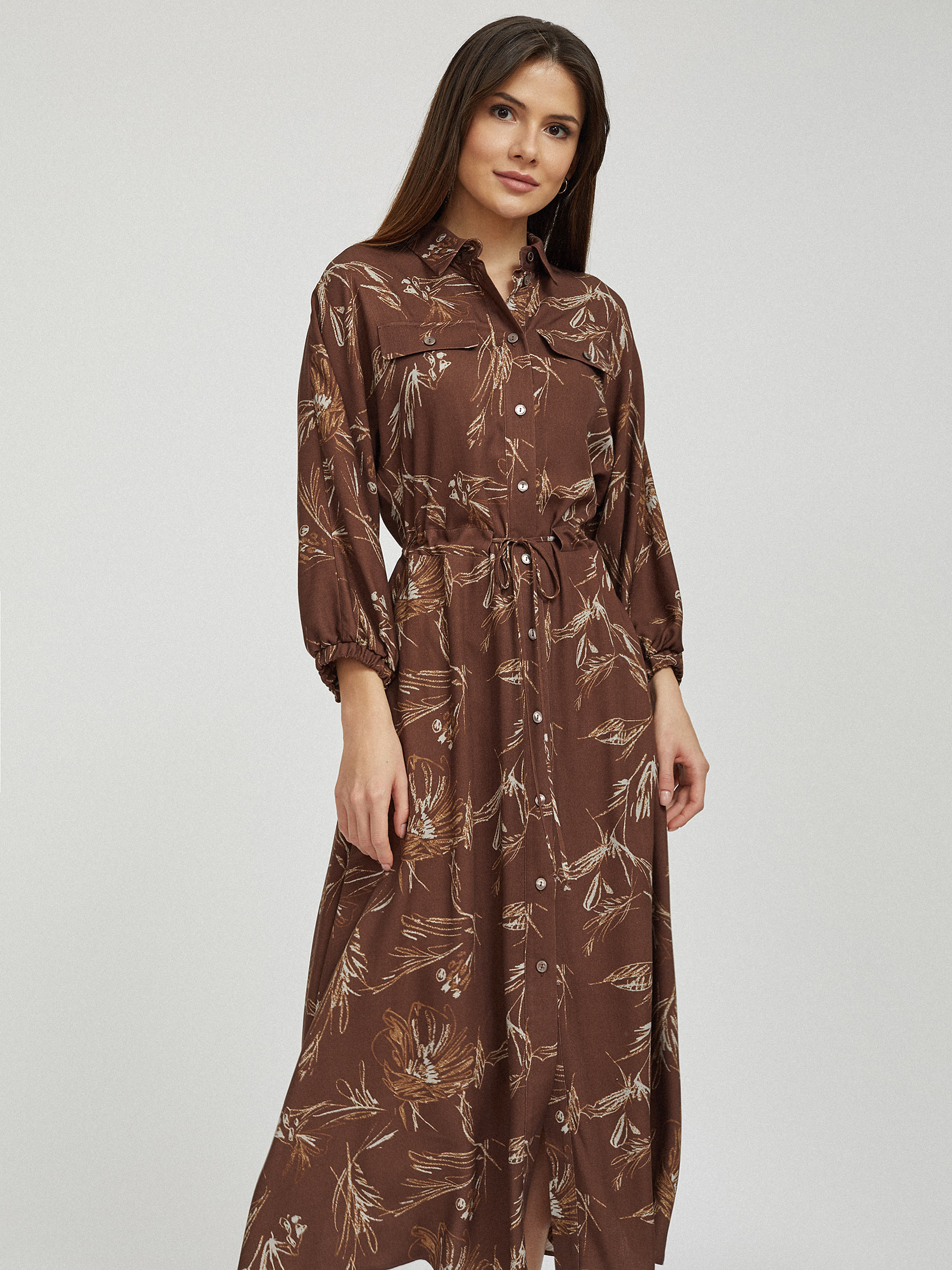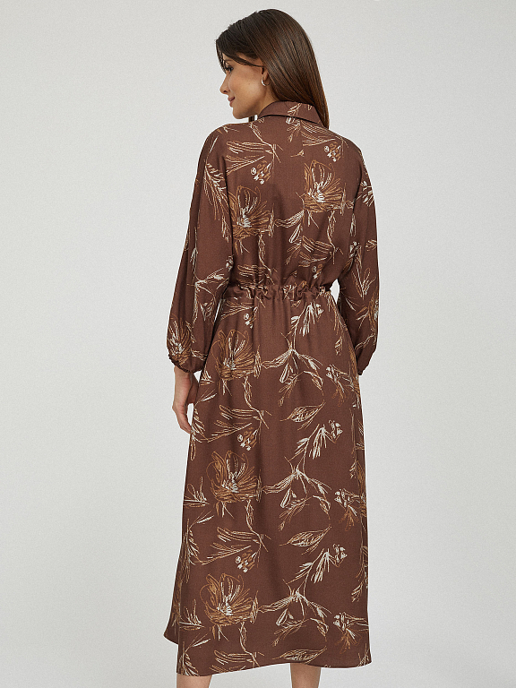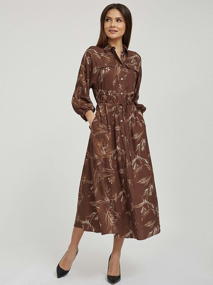 Платье на кулиске, выполненное из мягкой вискозы. Приталенный крой, принт, классический отложной воротник, объемные рукава с эластичными манжетами, карманы в боковых швах, декоративные нагрудные клапаны.