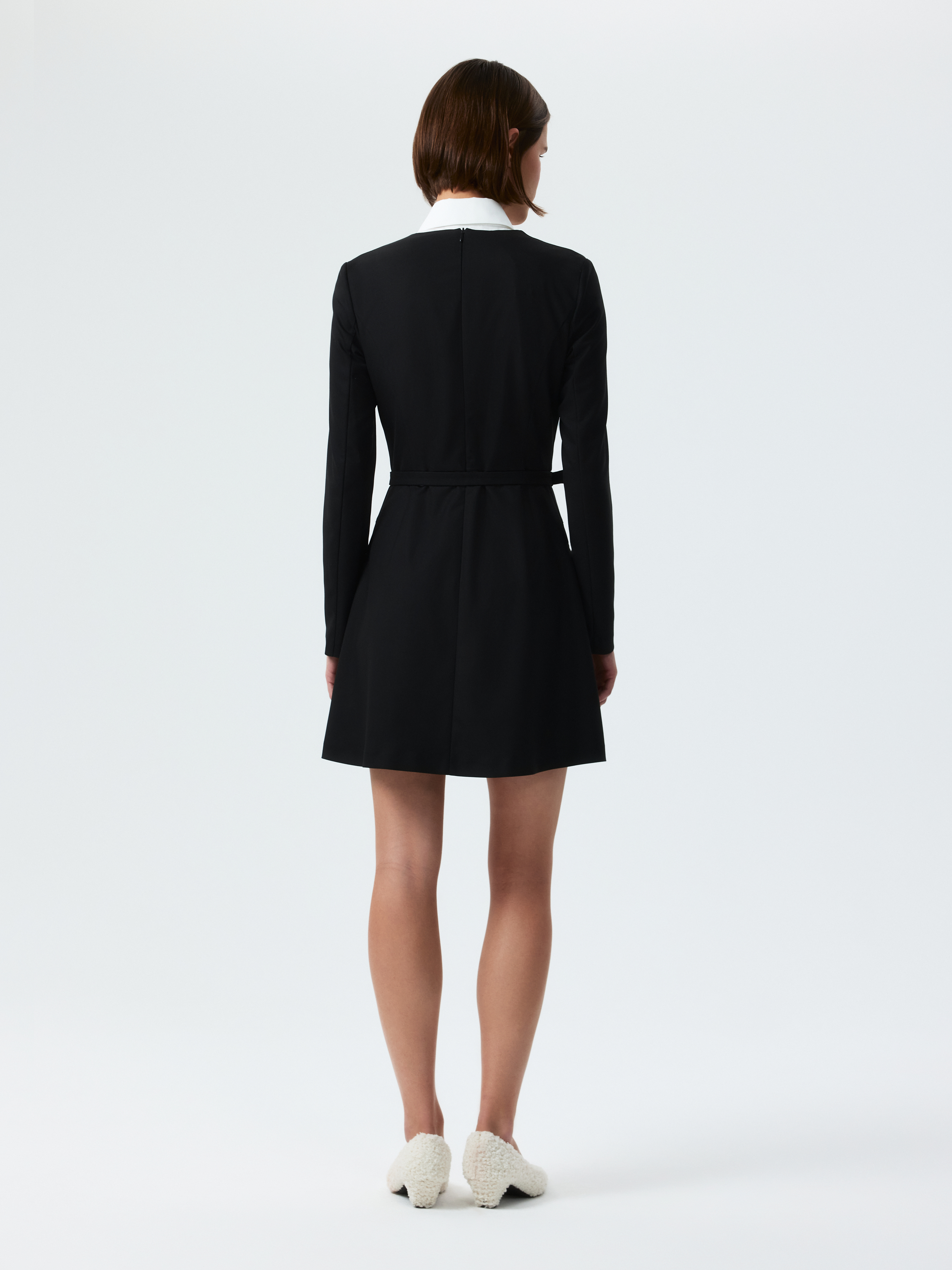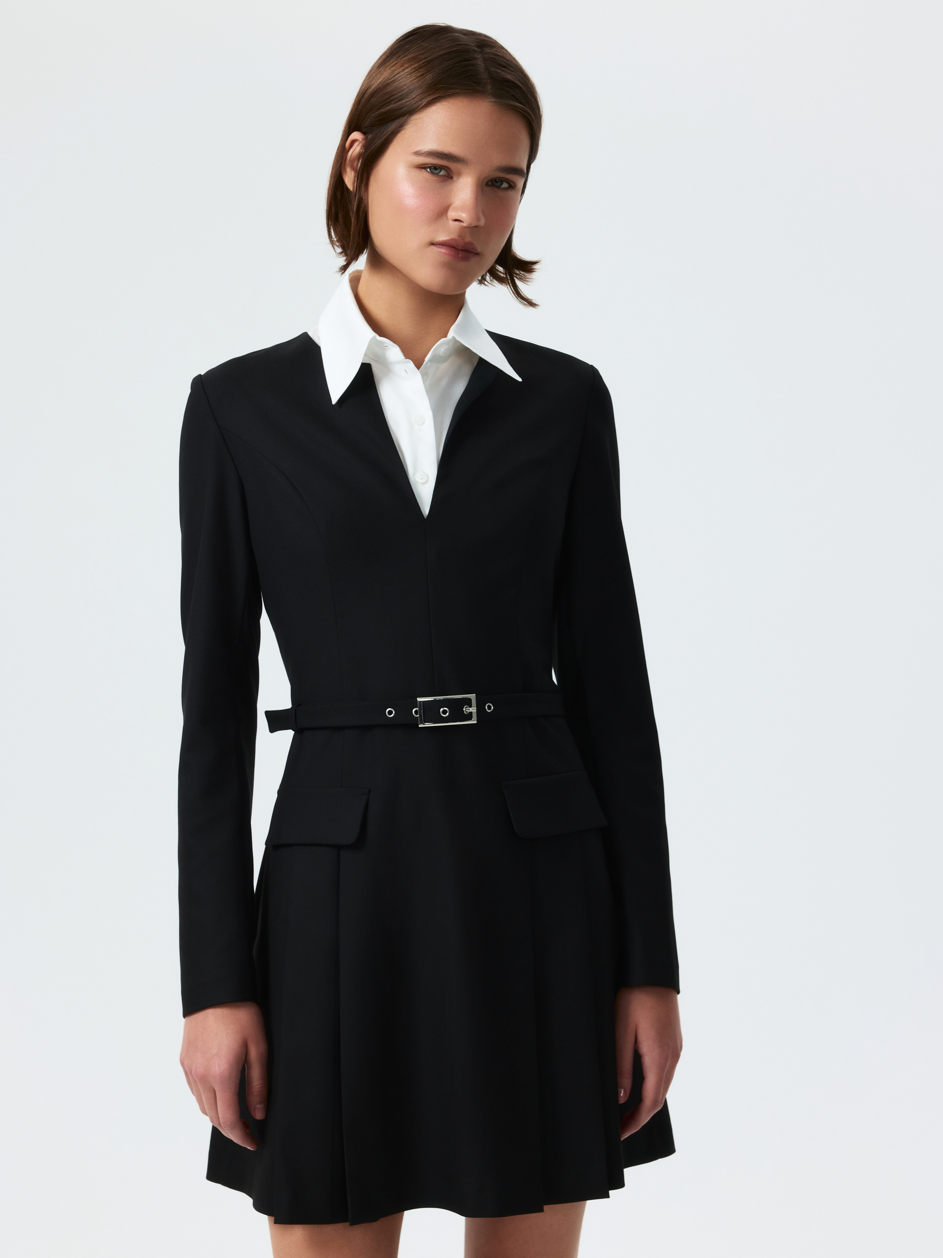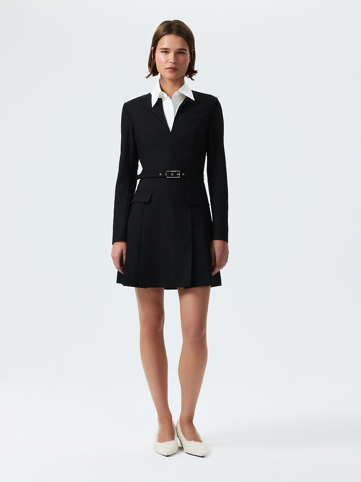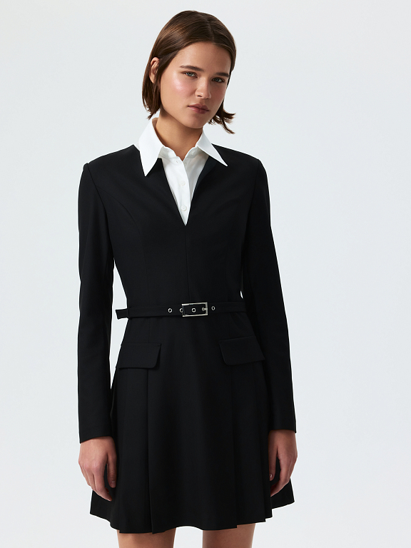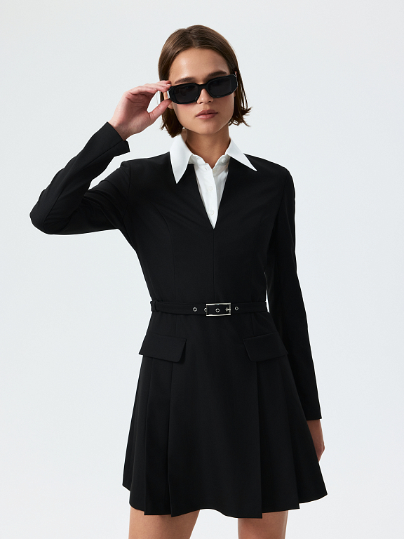 Короткое платье в стиле преппи можно носить на учебу или по особым поводам. Плотный костюмный текстиль из поливискозы не тянется и хорошо держит форму складок на юбке. Съемная манишка из рубашечной ткани создает эффект многослойности.
