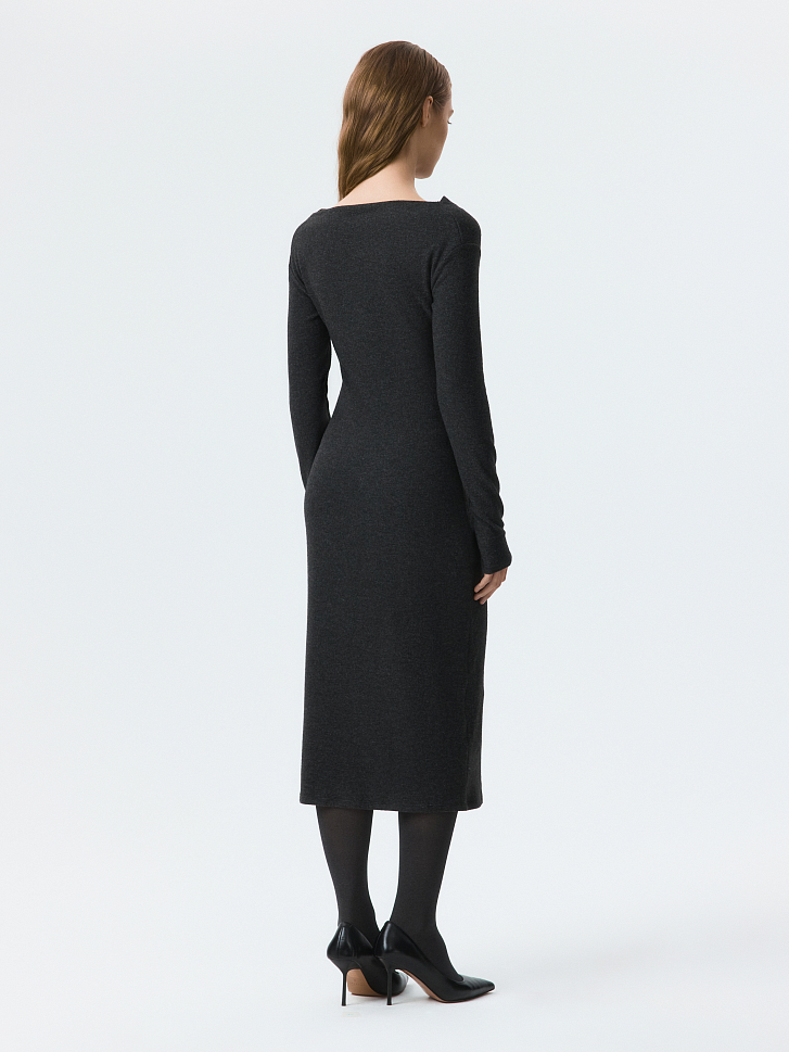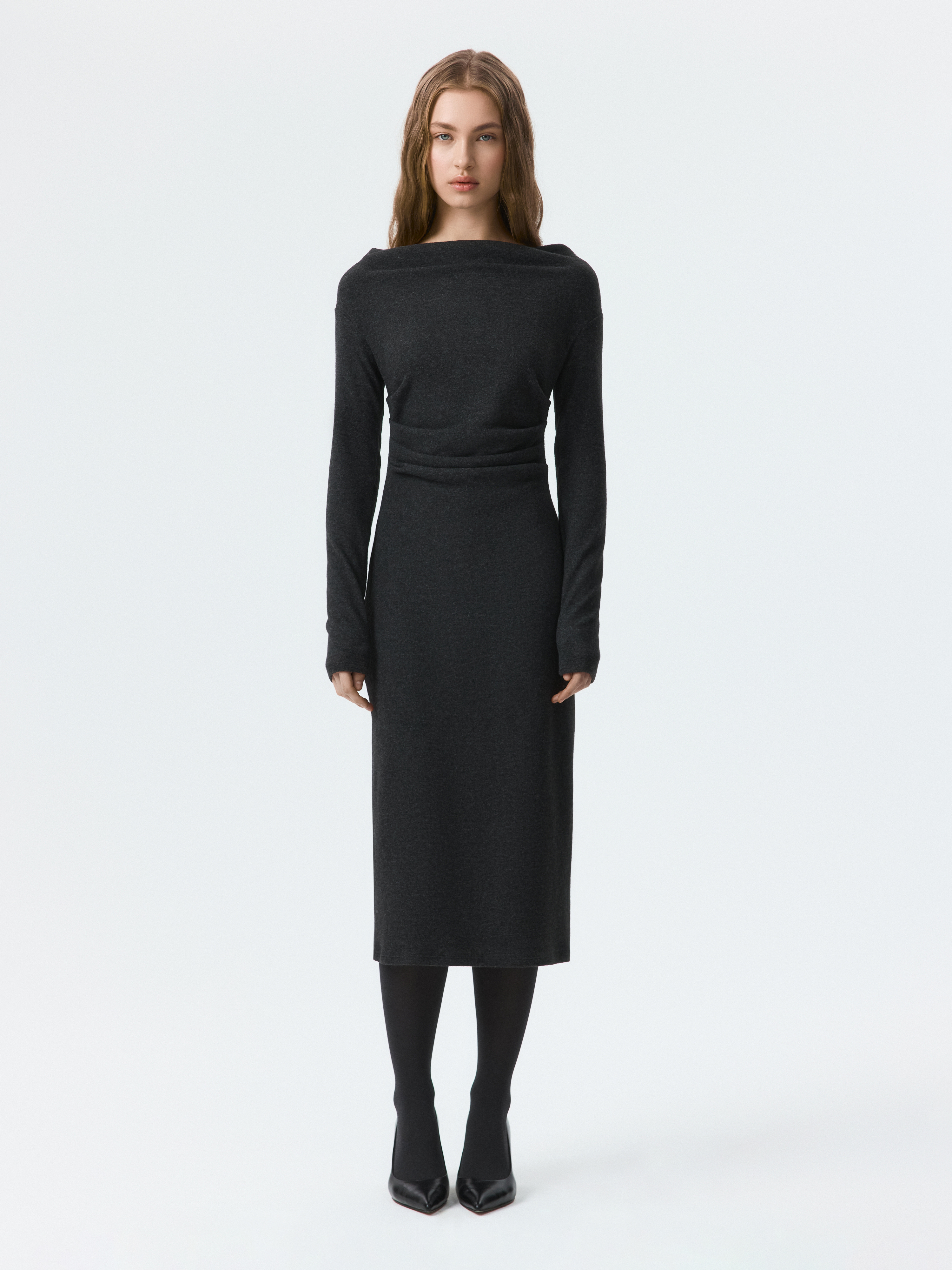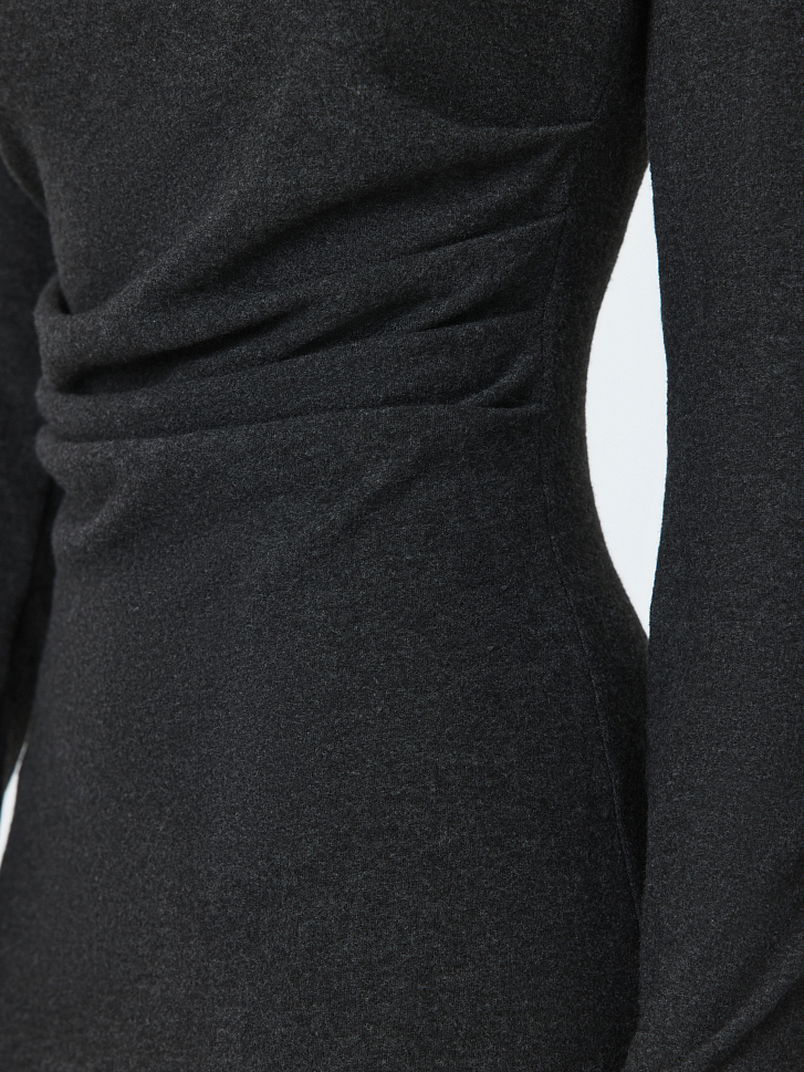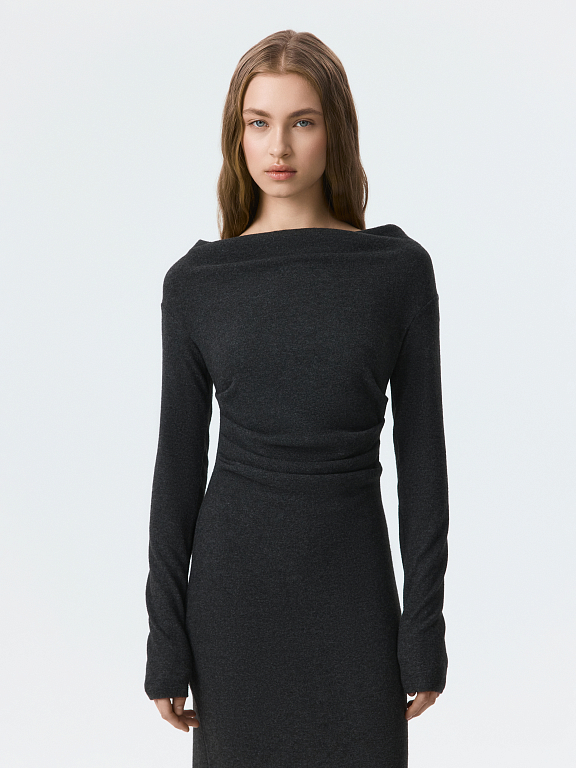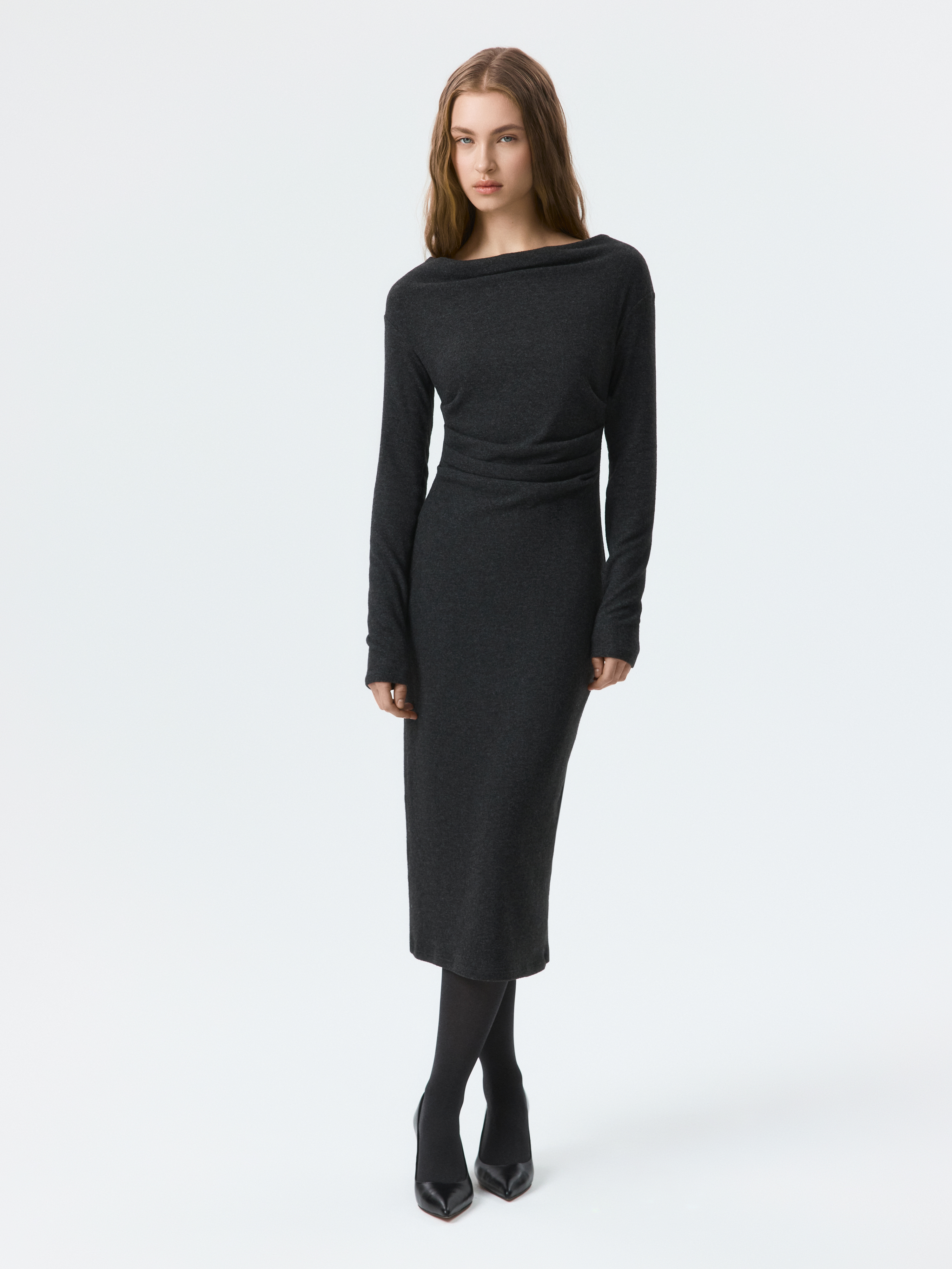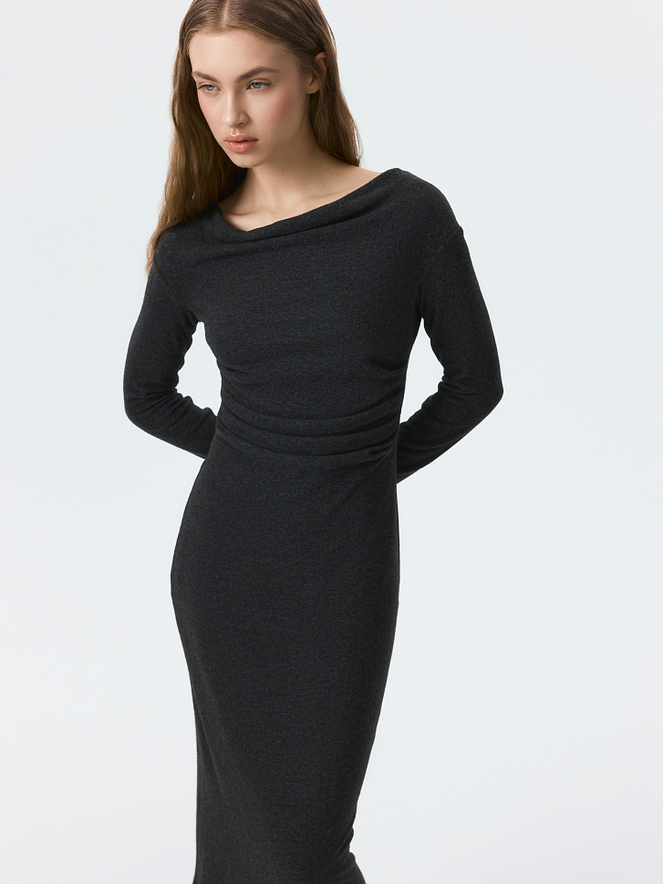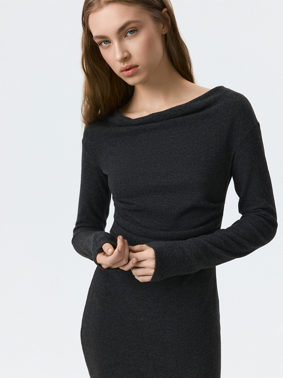 Платье с открытыми плечами находит баланс между комфортом и стильными трендами. Модель связали из плотной пряжи, которая мягко прилегает к телу и не колется даже без подкладки. Комплиментарный крой облегает силуэт и помогает подчеркнуть женственность.