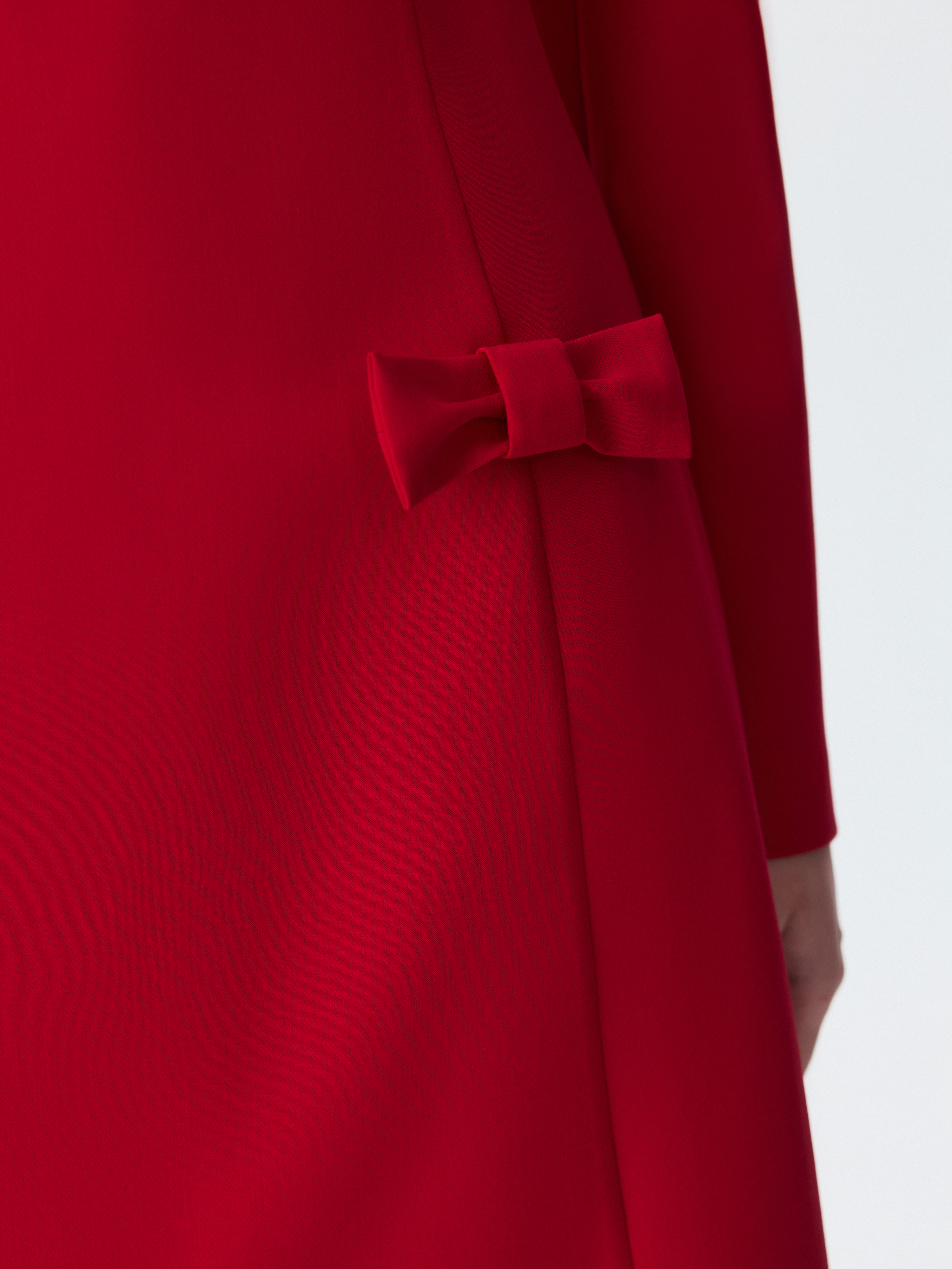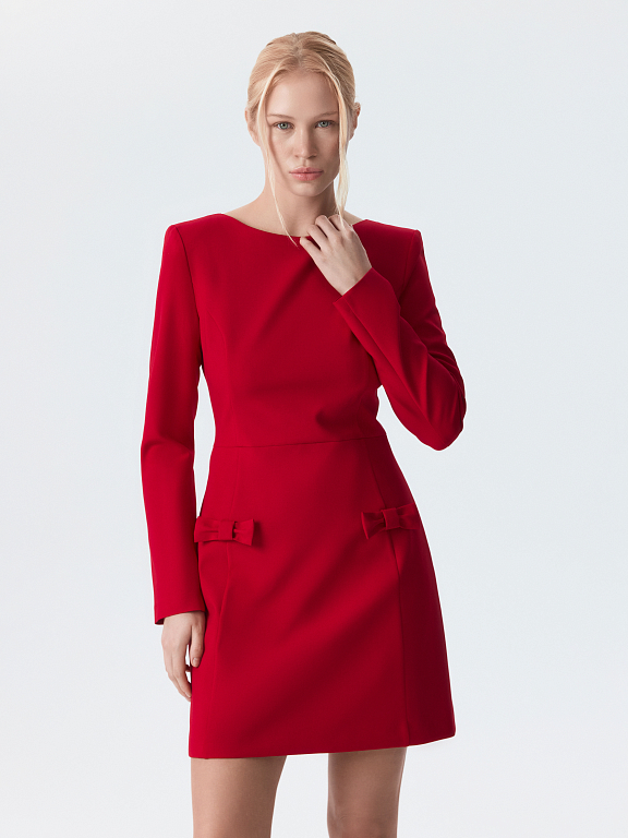 Платье-мини из костюмной ткани подойдет на каждый день и для особых случаев. Плотный текстиль из поливикозы не тянется и комфортно прилегает к телу благодаря гладкой подкладке. Подплечники подчеркивают строгость кроя, а декоративные бантики придают женственность.