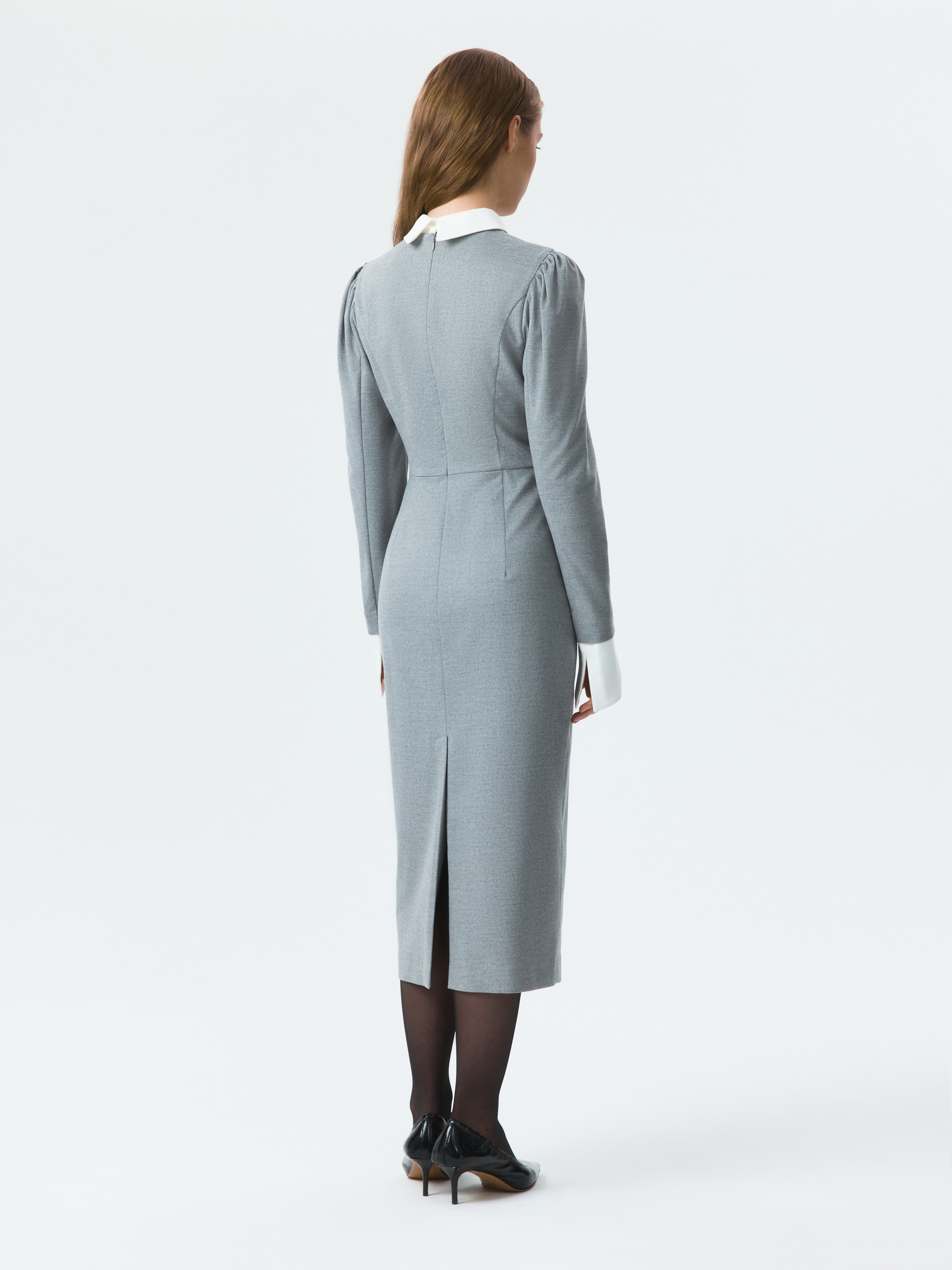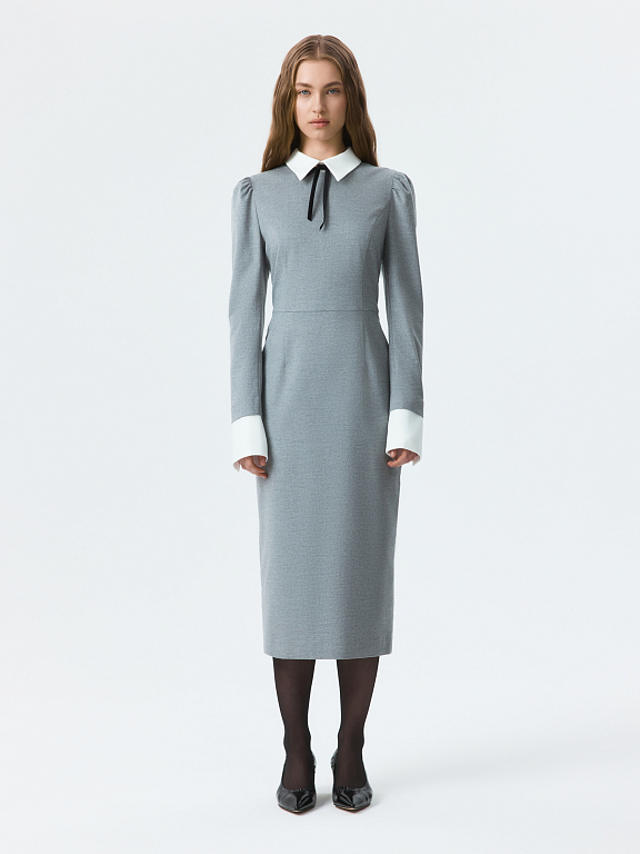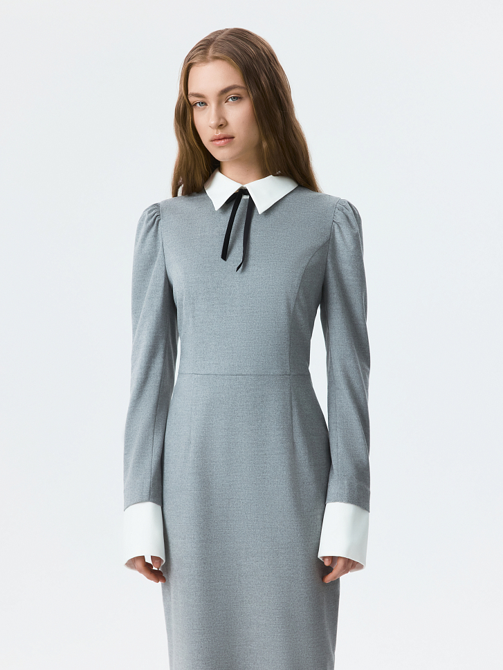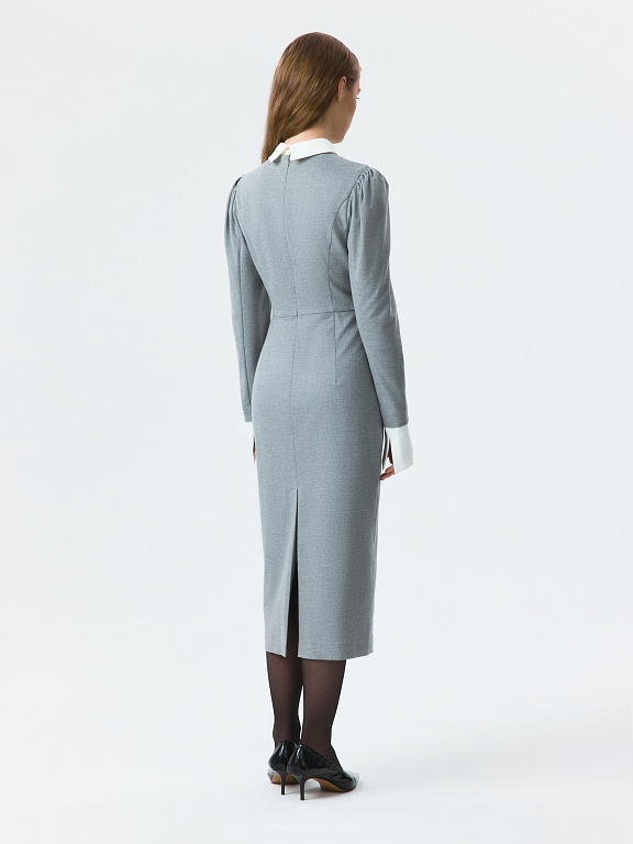 Платье-футляр в длине миди можно носить в офис или по особым поводам. Плотный костюмный текстиль из поливискозы не тянется и хорошо держит форму. Съемный воротник и манжеты из атласной ткани создают эффект многослойности.