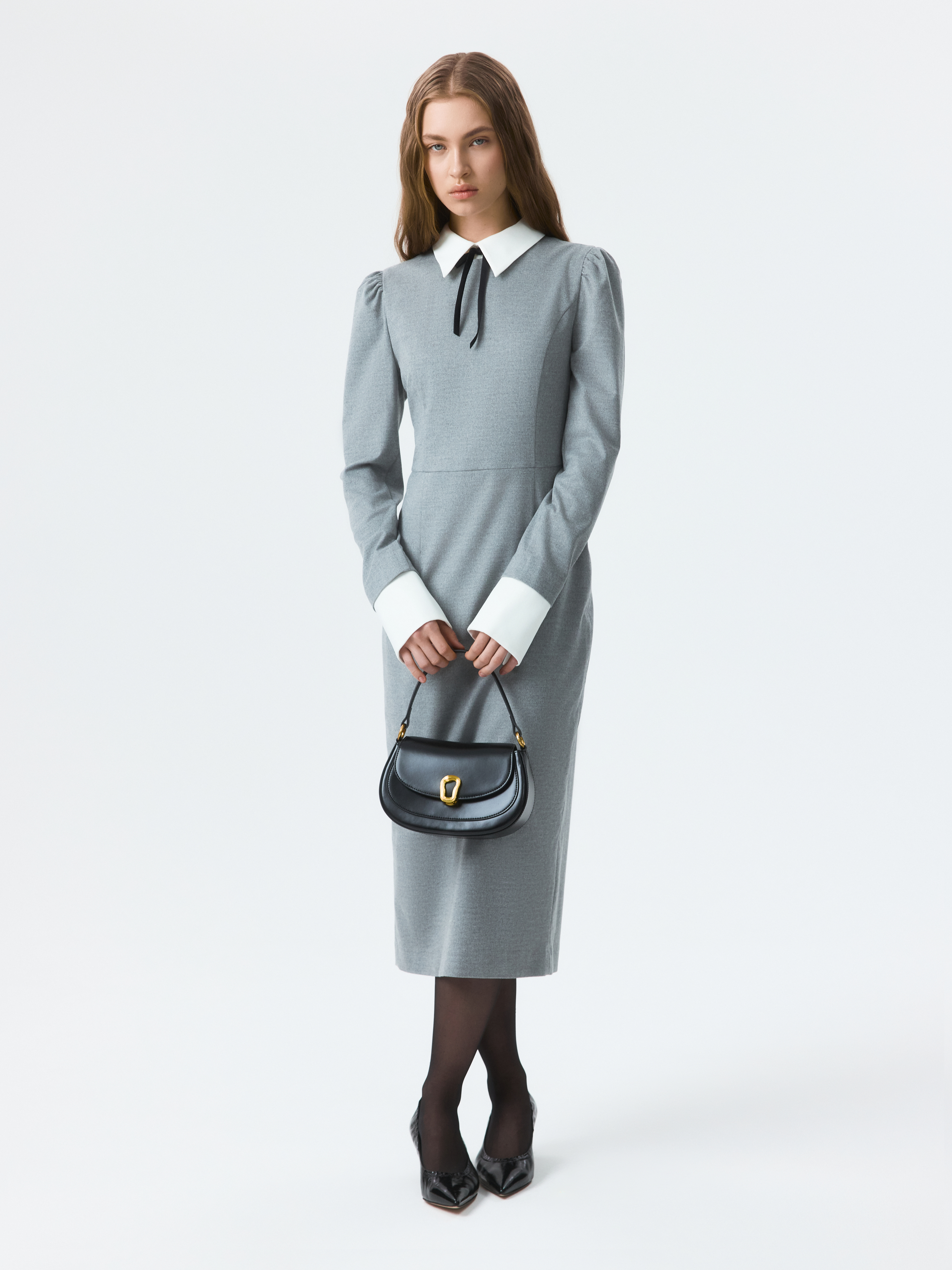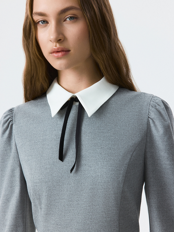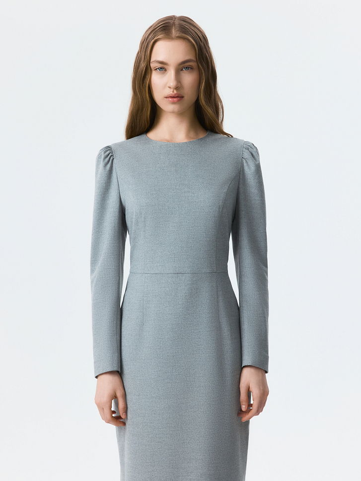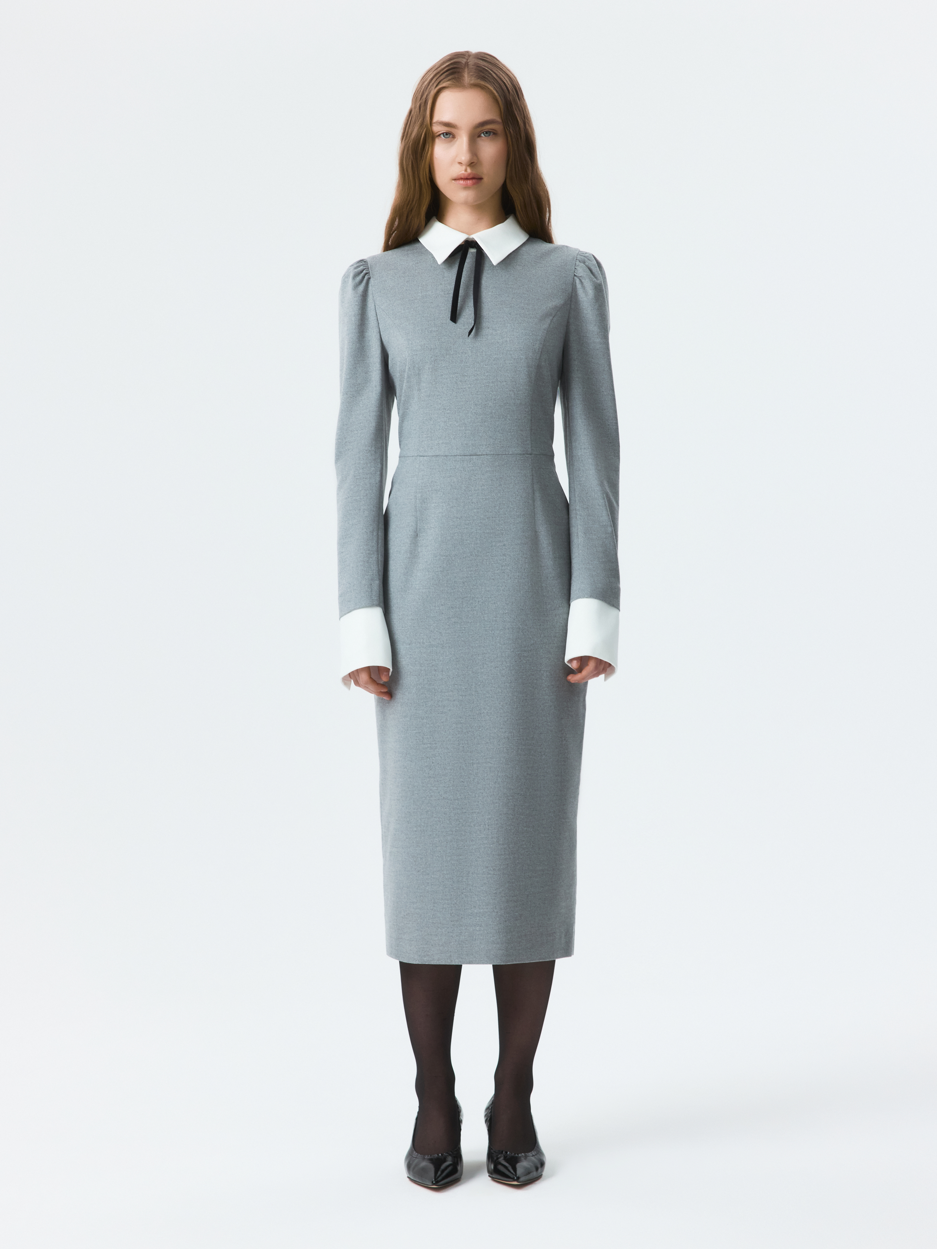 Платье-футляр в длине миди можно носить в офис или по особым поводам. Плотный костюмный текстиль из поливискозы не тянется и хорошо держит форму. Съемный воротник и манжеты из атласной ткани создают эффект многослойности.