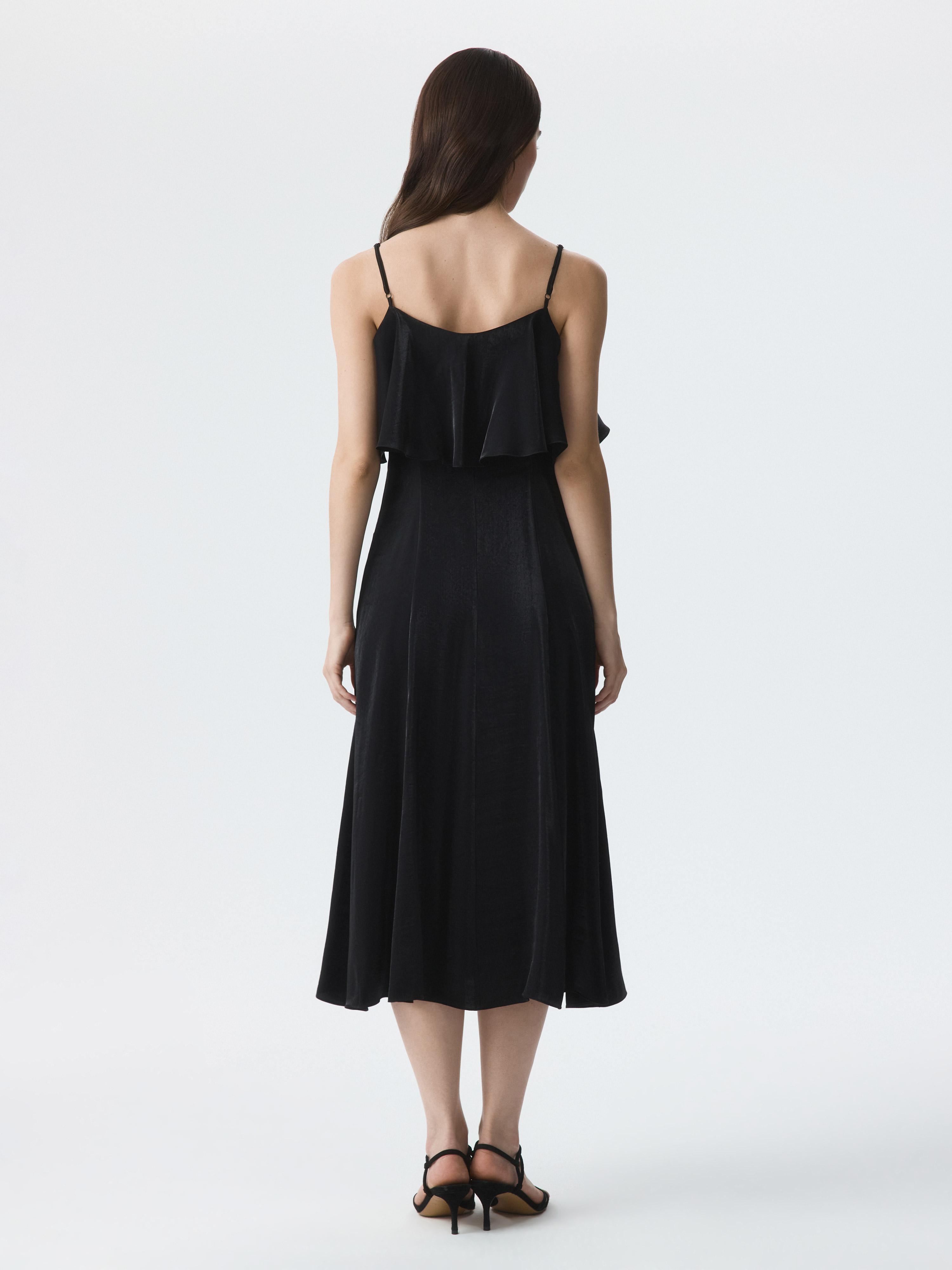 Элегантное атласное платье на тонких бретелях – эффектное решение для важных событий и вечерних выходов. В меру плотный материал из вискозы с гладкой на ощупь фактурой деликатно блестит и не просвечивает даже без подкладки.