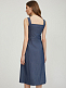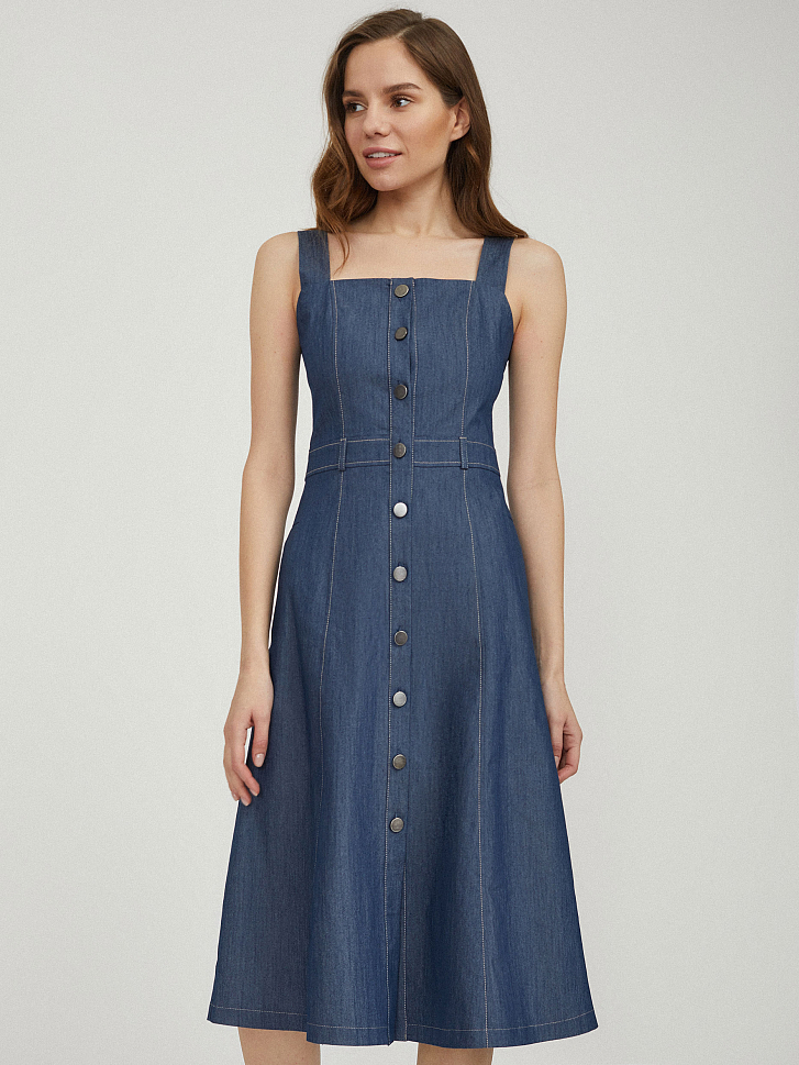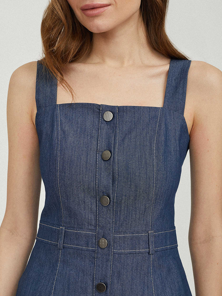 Сарафан приталенного кроя, выполненный из денима. Широкие бретели, квадратный вырез, контрастные швы, боковые карманы с отстрочкой. Застегивается на ряд пуговиц.