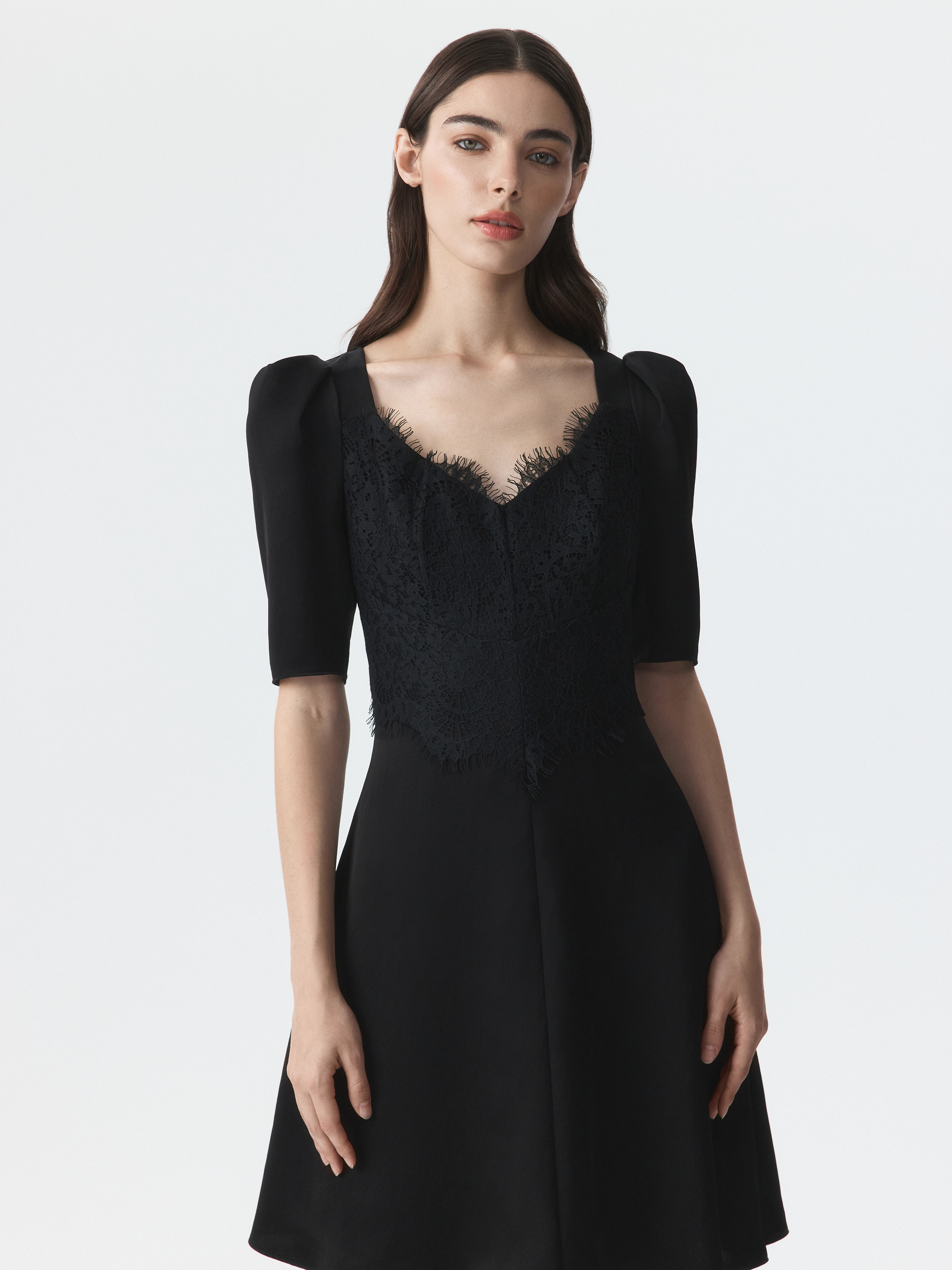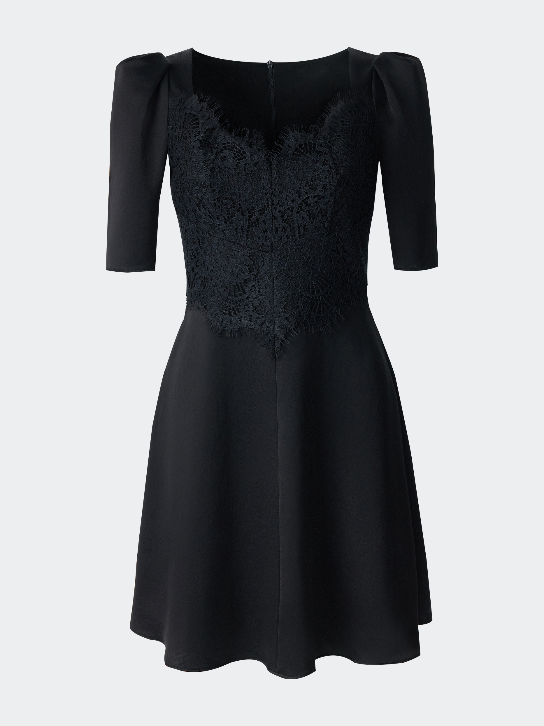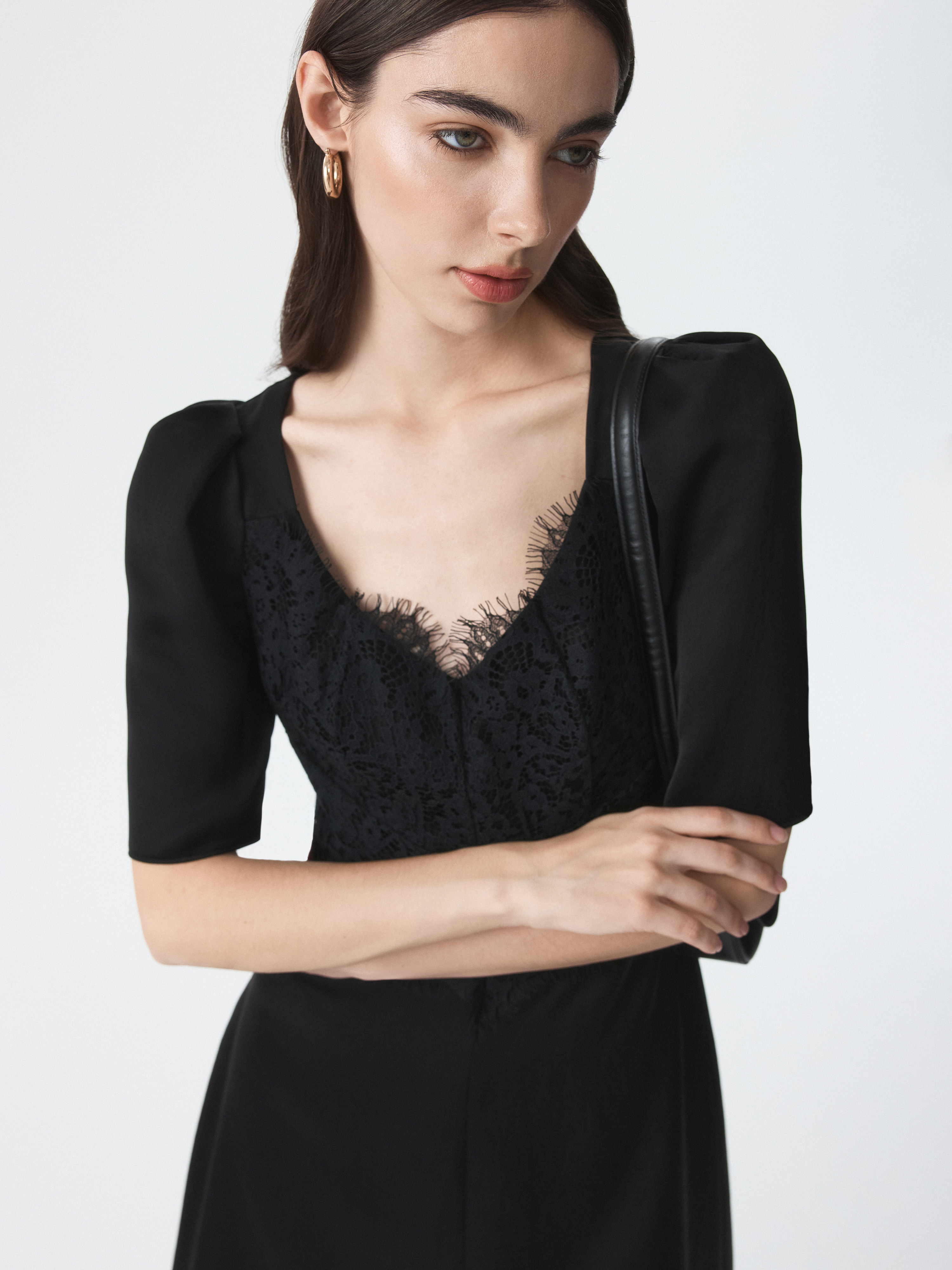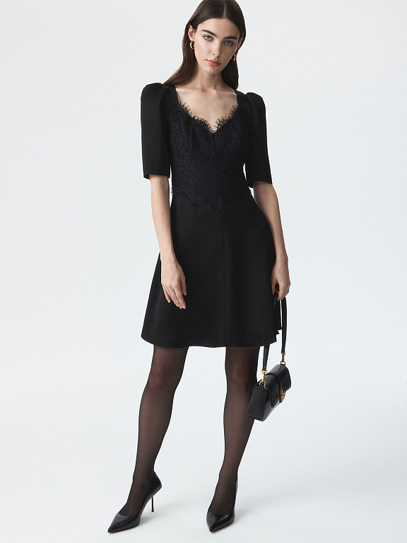 Расклешенное платье-мини из атласной ткани станет основой выразительного и романтичного образа. Гладкий шелковистый текстиль с приятной на ощупь фактурой струится вдоль тела и комфортно прилегает благодаря подкладке. Кружевной декор создает эффект корсета.